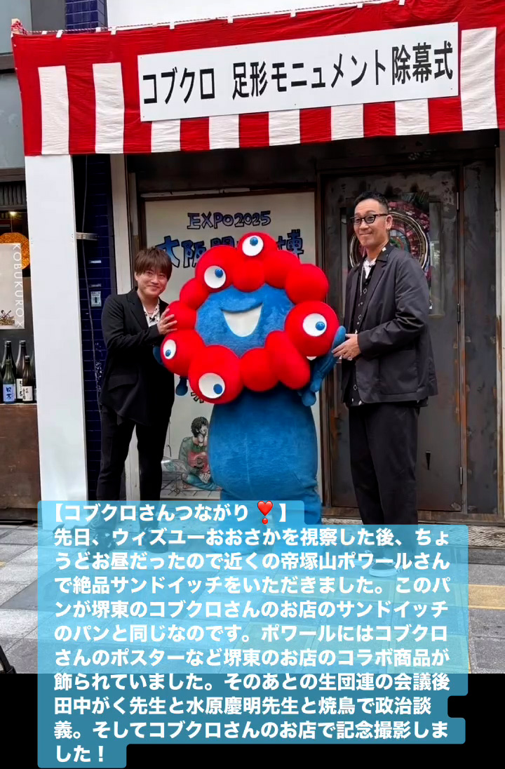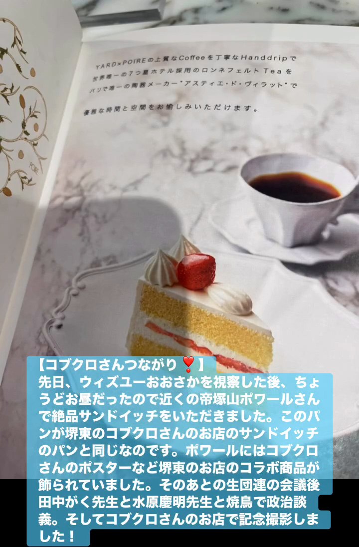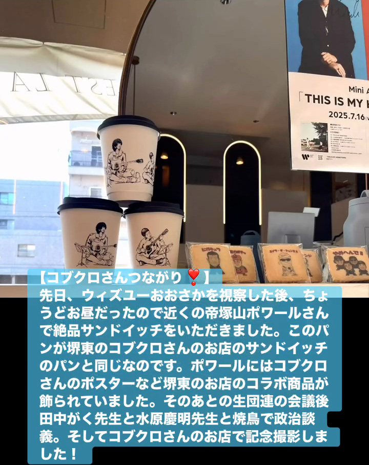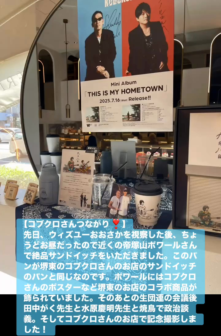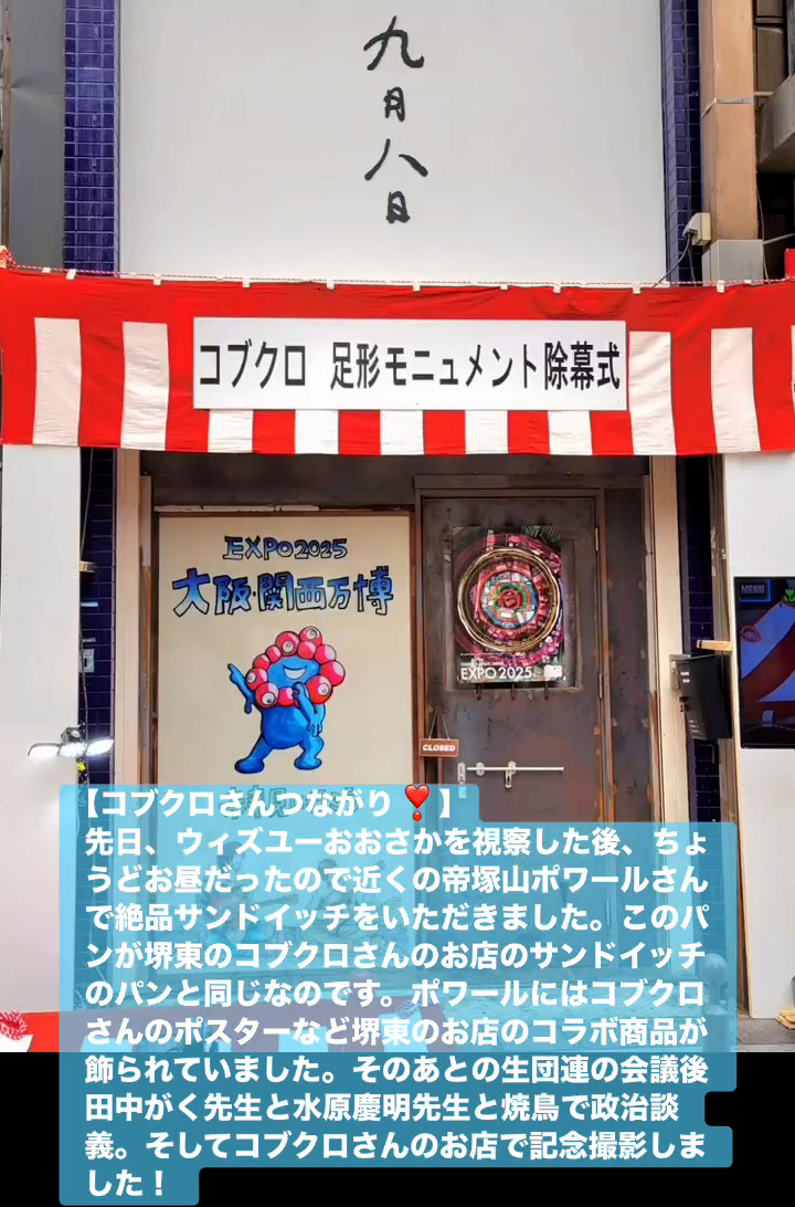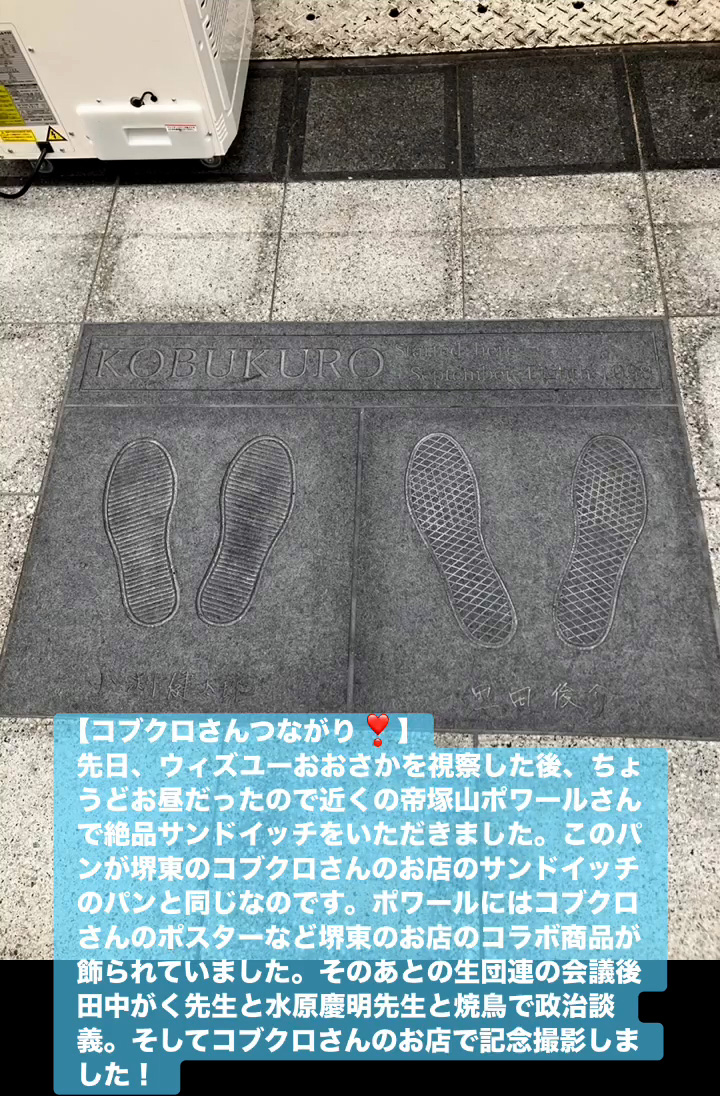 先日、ウィズユーおおさかを視察した後、ちょうどお昼だったので近くの帝塚山ポワールさんで絶品サンドイッチをいただきました。このパンが堺東のコブクロさんのお店のサンドイッチのパンと同じなのです。ポワールにはコブクロさんのポスターなど堺東のお店のコラボ商品が飾られていました。そのあとの生団運の会議後 田中がく先生と水原慶明先生と焼鳥で政治談義。そしてコブクロさんのお店で記念撮影しました!