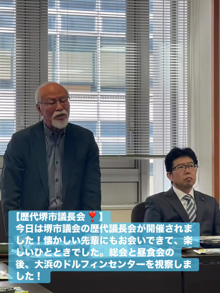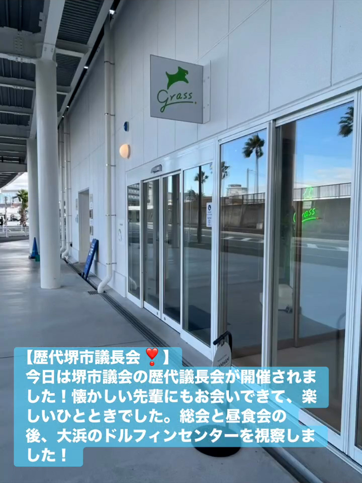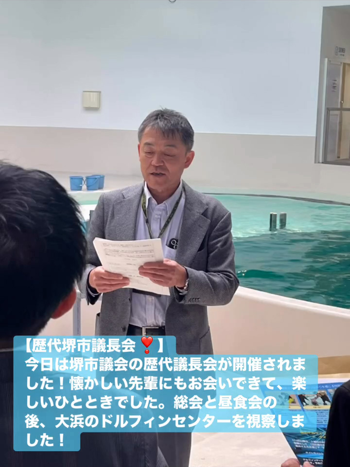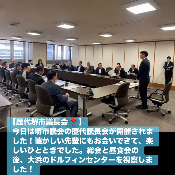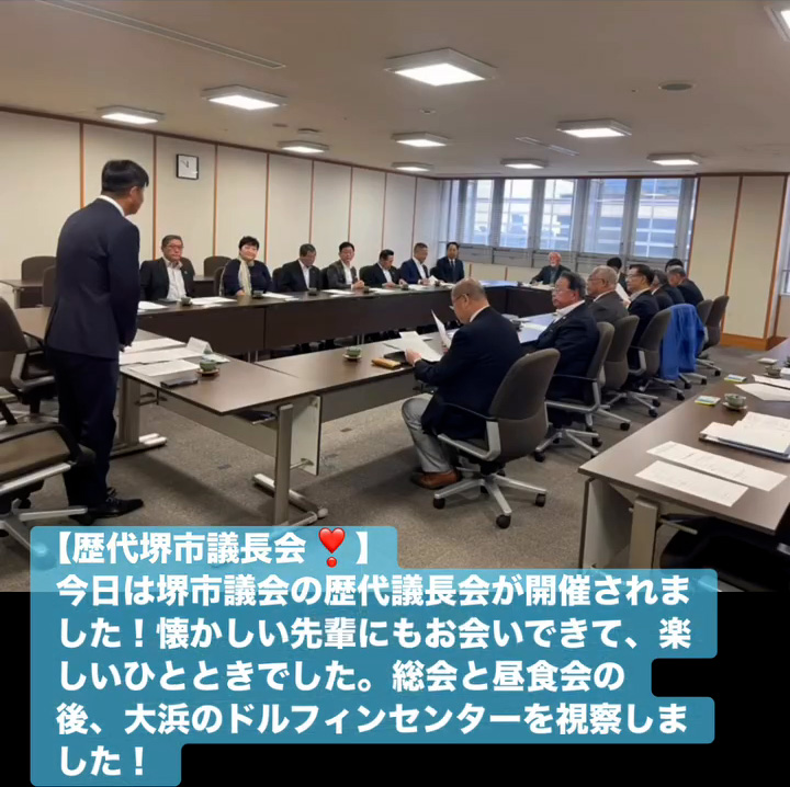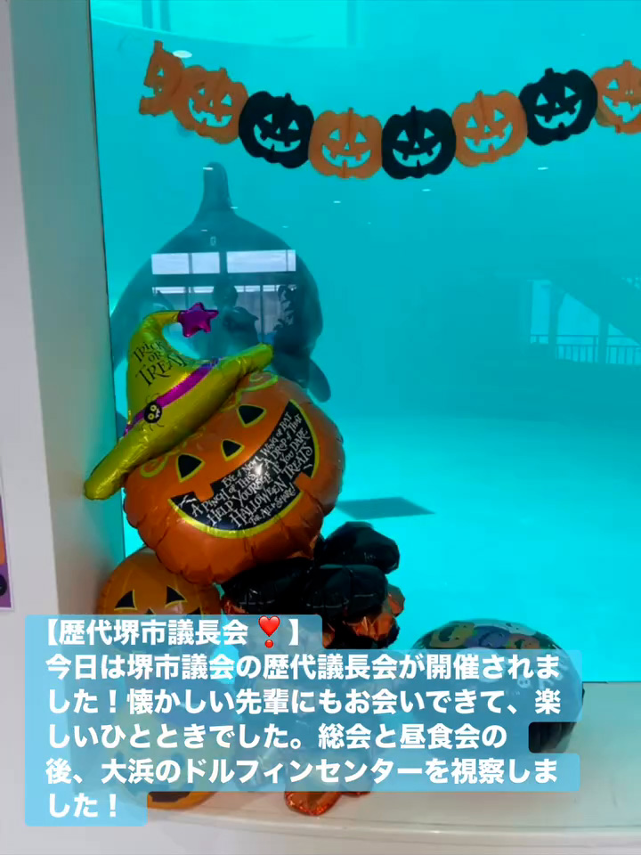 歴代堺市議長会 10月28日 Posted on 2025年10月28日 16:06:012025年10月29日 今日は堺市議会の歴代議長会が開催されました!懐かしい先輩にもお会いできて、楽しいひとときでした。総会と昼食会の後、大浜のドルフィンセンターを視察しました! のりこの活動日記