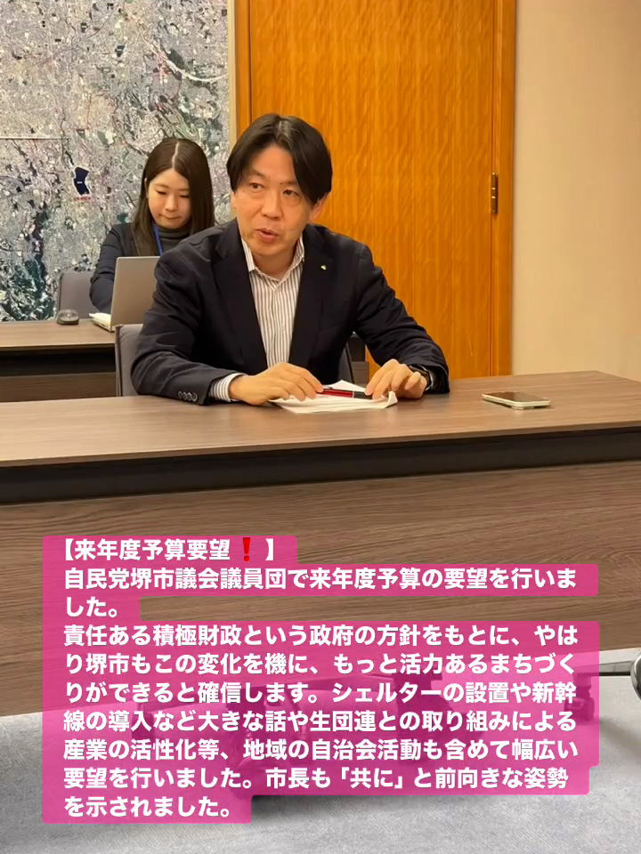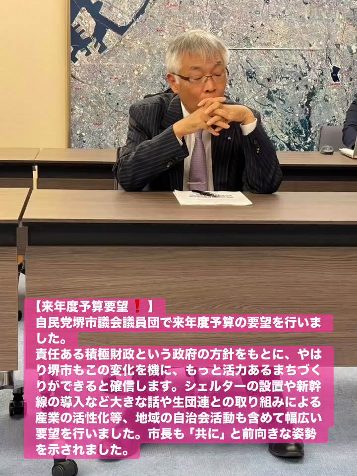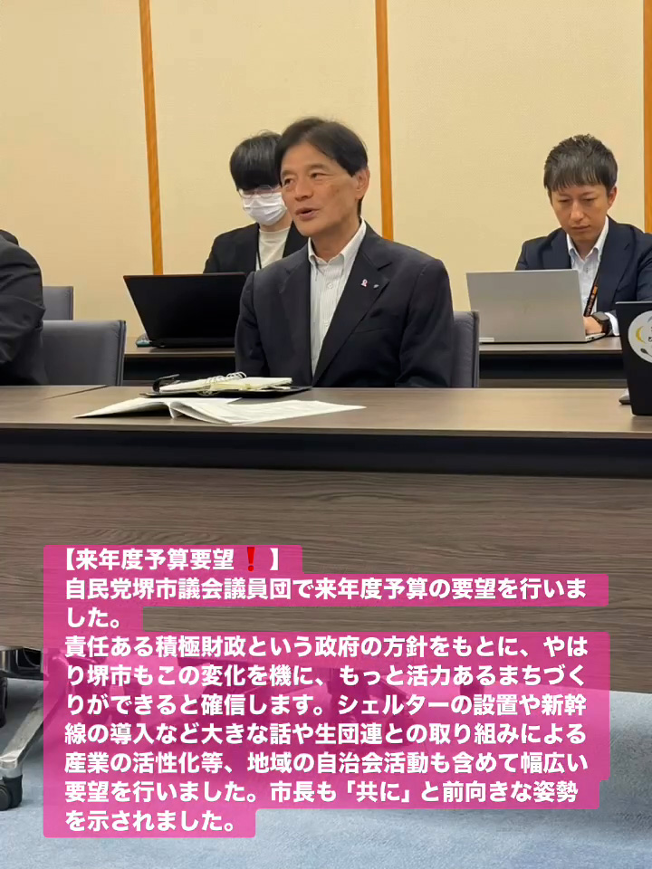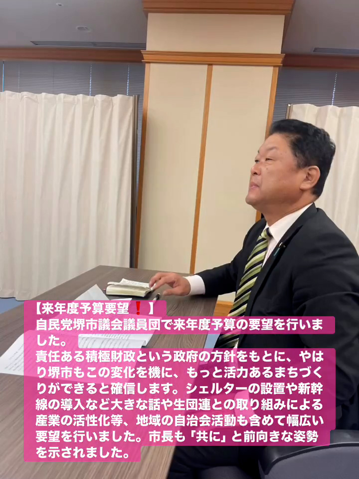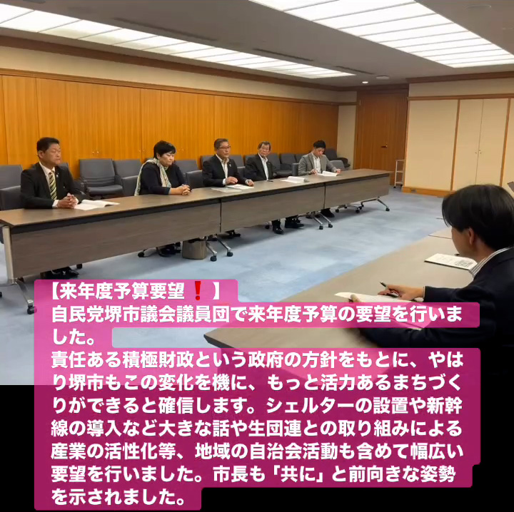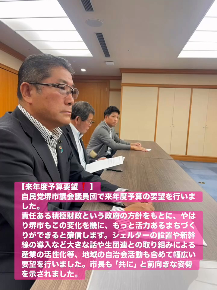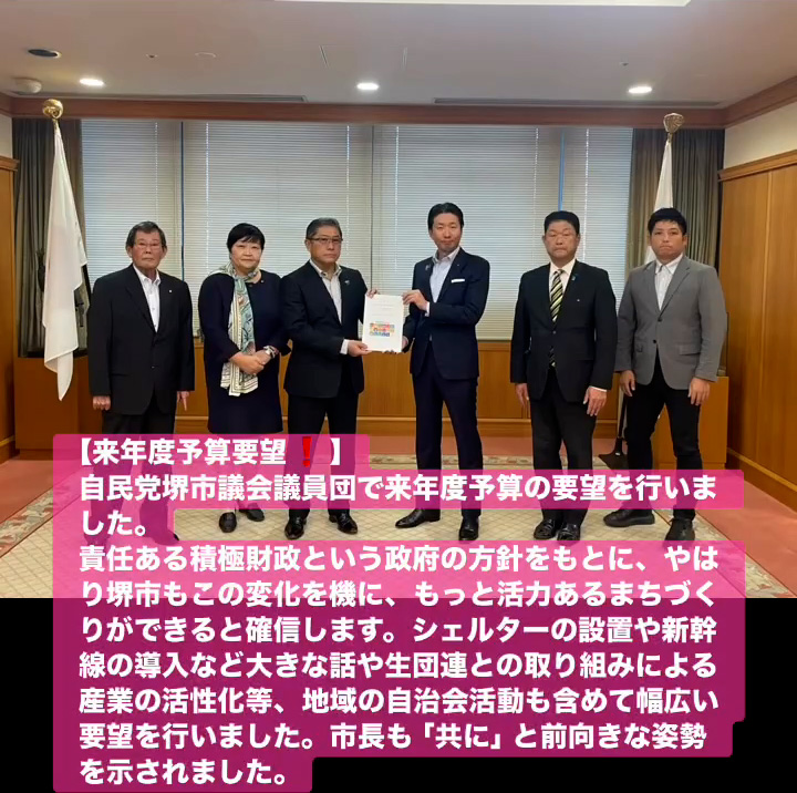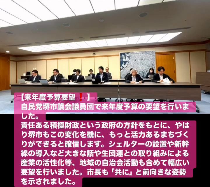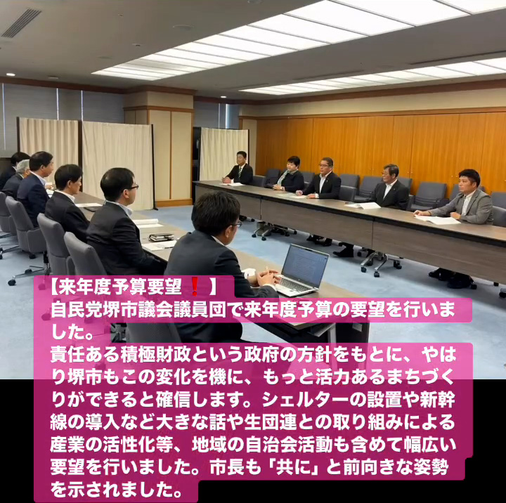 来年度予算要望! 10月28日 Posted on 2025年10月28日 17:07:022025年10月29日 自民党堺市議会議員団で来年度予算の要望を行いました。 責任ある積極財政という政府の方針をもとに、やはり堺市もこの変化を機に、もっと活力あるまちづくりができると確信します。シェルターの設置や新幹線の導入など大きな話や生団連との取り組みによる産業の活性化等、地域の自治会活動も含めて幅広い要望を行いました。市長も『共に』と前向きな姿勢を示されました。 のりこの活動日記, 自民党大阪