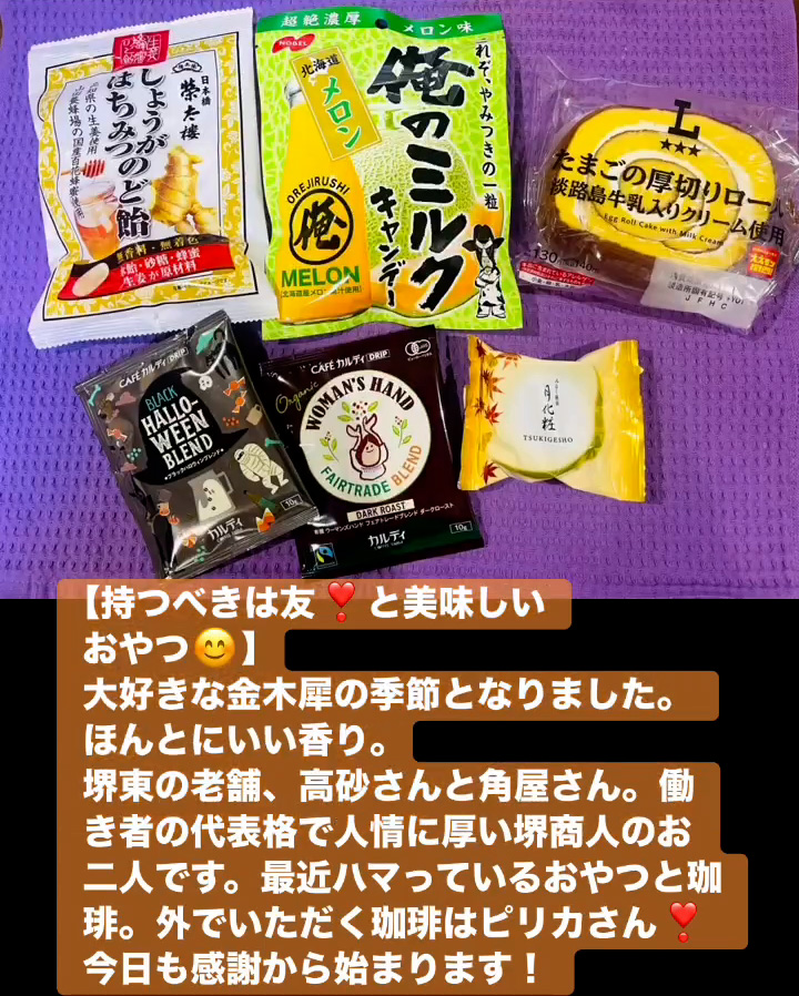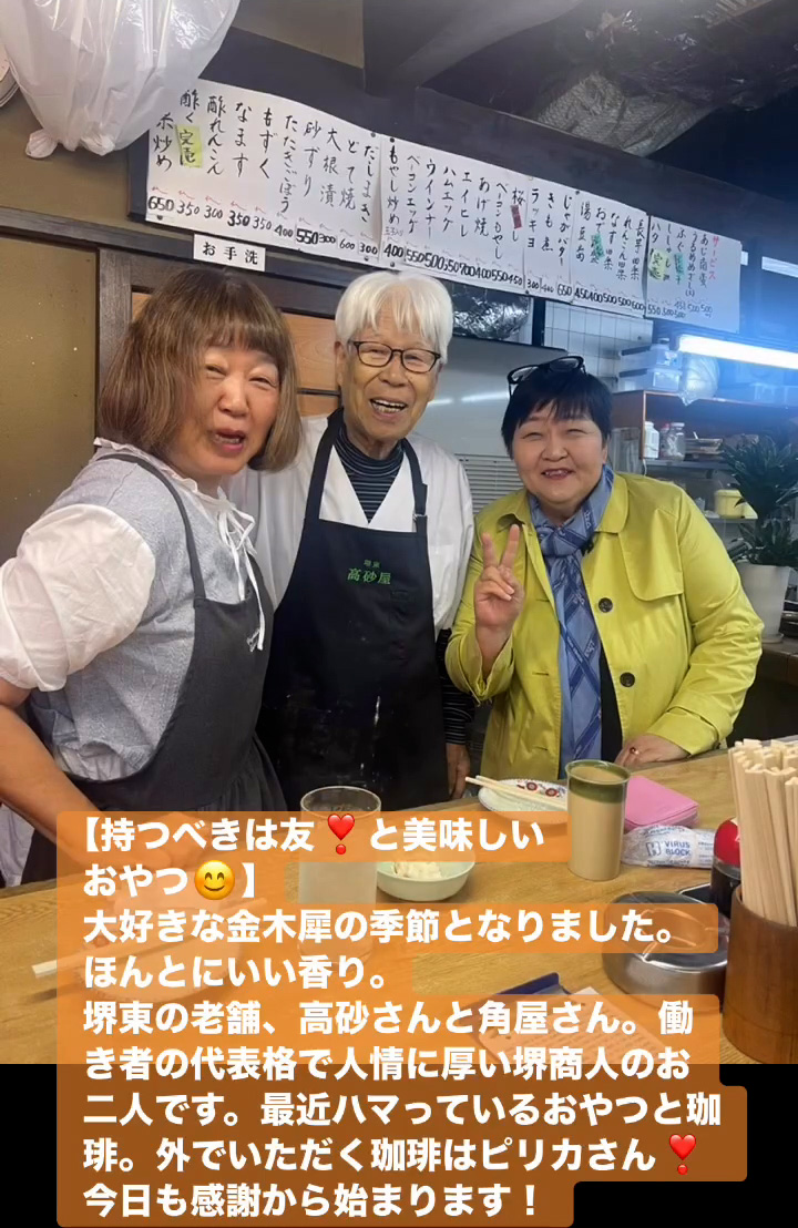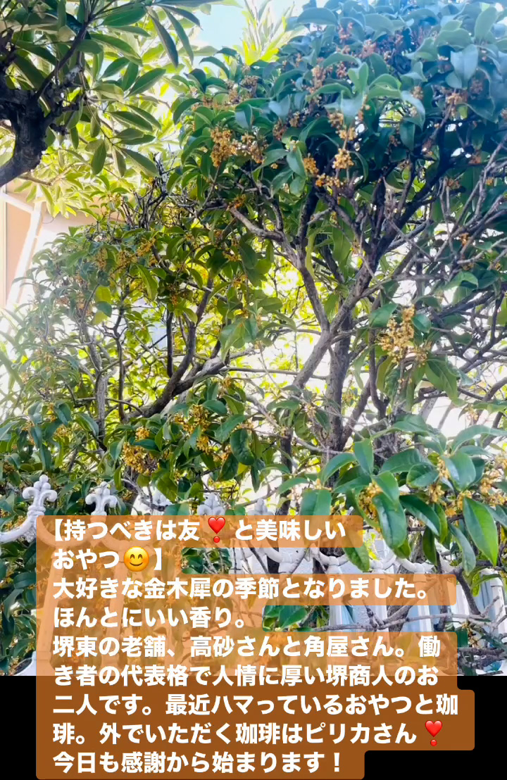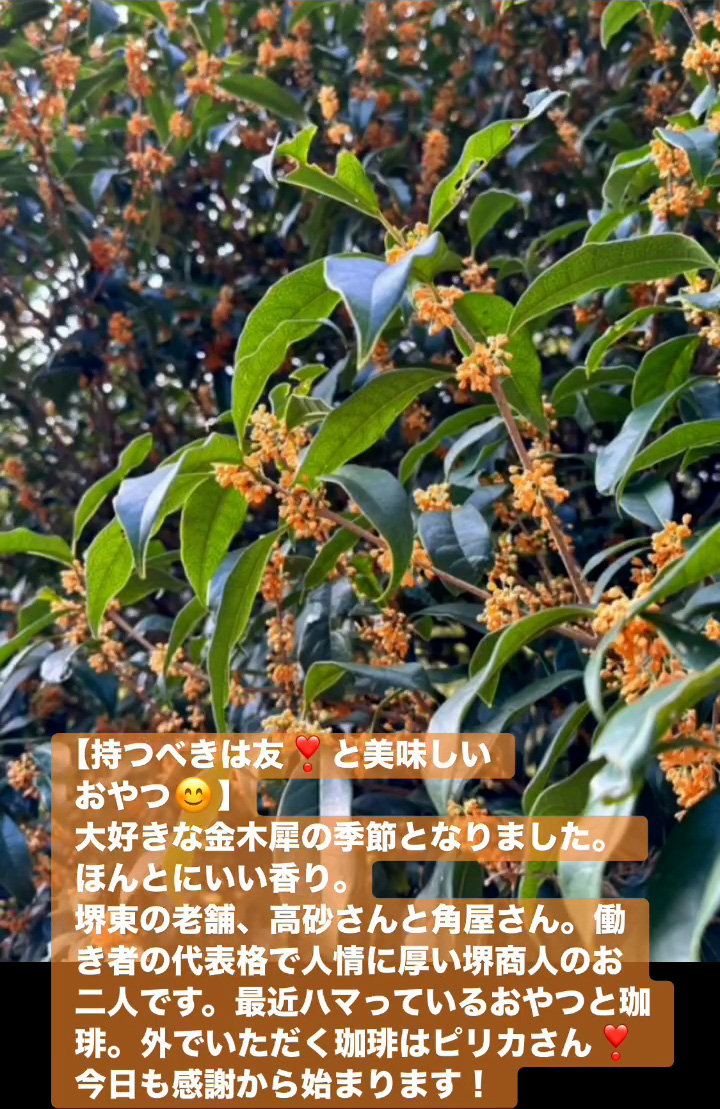持つべきは友 と美味しいおやつ 10月30日 Posted on 2025年10月30日 09:58:012025年10月31日 大好きな金木犀の季節となりました。ほんとにいい香り。 堺東の老舗、 高砂さんと角屋さん。働き者の代表格で人情に厚い堺商人のお二人です。 最近ハマっているおやつと珈琲。 外でいただく珈琲はピリカさん❣今日も感謝から始まります! のりこの活動日記, のりこの部屋