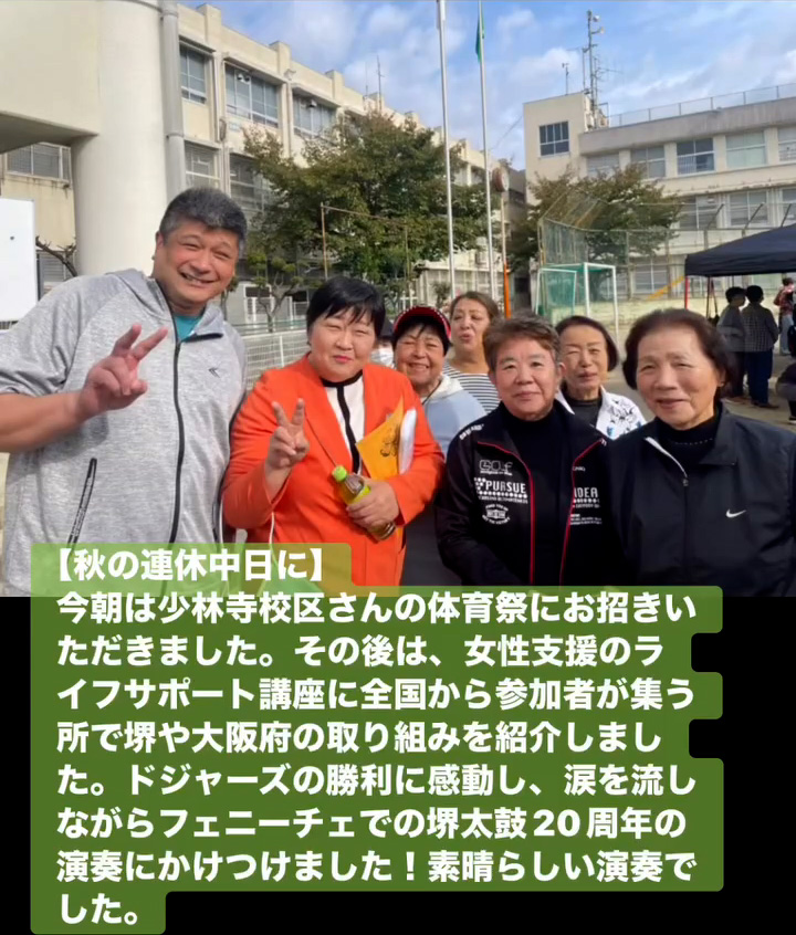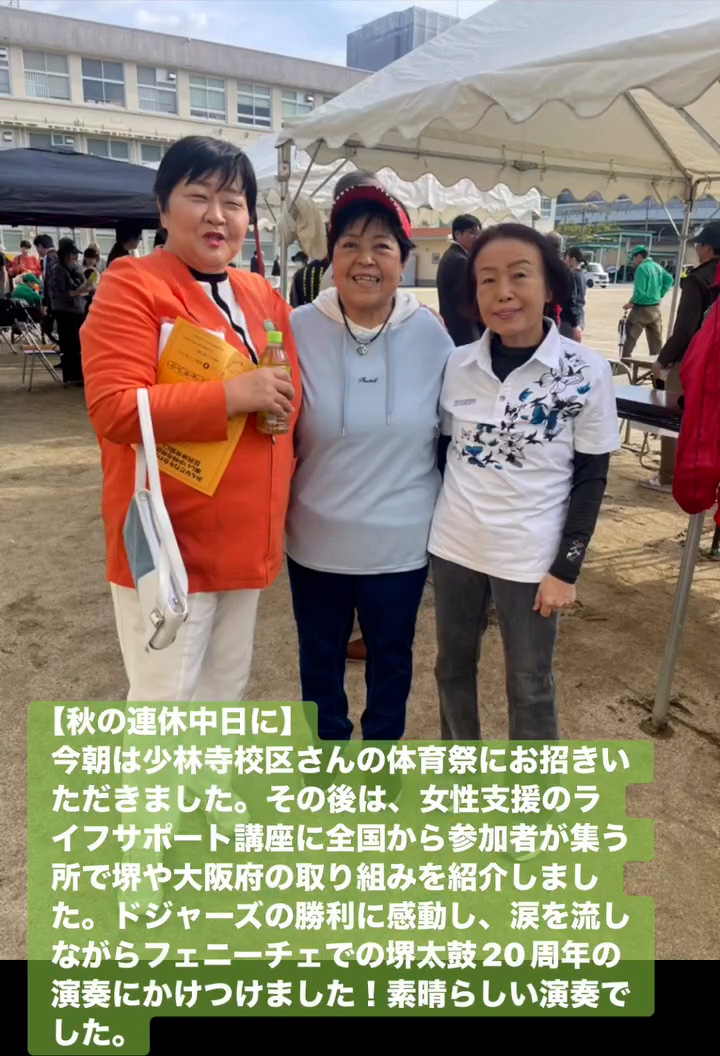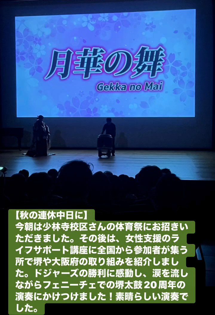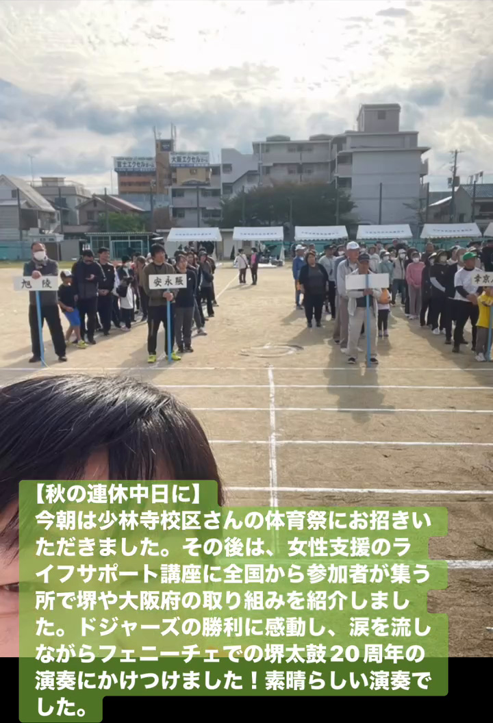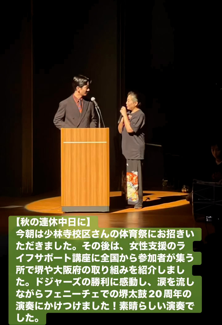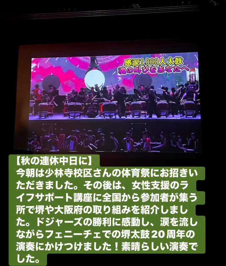 今朝は少林寺校区さんの体育祭にお招きいただきました。その後は、女性支援のライフサポー ト講座に全国から参加者が集う所で堺や大阪府の取り組みを紹介しました。ドジャースの勝利に感動し、涙を流しながらフェニーチェでの堺太鼓20周年の演奏にかけつけました!素晴らしい演奏でした。