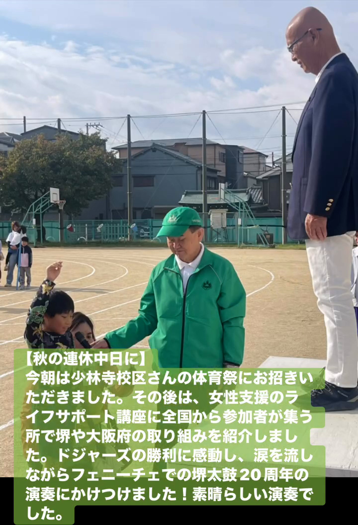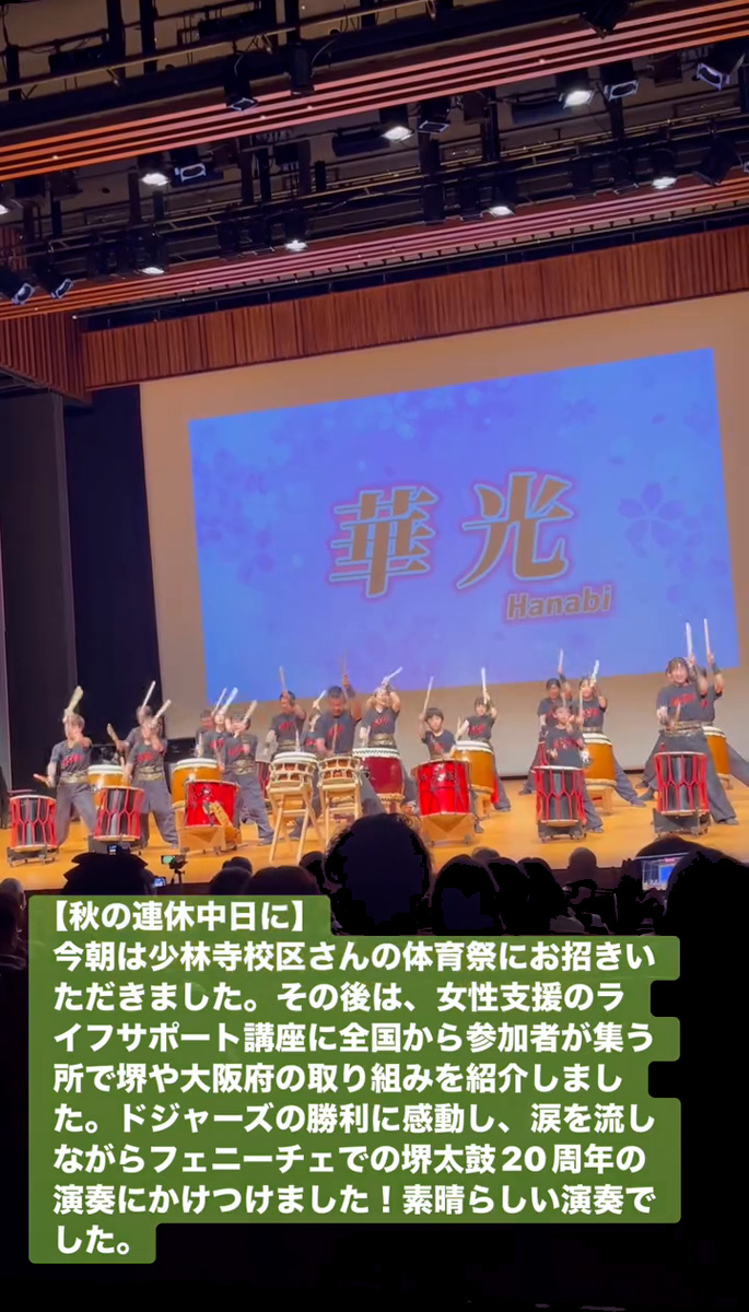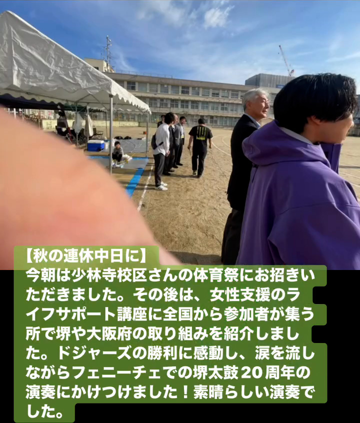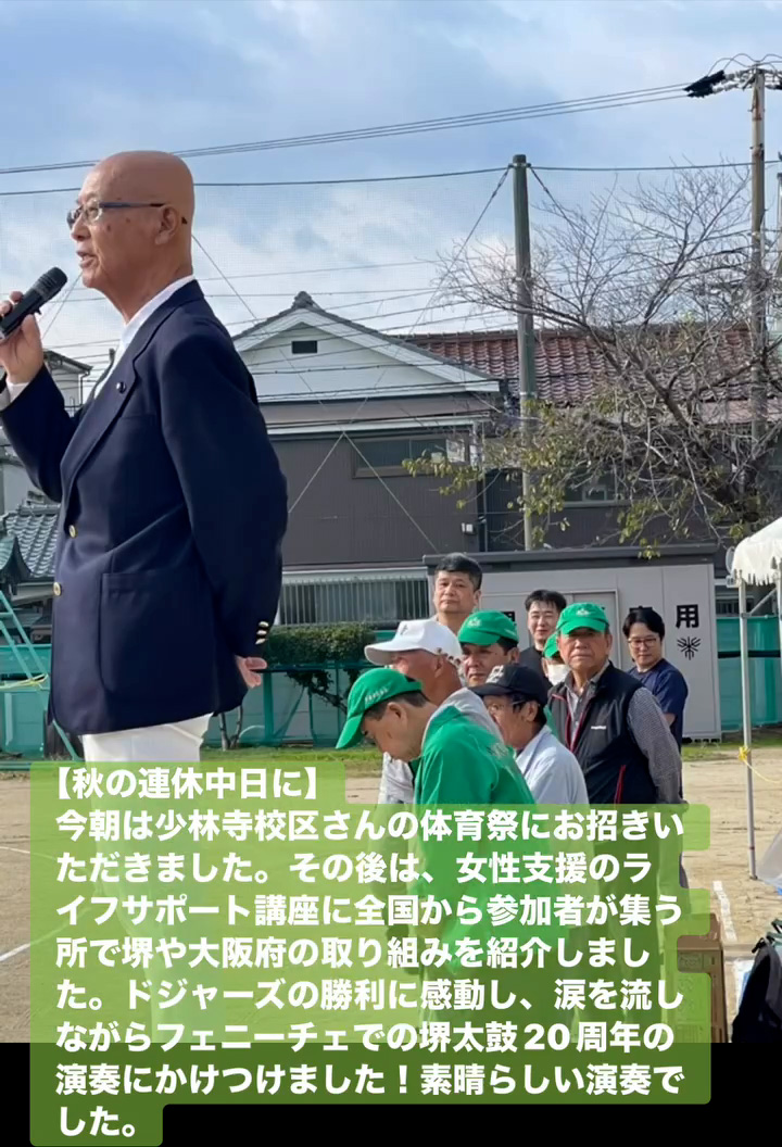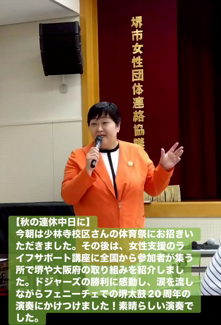 今朝は少林寺校区さんの体育祭にお招きいただきました。その後は、女性支援のライフサポー ト講座に全国から参加者が集う所で堺や大阪府の取り組みを紹介しました。ドジャースの勝利に感動し、涙を流しながらフェニーチェでの堺太鼓20周年の演奏にかけつけました!素晴らしい演奏でした。