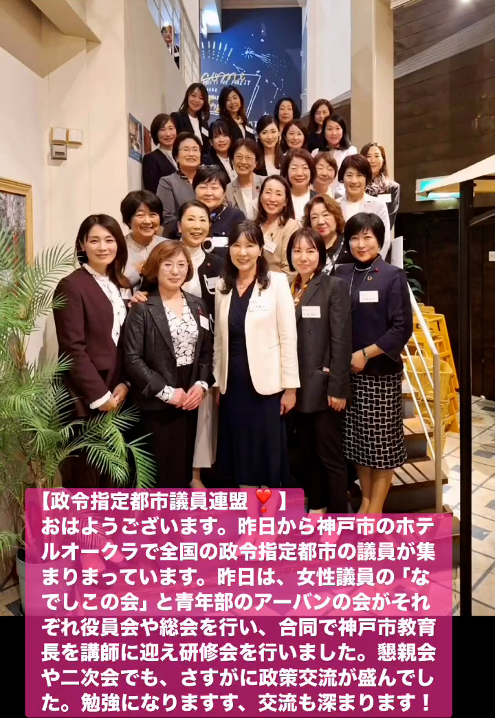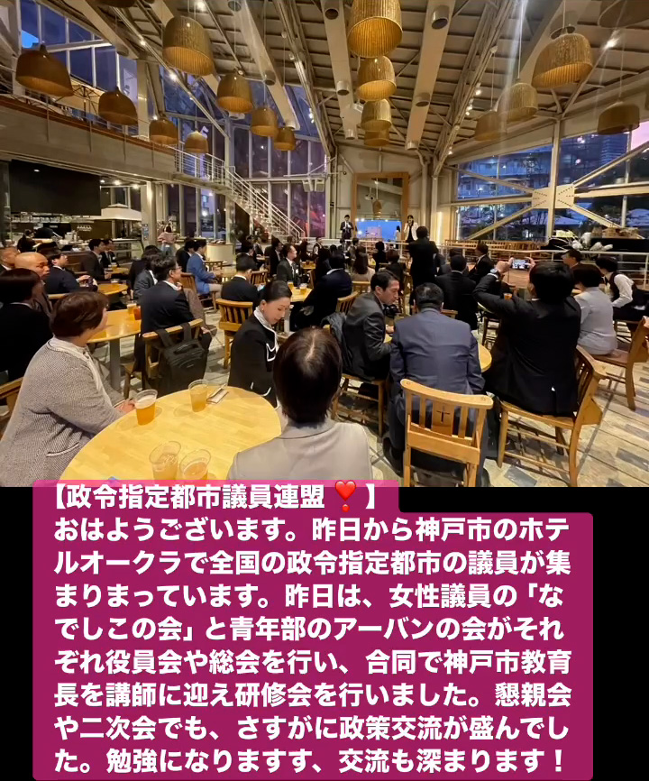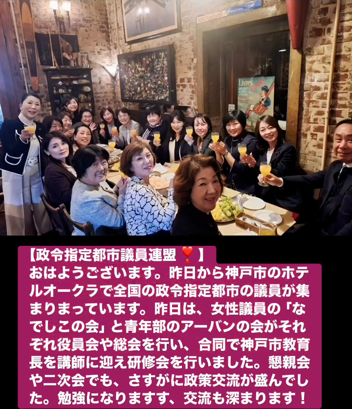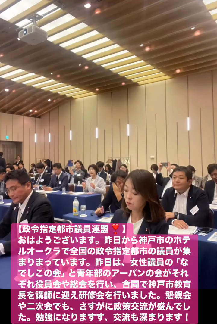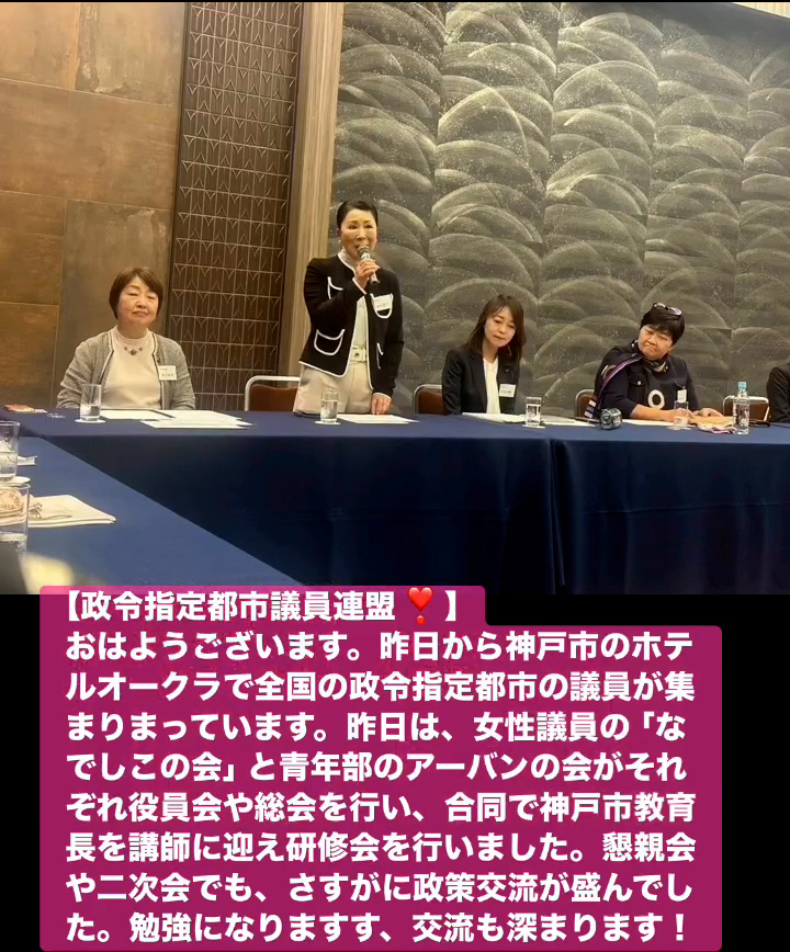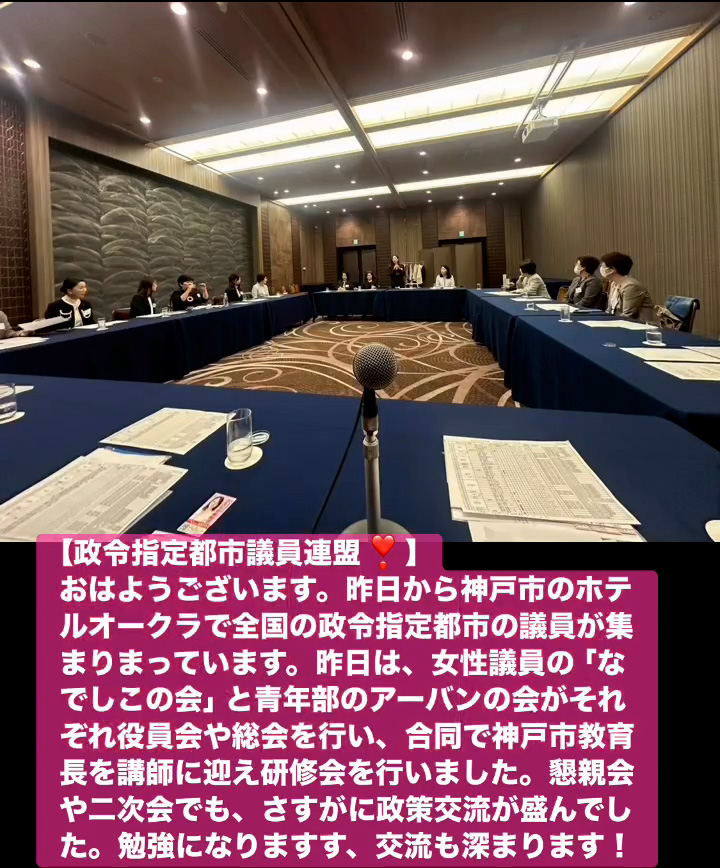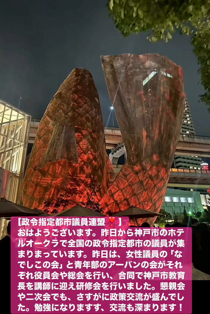 おはようこざいます。昨日から神戸市のホテルオークラで全国の政令指定都市の議員が集まっています。昨日は、女性議員のなでしこの会』と青年部のアーバンの会がそれぞれ役員会や総会を行い、合同で神戸市教育長を講師に迎え研修会を行いました。懇親会や二次会でも、さすがに政策交流が盛んでした。勉強になります、交流も深まります!