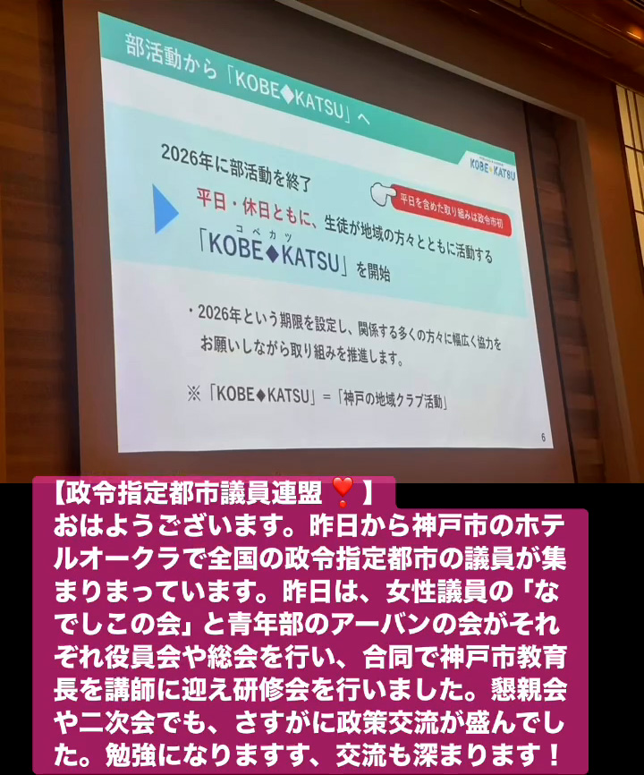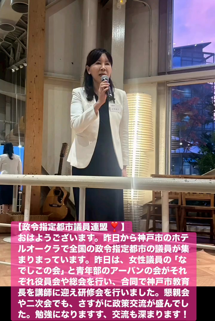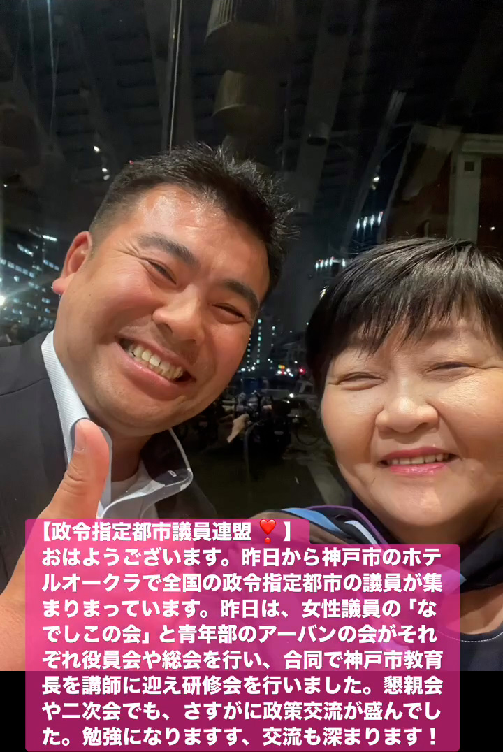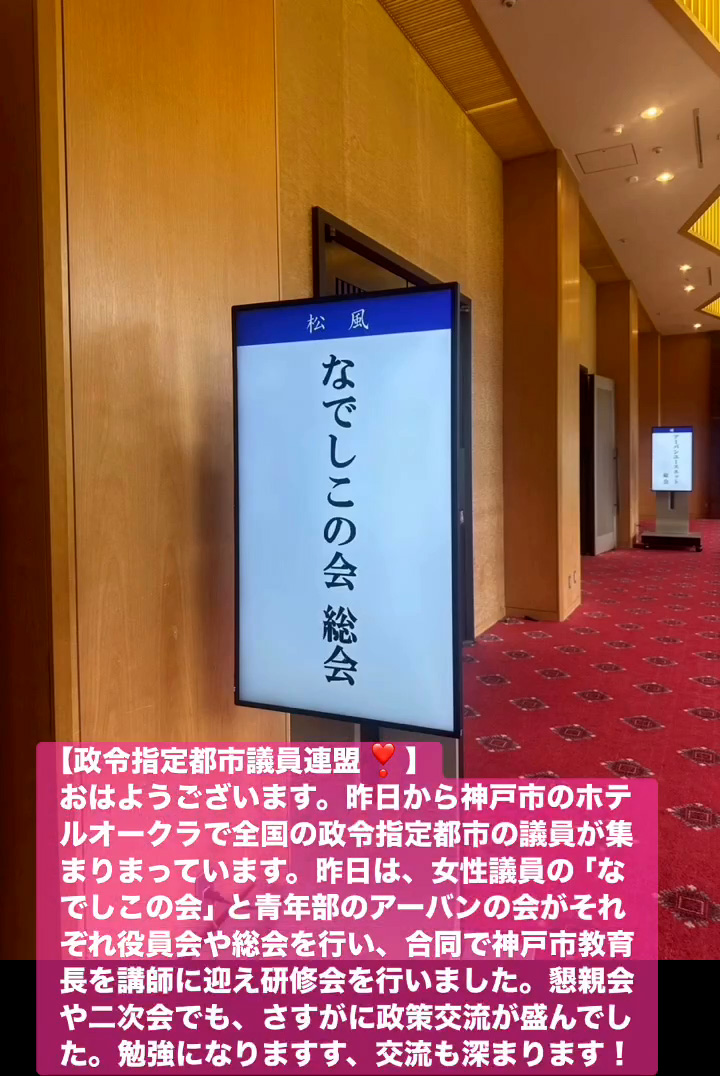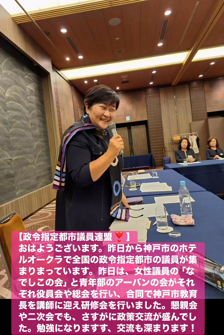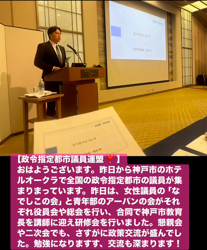 おはようこざいます。昨日から神戸市のホテルオークラで全国の政令指定都市の議員が集まっています。昨日は、女性議員のなでしこの会』と青年部のアーバンの会がそれぞれ役員会や総会を行い、合同で神戸市教育長を講師に迎え研修会を行いました。懇親会や二次会でも、さすがに政策交流が盛んでした。勉強になります、交流も深まります!