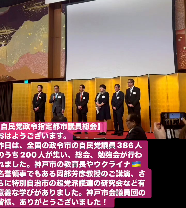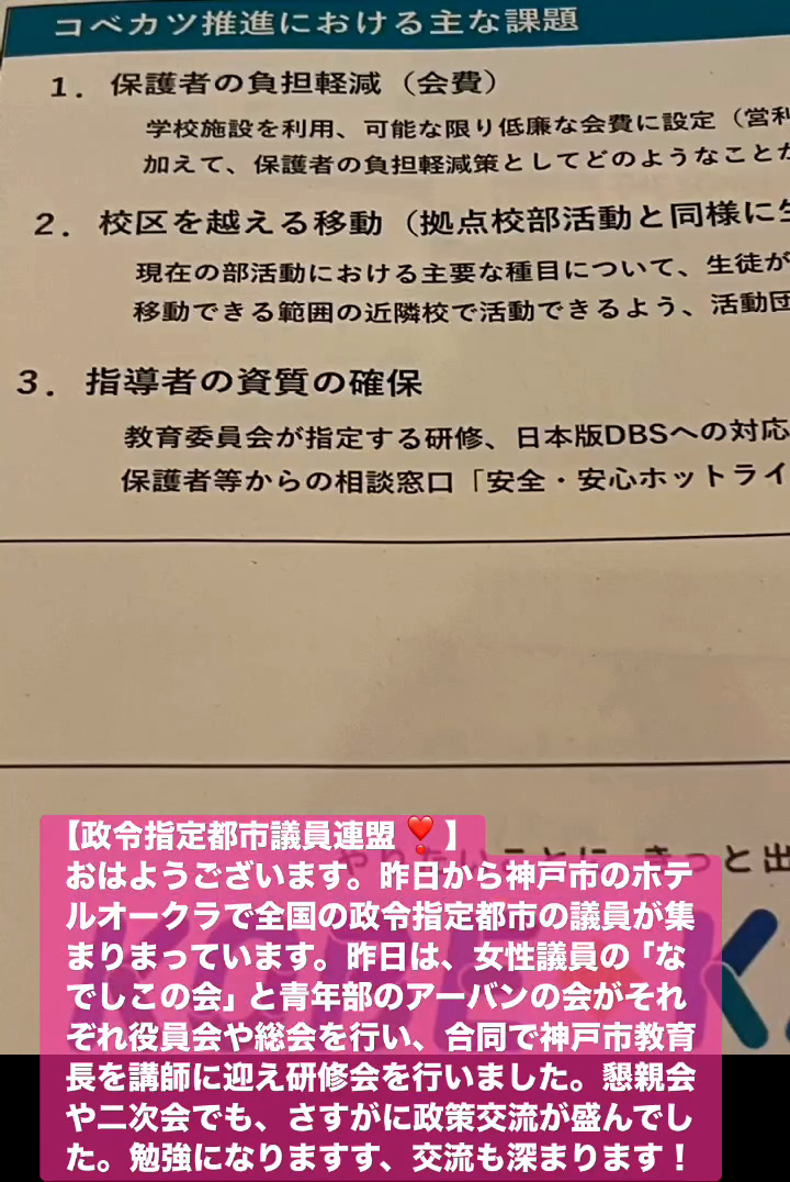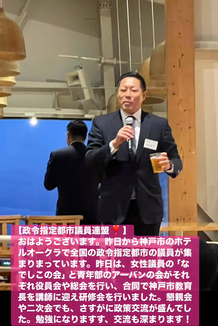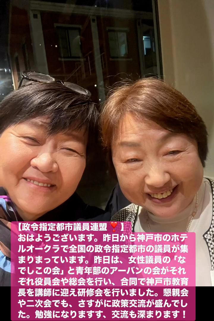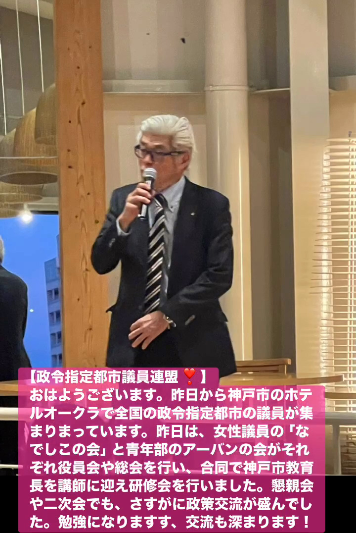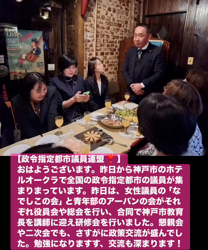 おはようこざいます。昨日から神戸市のホテルオークラで全国の政令指定都市の議員が集まっています。昨日は、女性議員のなでしこの会』と青年部のアーバンの会がそれぞれ役員会や総会を行い、合同で神戸市教育長を講師に迎え研修会を行いました。懇親会や二次会でも、さすがに政策交流が盛んでした。勉強になります、交流も深まります!