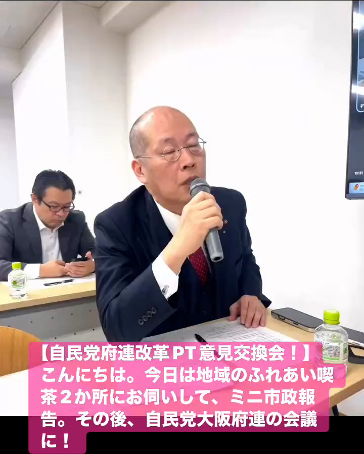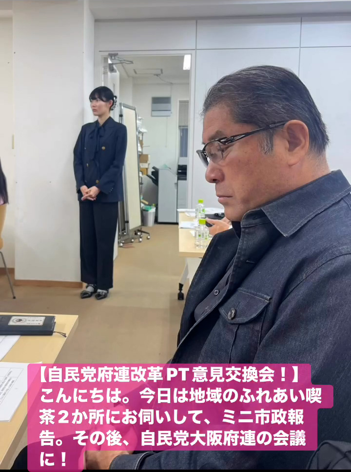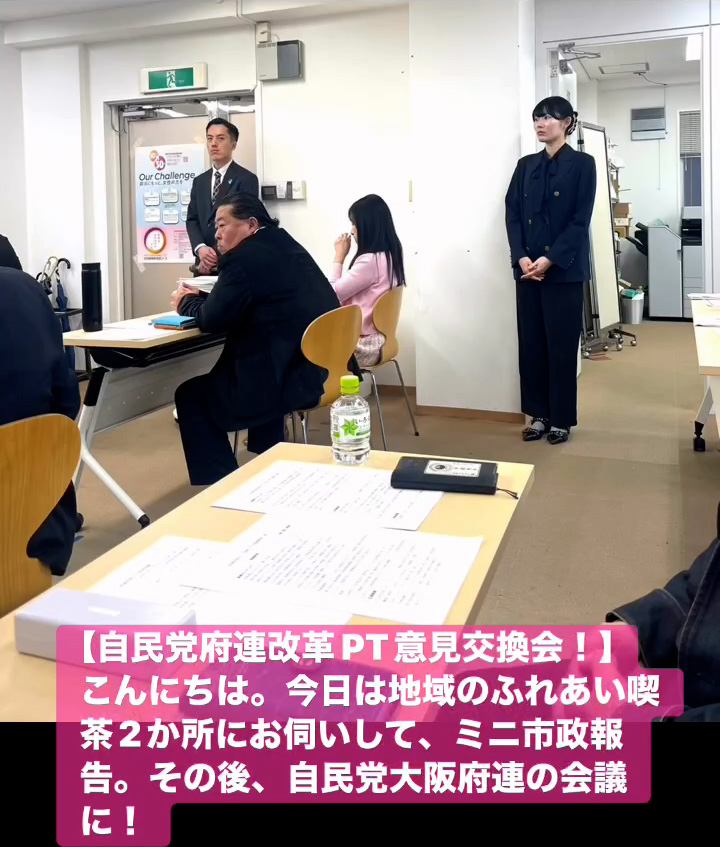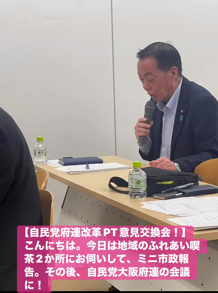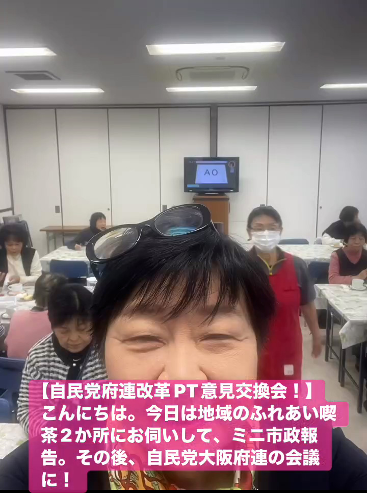自民党府連改革PT意見交換会! 11月8日 Posted on 2025年11月8日 13:55:022025年11月10日 こんにちは。今日は地域のふれあい喫茶2か所にお伺いして、ミニ市政報告。その後、自民党大阪府連の会議に! のりこの活動日記, 自民党大阪