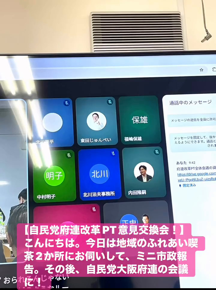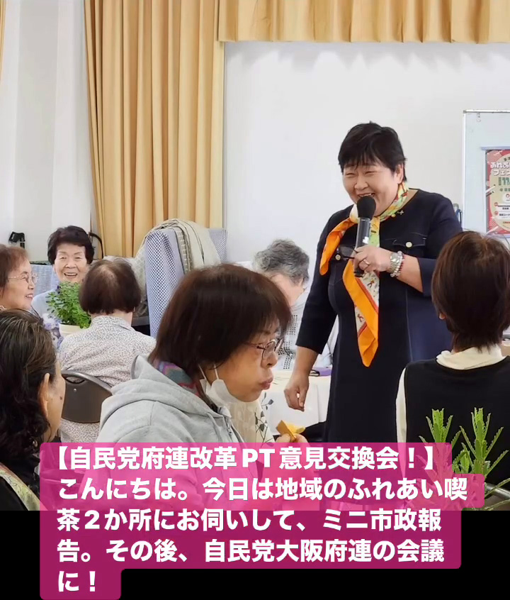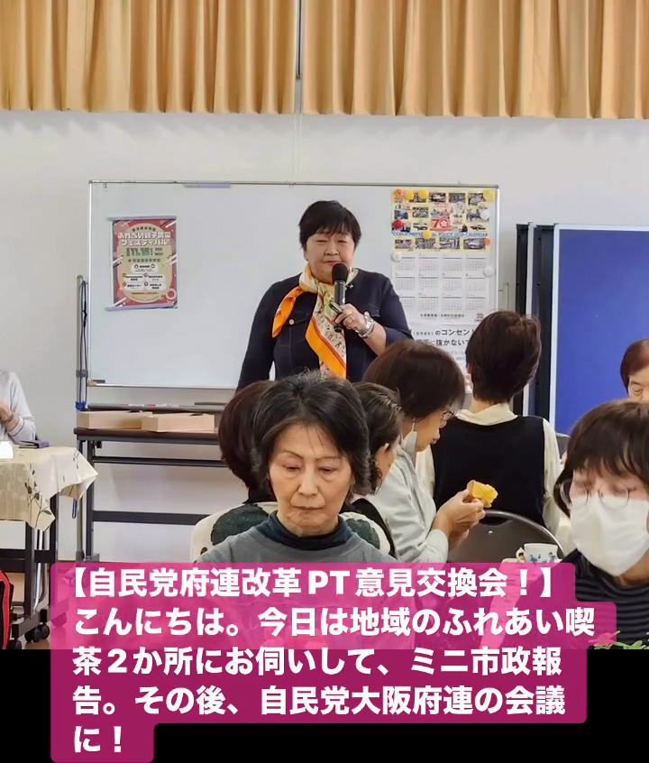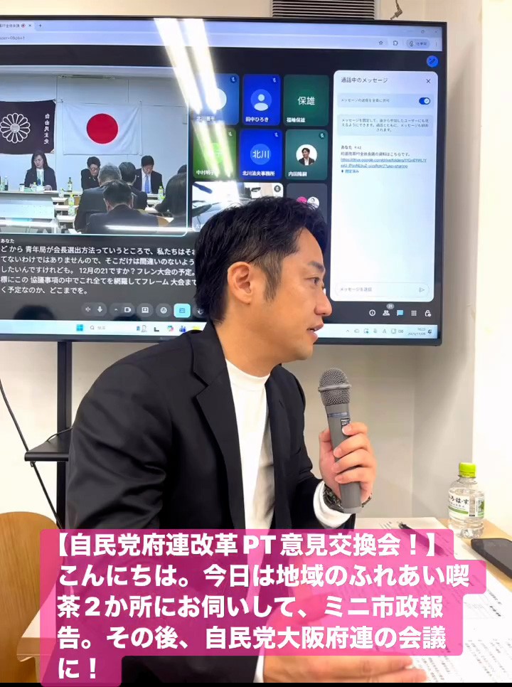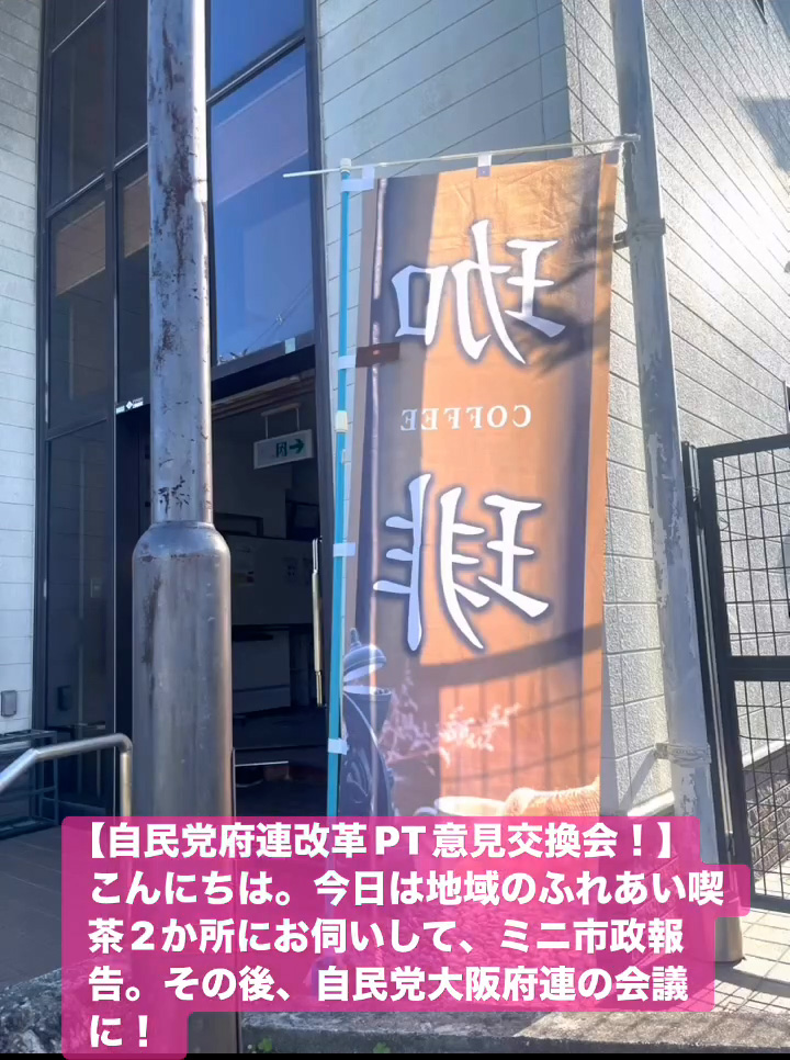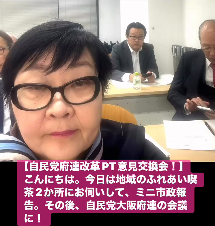 自民党府連改革PT意見交換会! 11月8日 Posted on 2025年11月8日 13:55:022025年11月10日 こんにちは。今日は地域のふれあい喫茶2か所にお伺いして、ミニ市政報告。その後、自民党大阪府連の会議に! のりこの活動日記, 自民党大阪