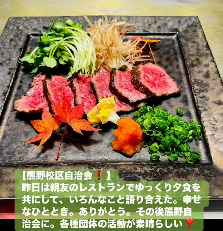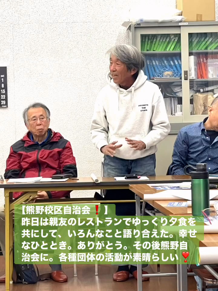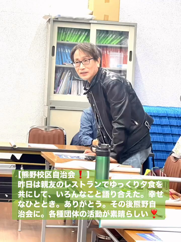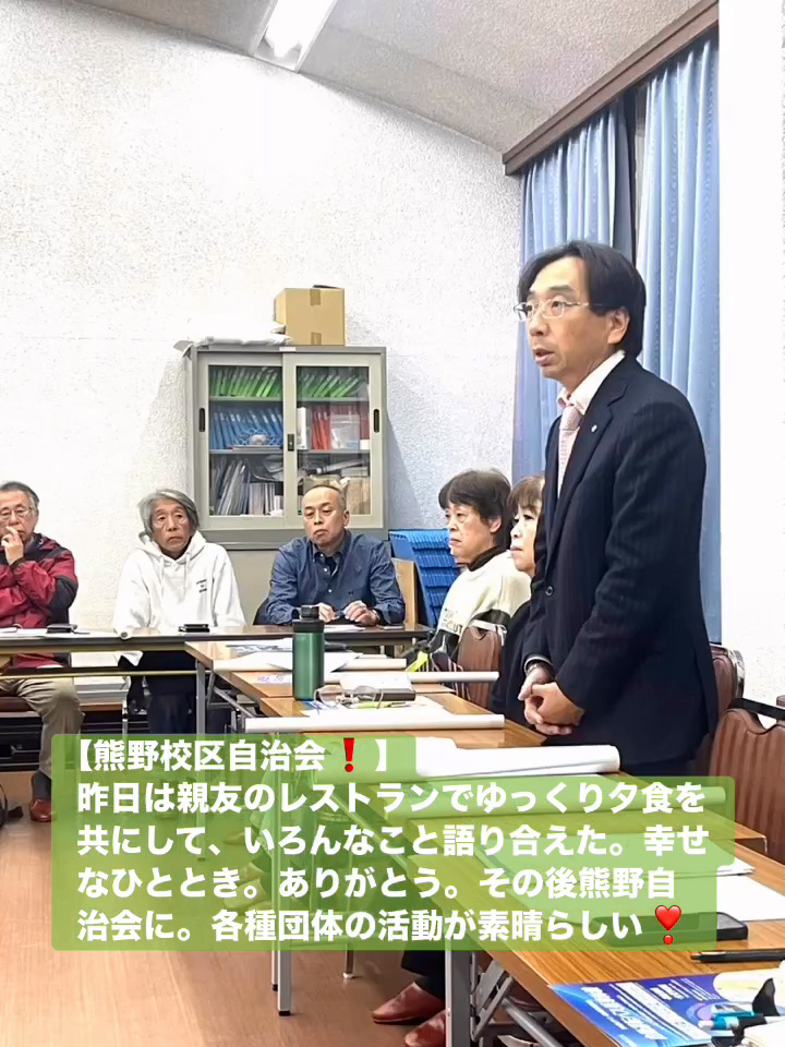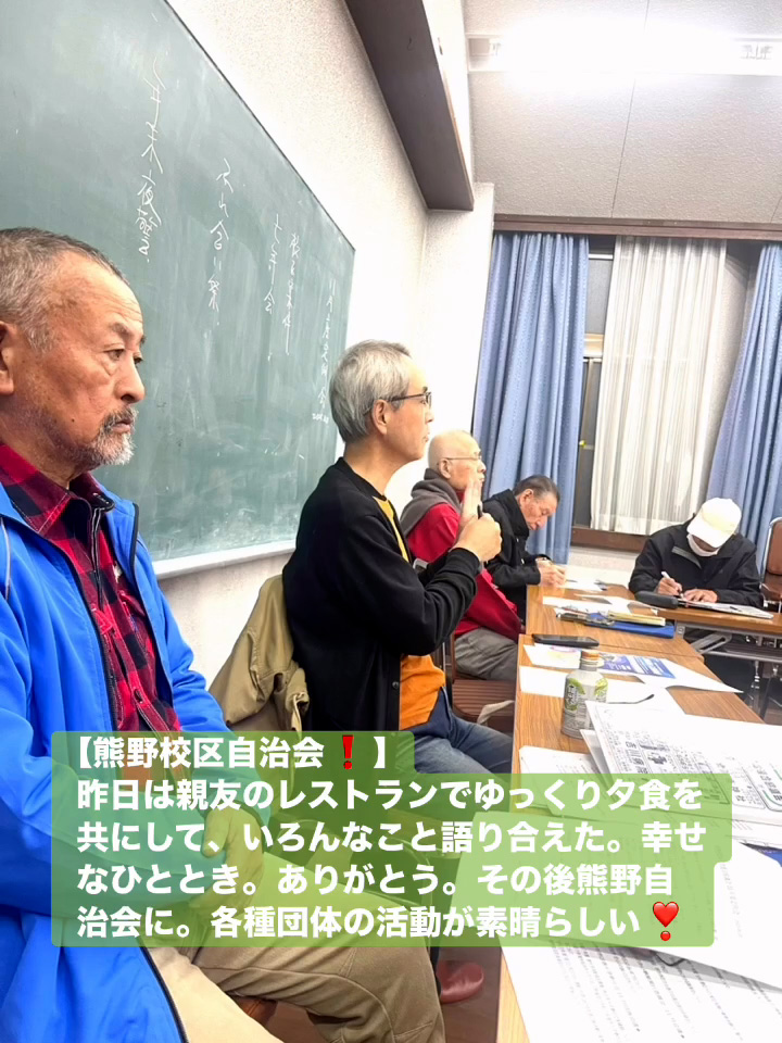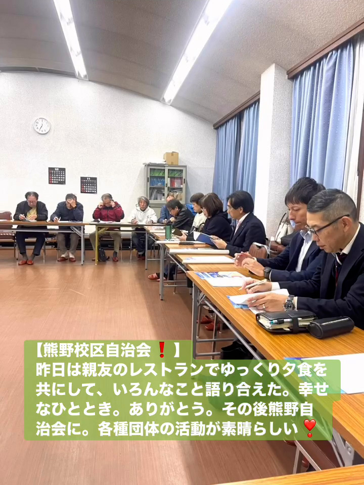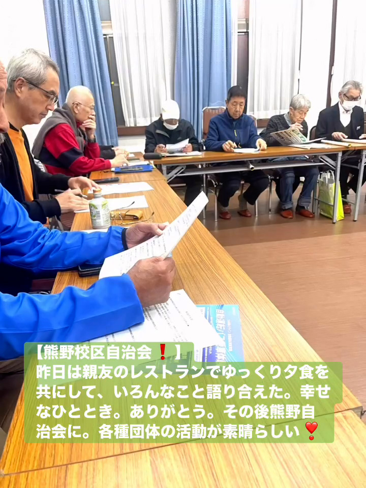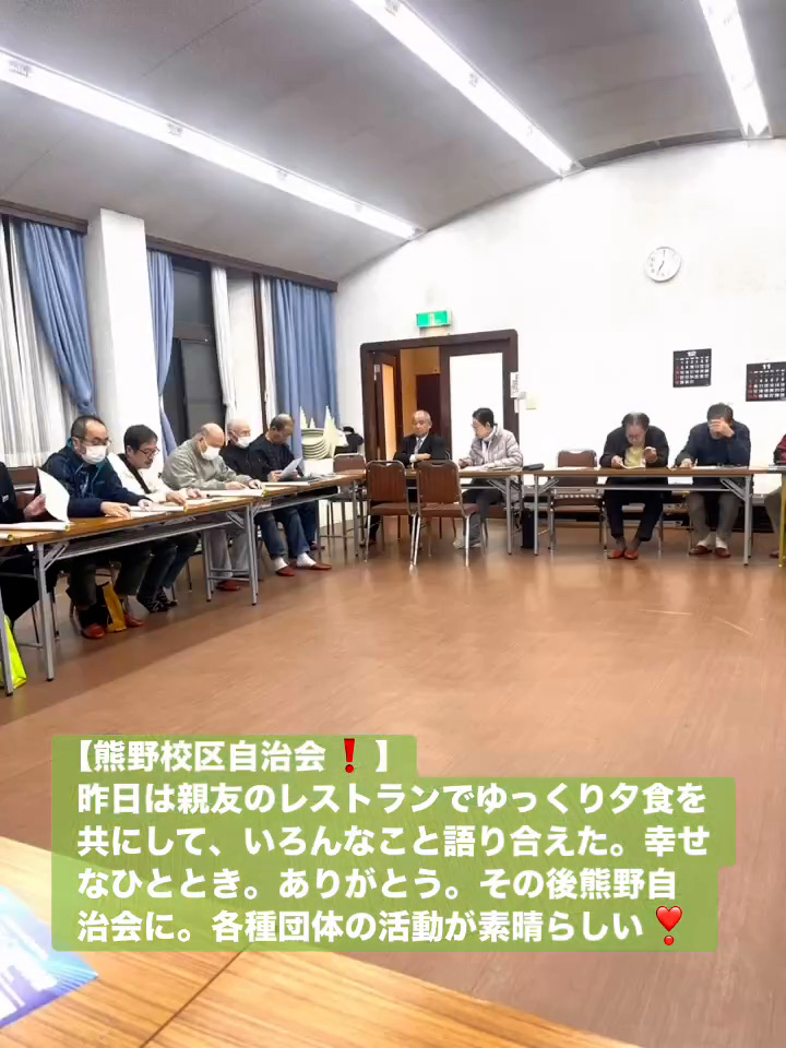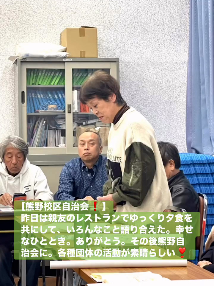 熊野校区自治会! 11月13日 Posted on 2025年11月13日 00:48:022025年11月13日 昨日は親友のレストランでゆっくり夕食を共にして、いろんなこと語り合えた。幸せなひととき。ありがとう。その後熊野自治会に。各種団体の活動が素晴らしい❣ のりこの活動日記