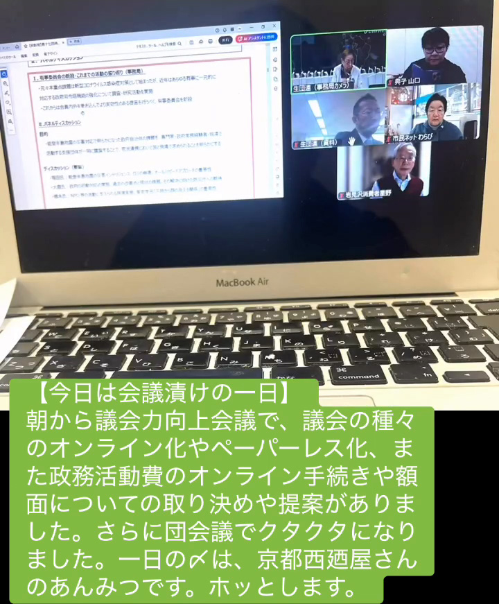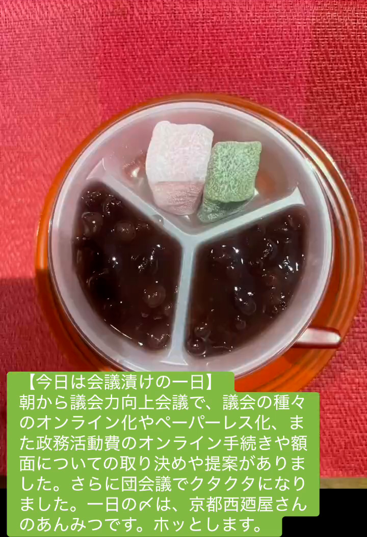 今日は会議漬けの一日 11月14日 Posted on 2025年11月14日 02:36:012025年11月14日 朝から議会力向上会議で、議会の種々のオンライン化やペーパーレス化、また政務活動費のオンライン手続きや額面についての取り決めや提案がありました。さらに団会議でクタクタになりました。一日の〆は、京都西廼屋さんのあんみつです。ホッとします。 のりこの活動日記, 議会報告
