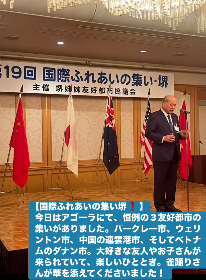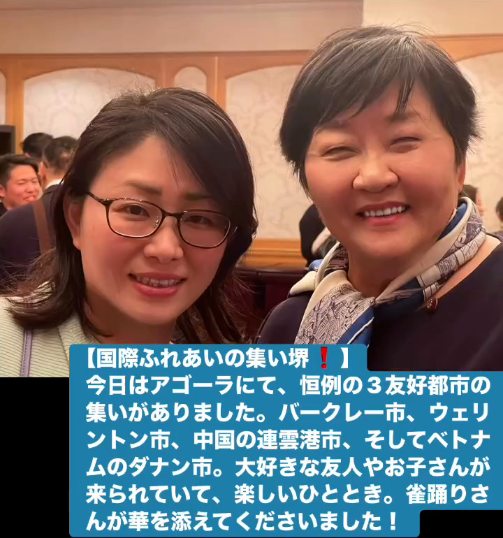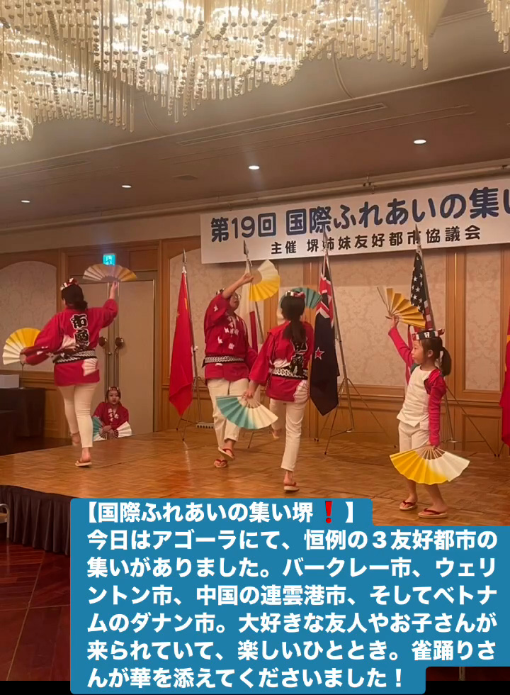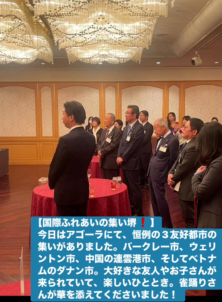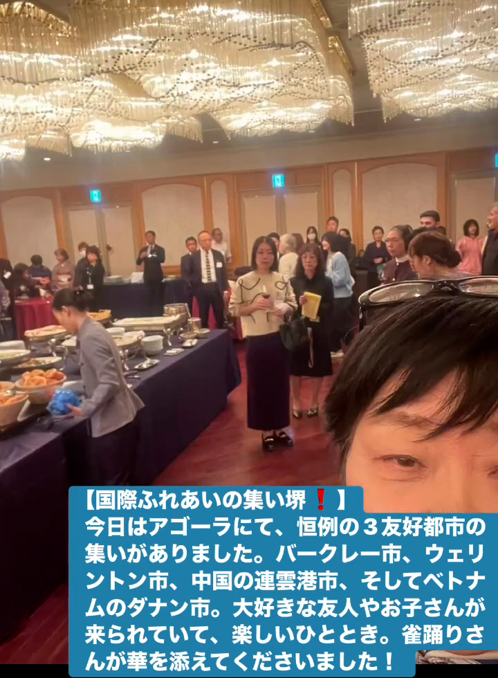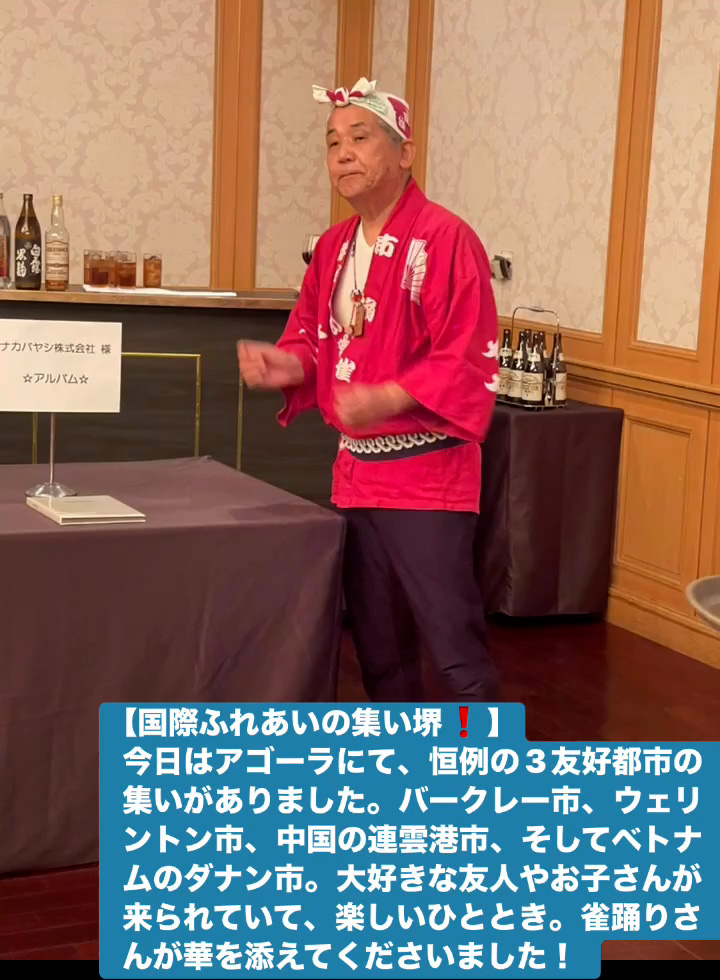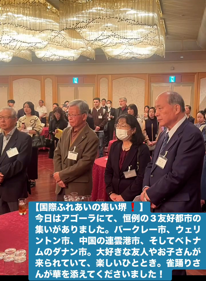 今日はアゴーラにて、恒例の3友好都市の集いがありました。バークレー市、ウェリントン市、中国の連雲港市、そしてベトナムのダナン市。大好きな友人やお子さんが来られていて、楽しいひととき。雀踊りさんが華を添えてくださいました!