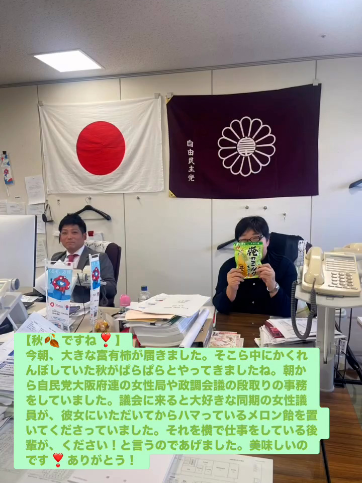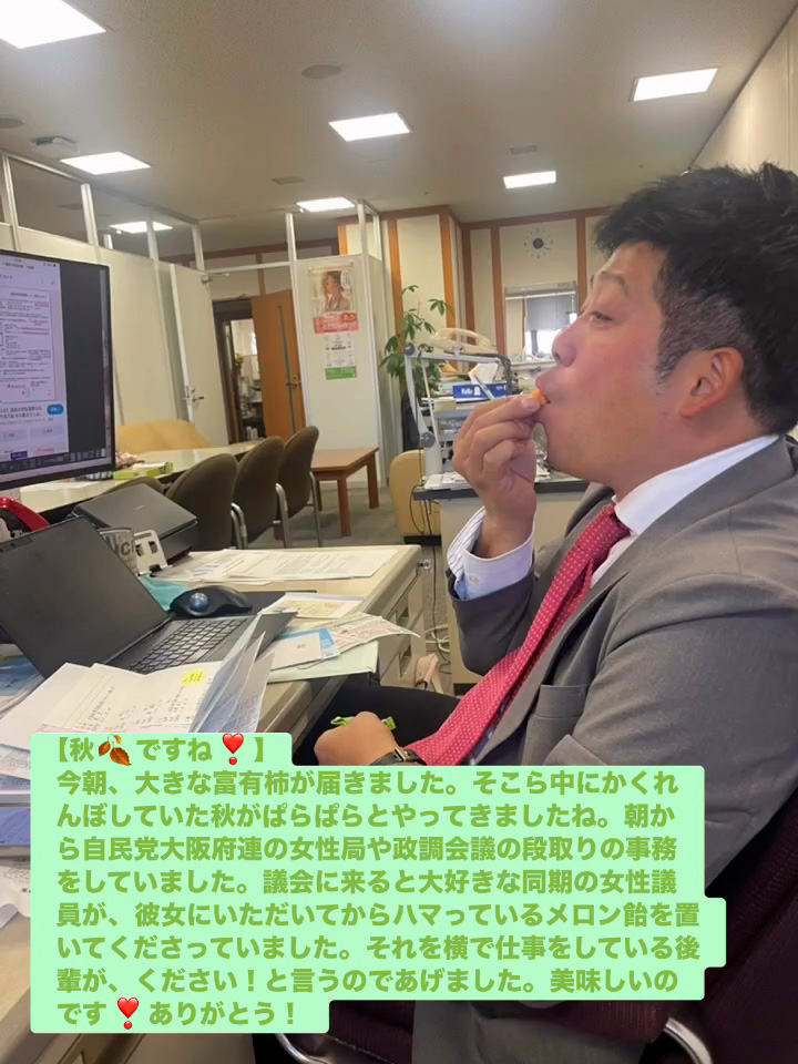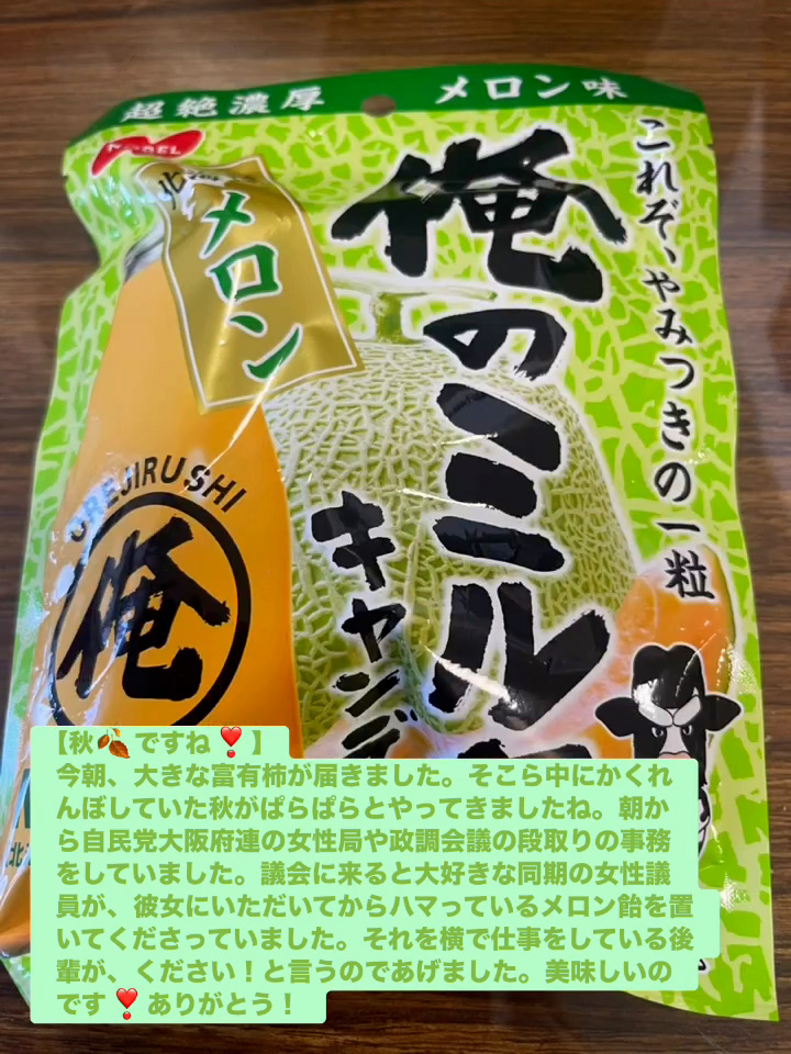今朝、 大きな冨有柿が届きました。 そこら中にかくれんほしていた秋がばらばらとやってきましたね。 朝から自民党大阪府連の女性局や政調会議の段取りの事務をしていました。 議会に来ると大好きな同期の女性議員が、 彼女にいただいてからハマっているメロン飴を置いてくださっていました。 それを横で仕事をしている後輩が、ください!と言うのであけました。 美味しいのです❣ありがとう!