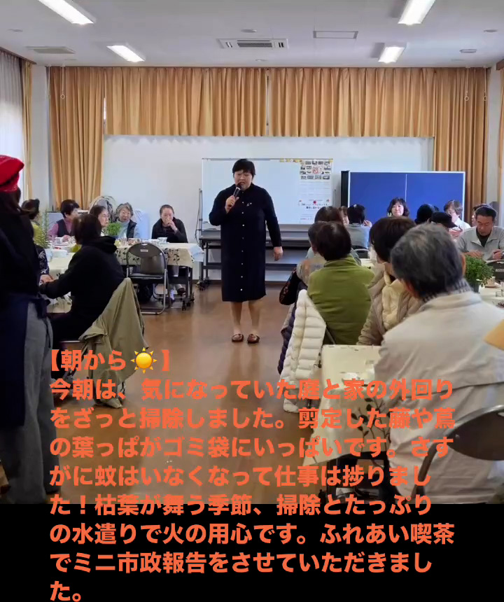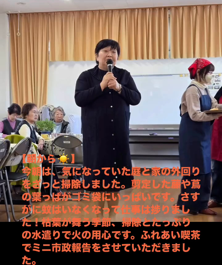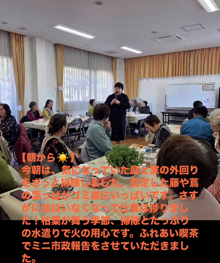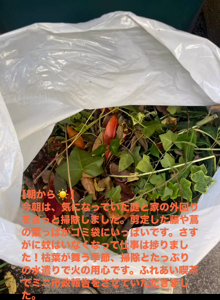 今朝は、気になっていた庭と家の外回りをさっと掃除しました。剪定した藤や蔦の葉っぱがゴミ袋にいっぱいです。さすがに蚊はいなくなって仕事は捗りました!枯葉が舞う季節、掃除とたっぷりの水遣りで火の用心です。ふれあい喫茶でミニ市政報告をさせていただきました。