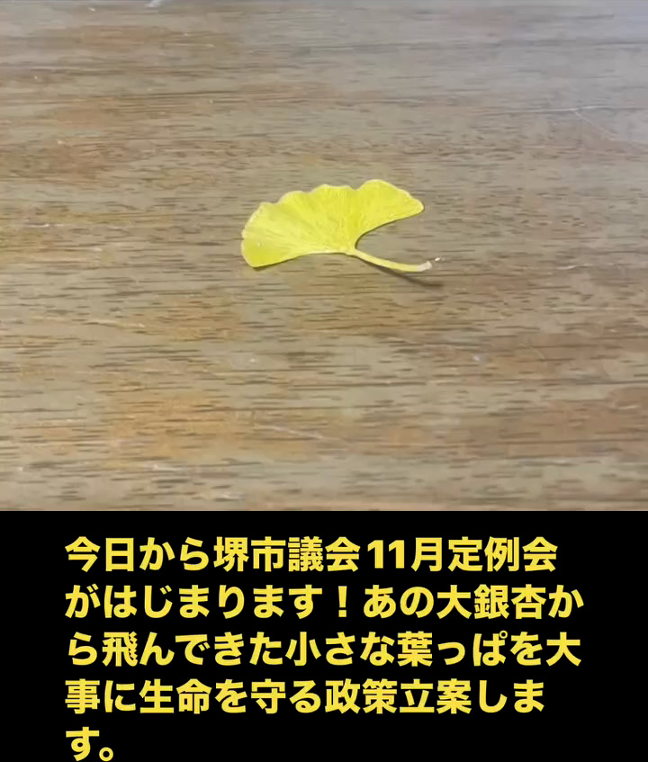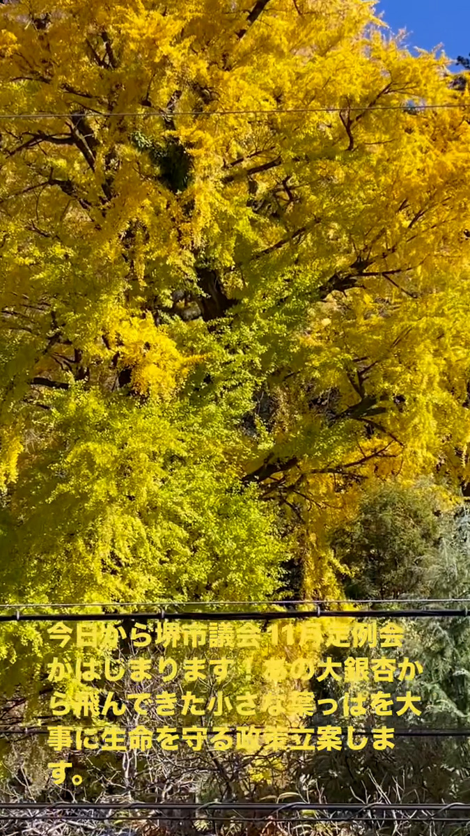 堺市議会11月定例会 11月25日 Posted on 2025年11月25日 16:38:032025年11月26日 今日から堺市議会11月定例会がはじまります!あの大銀杏から飛んできた小さな葉っばを大事に生命を守る政策立案します。 のりこの活動日記