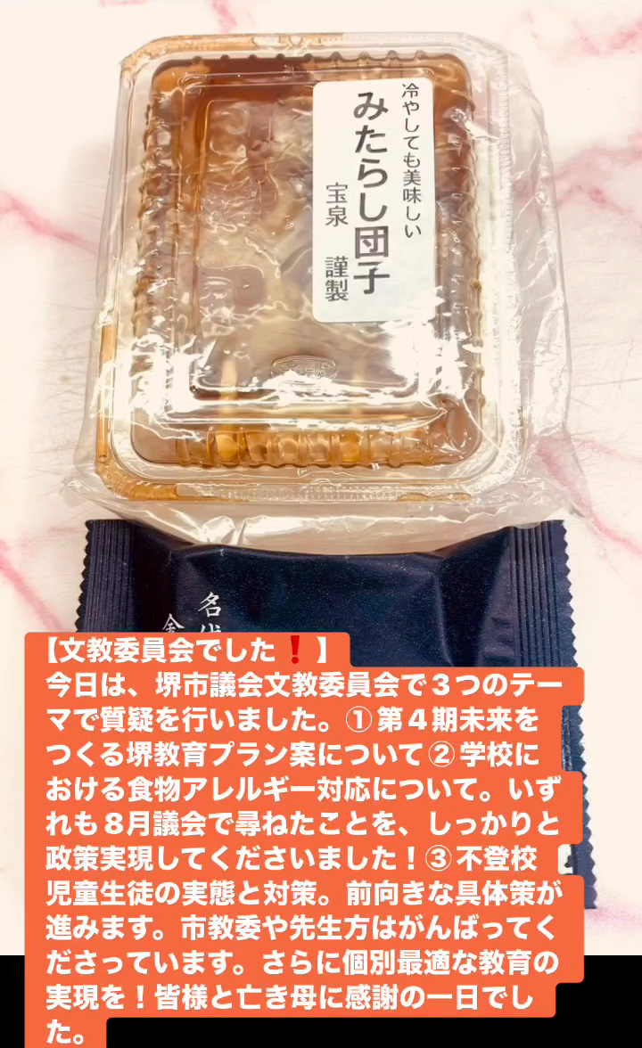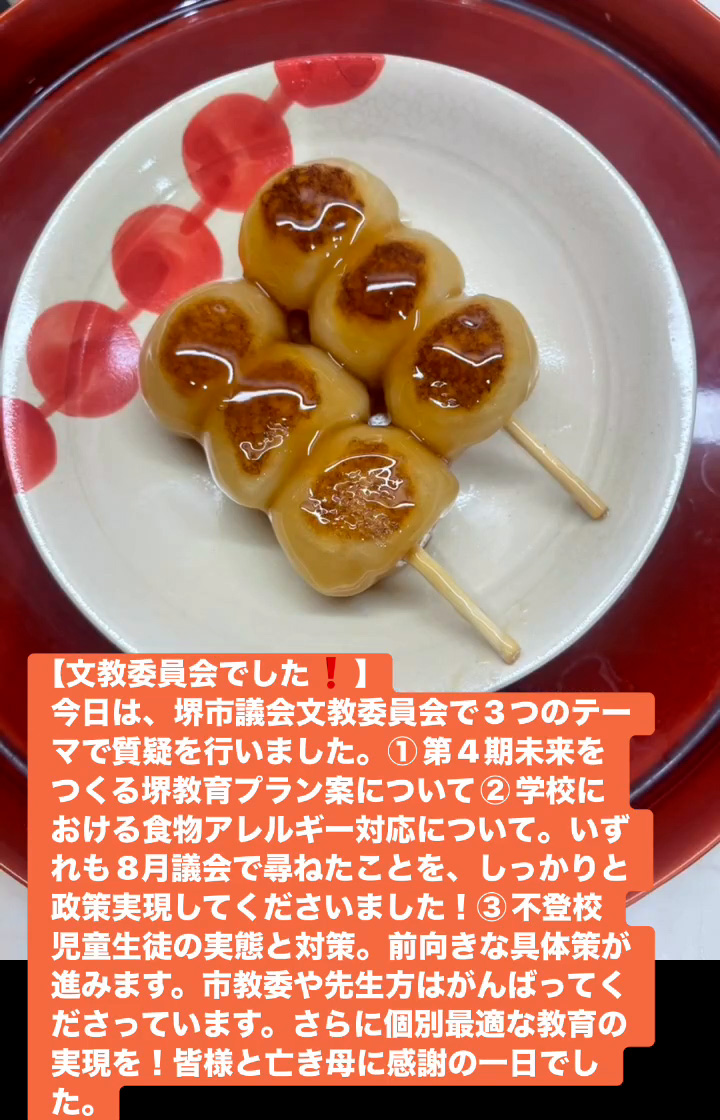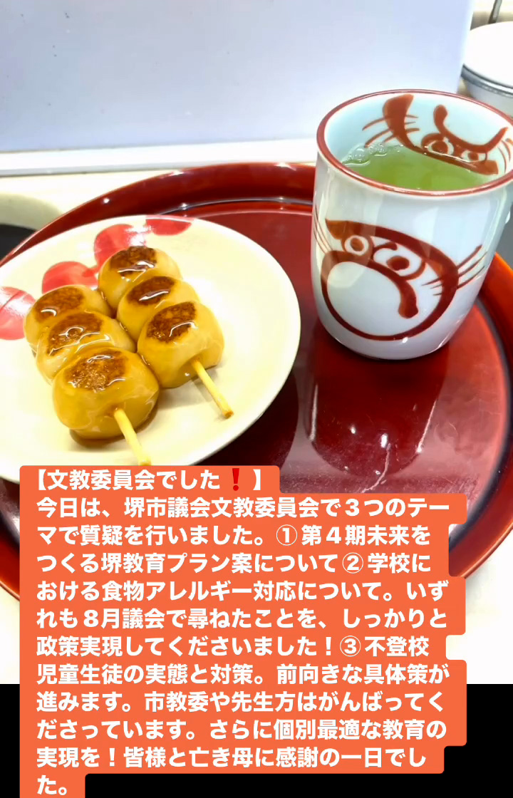 文教委員会でした! 12月12日 Posted on 2025年12月12日 22:21:002025年12月15日 今日は、堺市議会文教委員会で3つのテーマで質疑を行いました。①第4期未来をつくる堺教育プラン案について②学校における食物アレルギー対応について。いずれも8月議会で尋ねたことを、しっかりと政策実現してくださいました!③不登校児童生徒の実態と対策。前向きな具体策が進みます。市教委や先生方はがんばってくださっています。さらに個別最適な教育の実現を!皆様と亡き母に感謝の一日でした。 のりこの活動日記, 議会報告