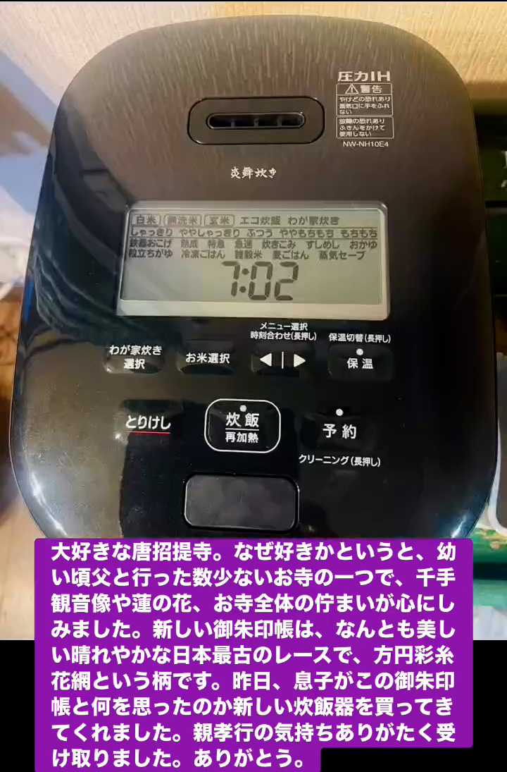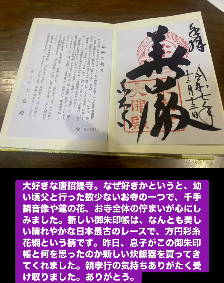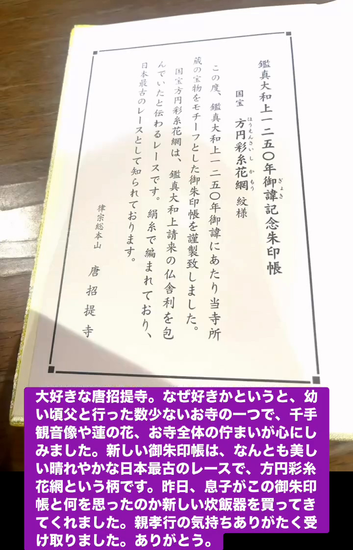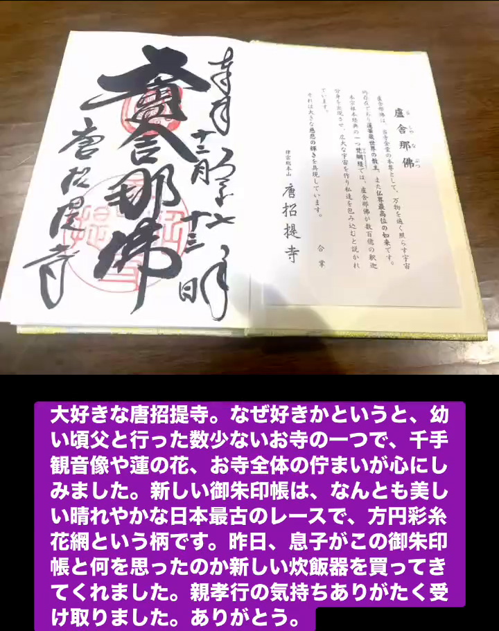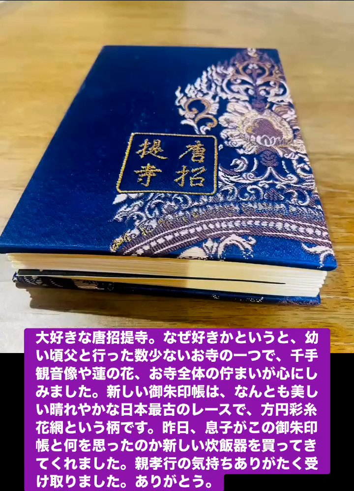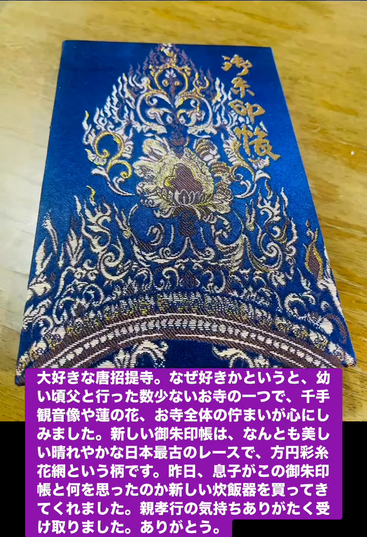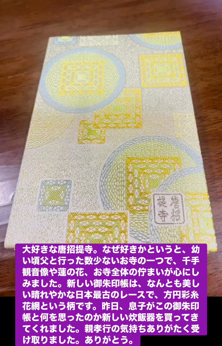 大好きな唐招提寺。なぜ好きかというと、幼い頃父と行った数少ないお寺の一つで、千手観音像や蓮の花、お寺全体の佇まいが心にしみました。新しい御朱印帳は、なんとも美しい晴れやかな日本最古のレースで、方円彩糸花網という柄です。昨日、息子がこの御朱印帳と何を思ったのか新しい炊飯器を買ってきてくれました。親孝行の気持ちありがたく受け取りました。ありがとう。