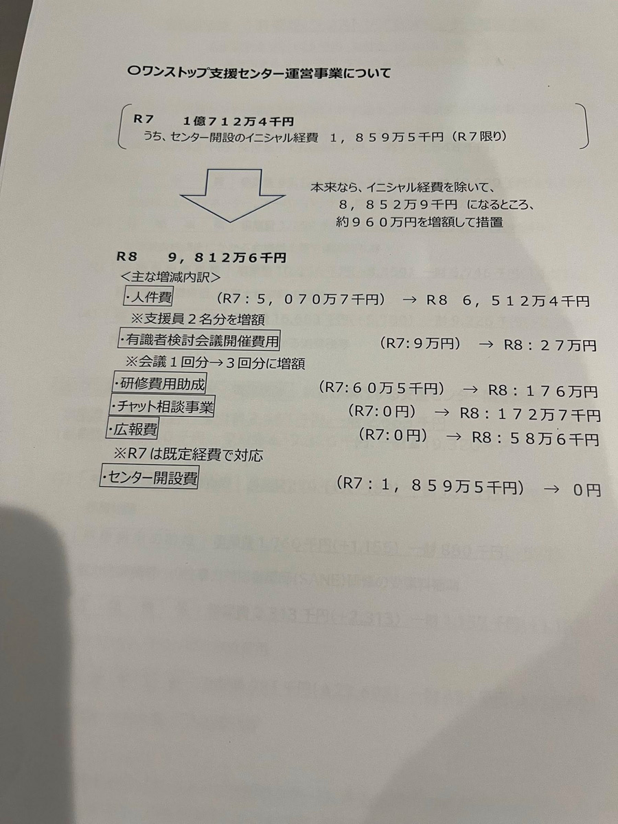 また、大阪府庁が年末最終日の昨日、来年度のウィズユーおおさかの予算概要が発表されました。今月14日の自民党大阪府連政調会議の研修会でも、要望がありましたが、昨年度予算は、センター開設のイニシャル経費1,859万5千円を含めて1億712万4千円でした。普通なら来年度予算はこの開設費を差し引いて8,852万9千円になるところですが、なんと960万円を増額して措置されました。増額の内訳は人件費として支援員2名分、有識者会議の開催を1回から3回に、研修費用の助成やチャット相談事業費と広報費です。