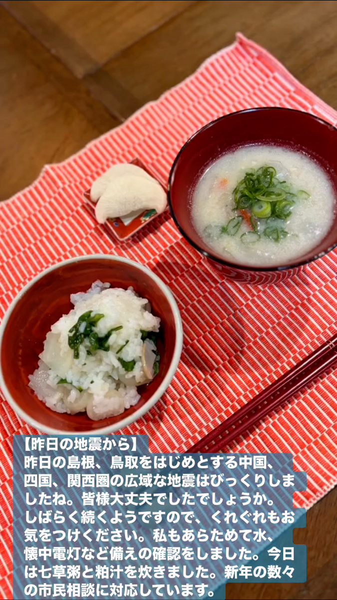 昨日の島根、鳥取をはじめとする中国、四国、関西圏の広域な地震はびっくりしましたね。皆様大丈夫でしたでしょうか。しばらく続くようですので、くれぐれもお気をつけください。私もあらためて水、懐中電灯など備えの確認をしました。今日は七草粥と柏汁を炊きました。新年の数々の市民相談に対応しています。