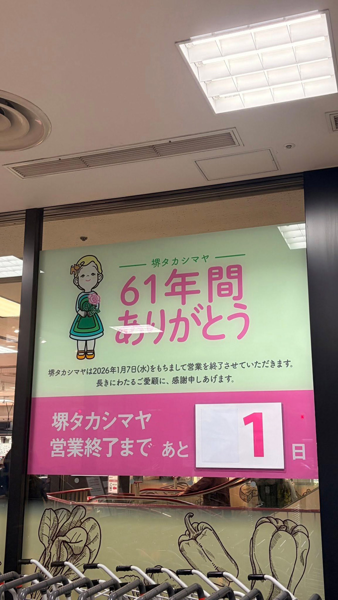 こんにちは。1964年10月に堺東にオープンされた堺髙島屋さんは、今日でその歴史を閉じられます。