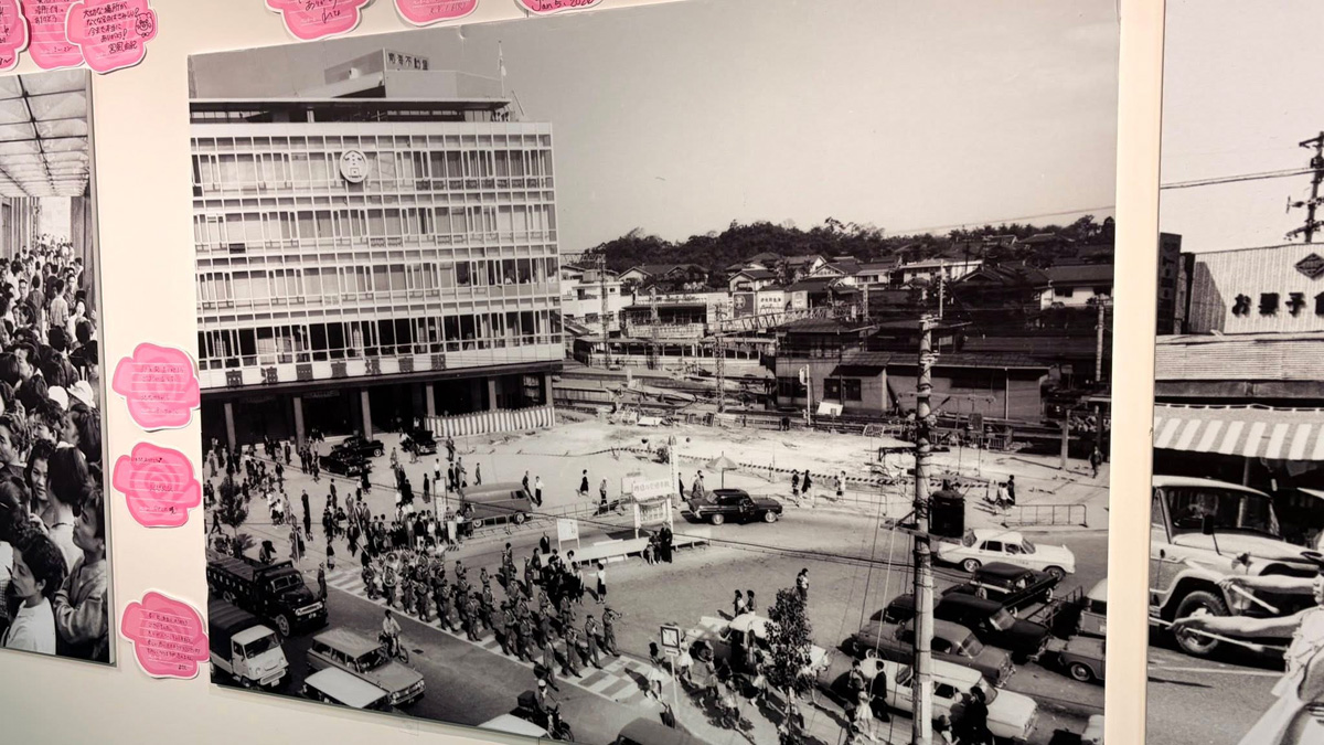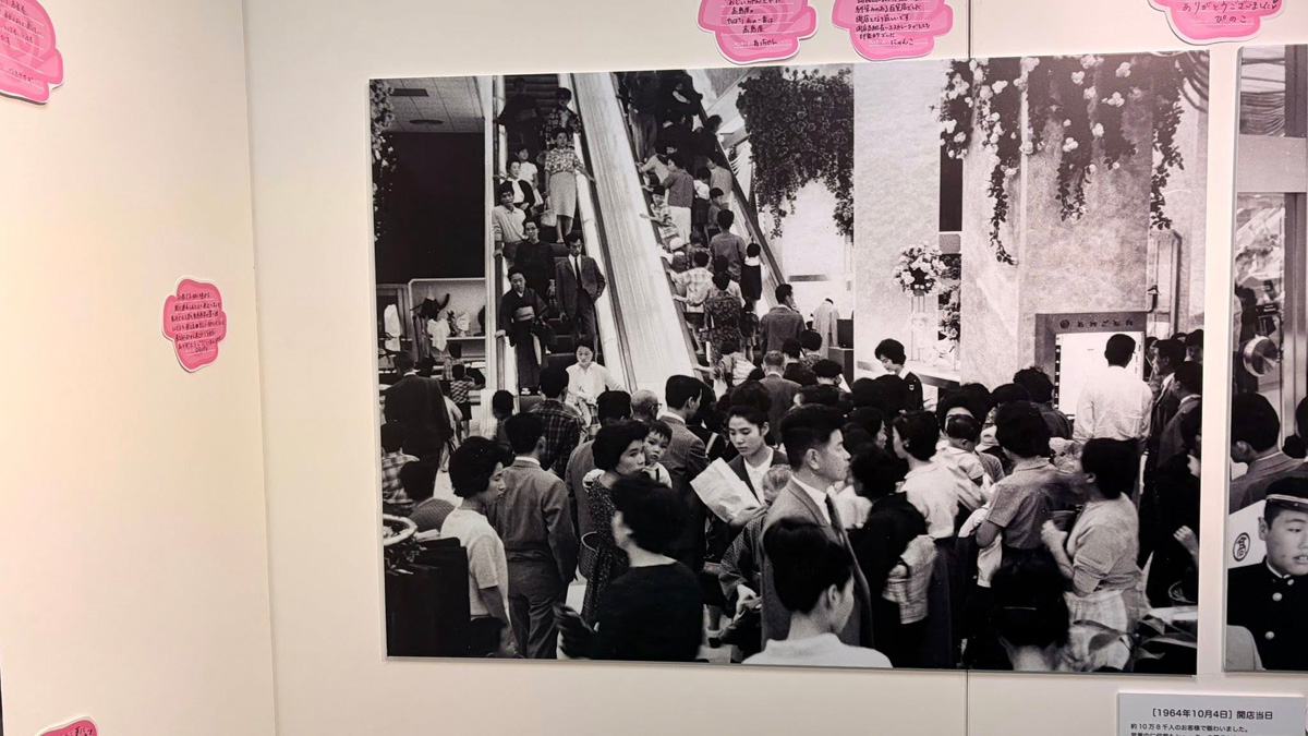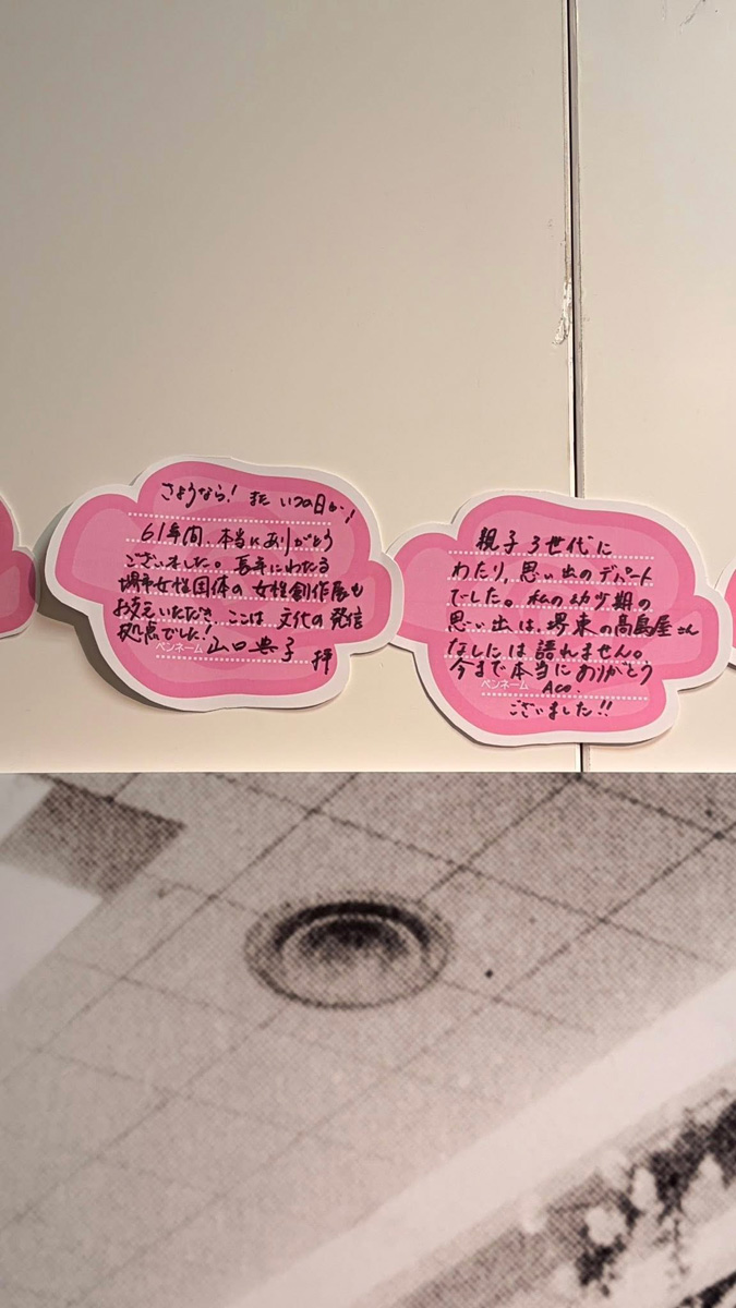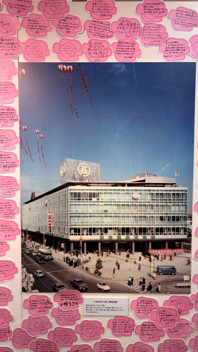 2階のお菓子売り場は、棚が空っぽで、御座候などの売り場では行列ができていました。娘があんこが欲しいというので、並びました。行列に並ばないタイプの自分ですが、万博で並ぶことの忍耐力と意義を身につけました。🤭おかげさまです。5階では、回顧展が行われており、オープン当時の建物や堺東ロータリー、銀座通りの様子がわかる写真がたくさんありました。メッセージカードに感謝を書きました。
