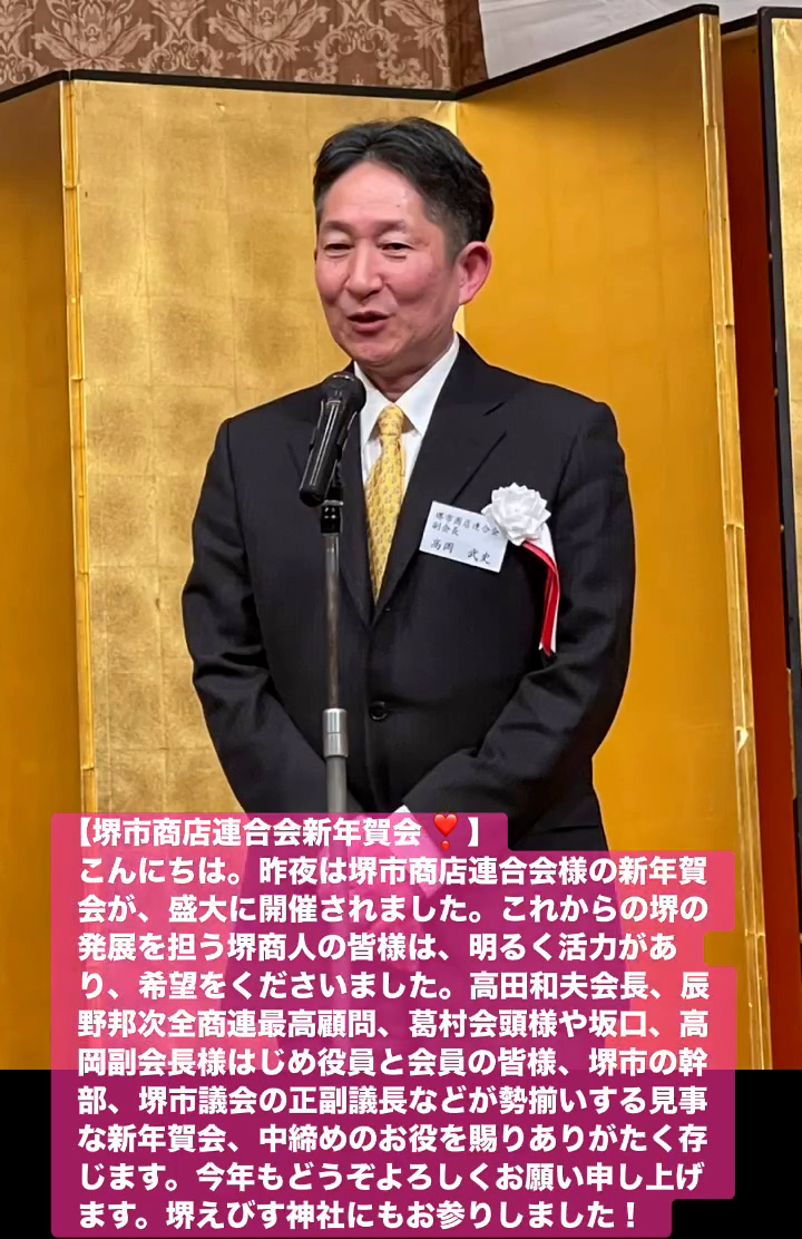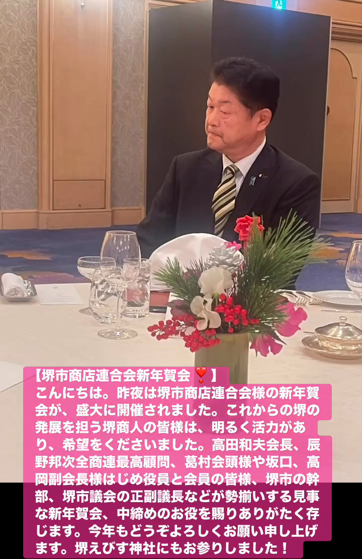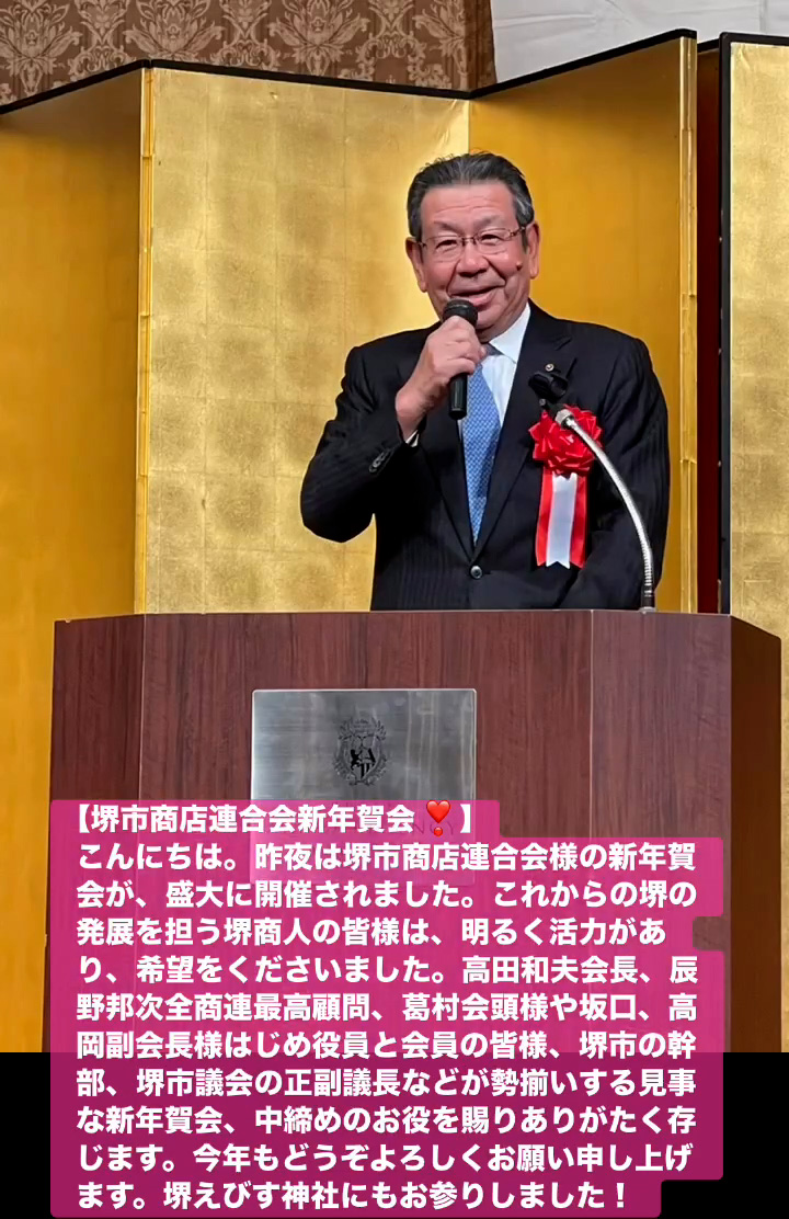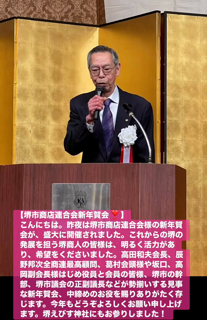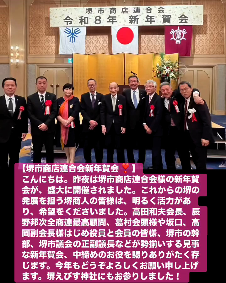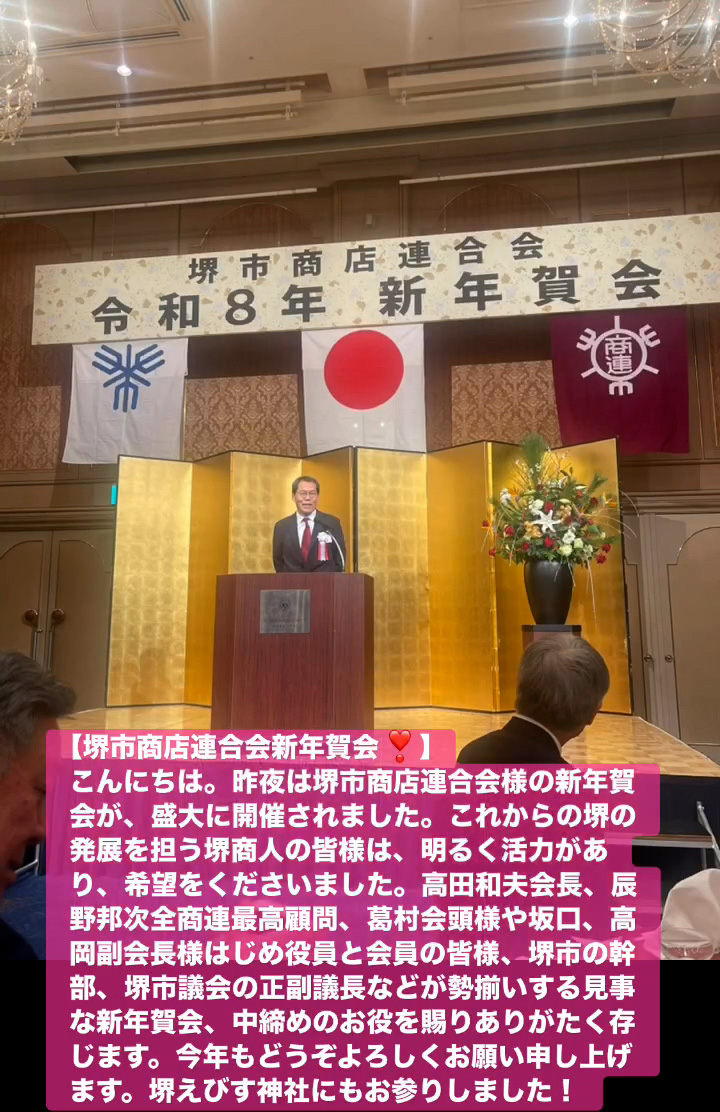 こんにちは。昨夜は堺市商店連合会様の新年賀会が、盛大に開催されました。これからの堺の発展を担う堺商人の皆様は、明るく活力があり、希望をくださいました。高田和夫会長、辰野邦次全商連最高顧問、葛村会頭様や坂口、高岡副会長様はじめ役員と会員の皆様、堺市の幹部、堺市議会の正副議長などが勢揃いする見事な新年賀会、中締めのお役を賜りありがたく存じます。今年もとうぞよろしくお願い申し上けます。堺えびす神社にもお参りしました!