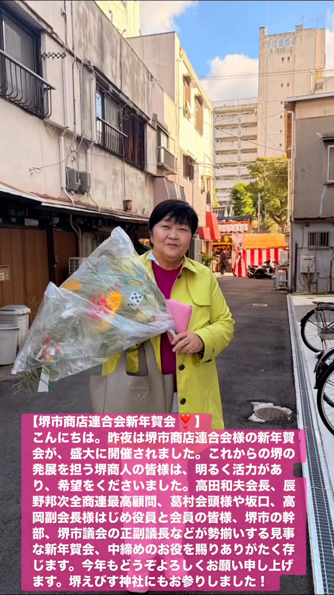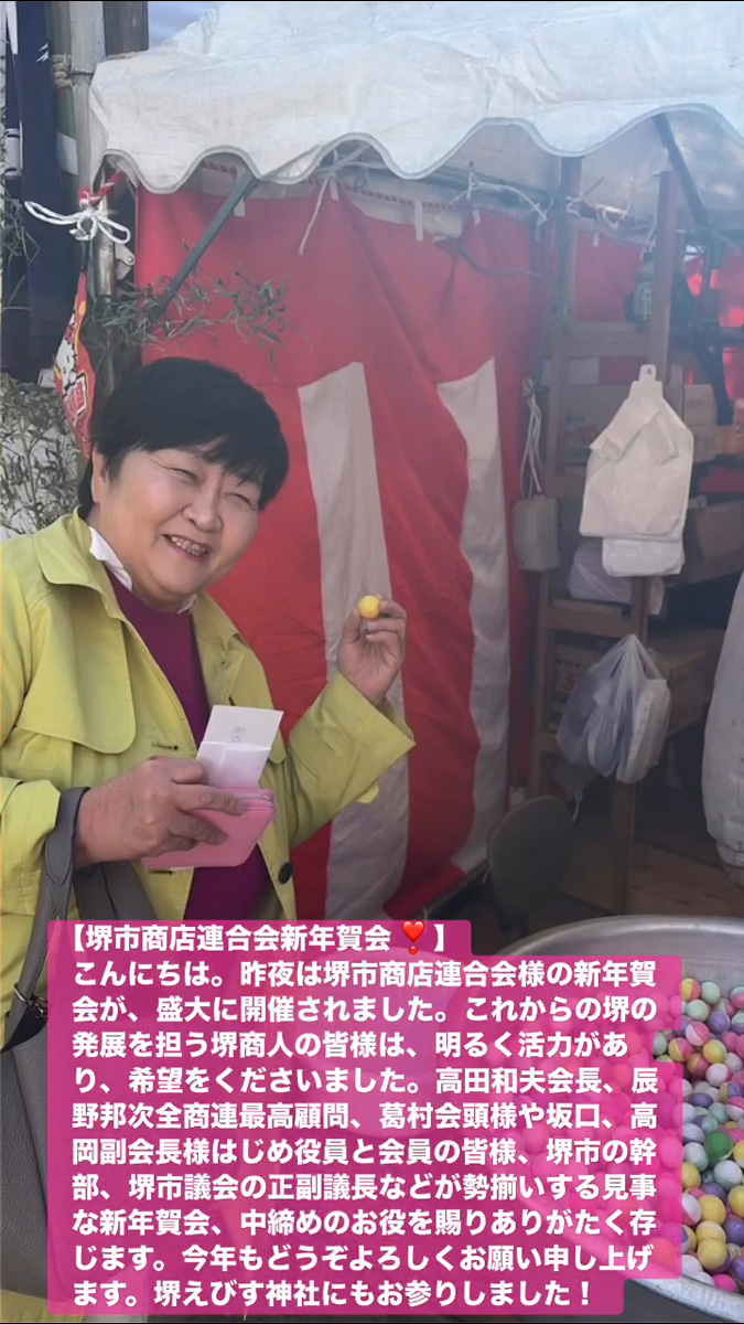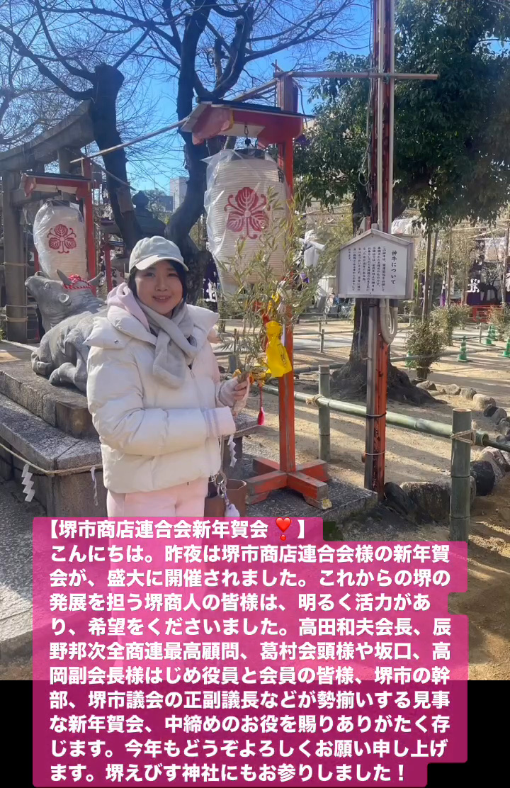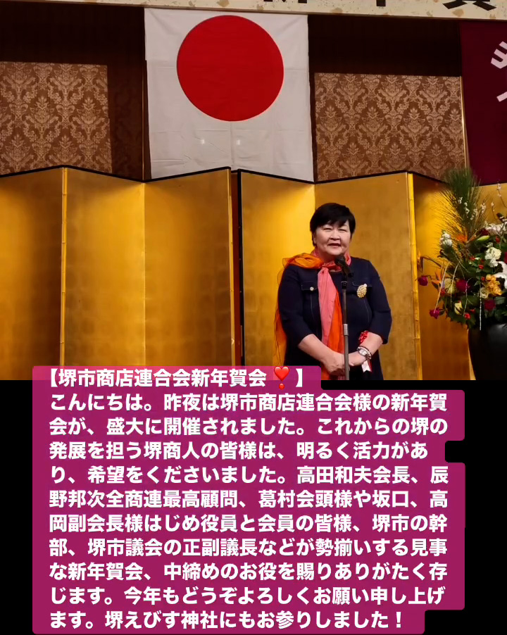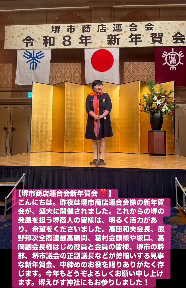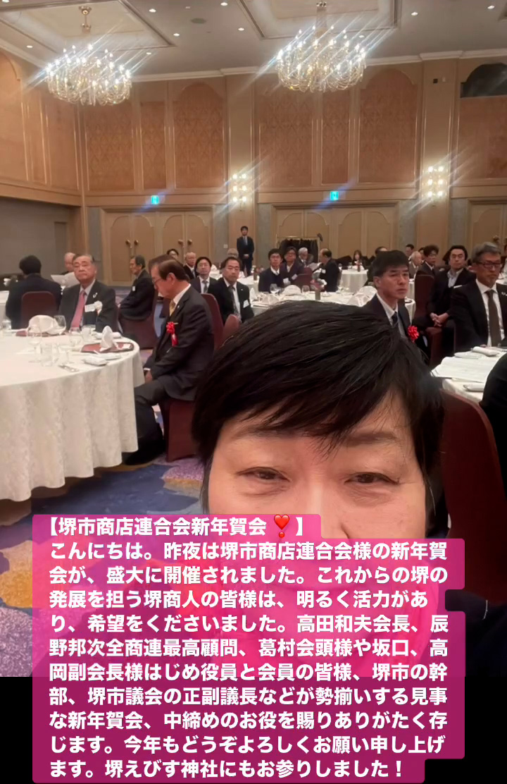 こんにちは。昨夜は堺市商店連合会様の新年賀会が、盛大に開催されました。これからの堺の発展を担う堺商人の皆様は、明るく活力があり、希望をくださいました。高田和夫会長、辰野邦次全商連最高顧問、葛村会頭様や坂口、高岡副会長様はじめ役員と会員の皆様、堺市の幹部、堺市議会の正副議長などが勢揃いする見事な新年賀会、中締めのお役を賜りありがたく存じます。今年もとうぞよろしくお願い申し上けます。堺えびす神社にもお参りしました!