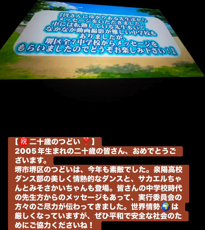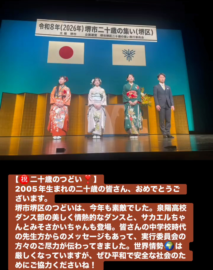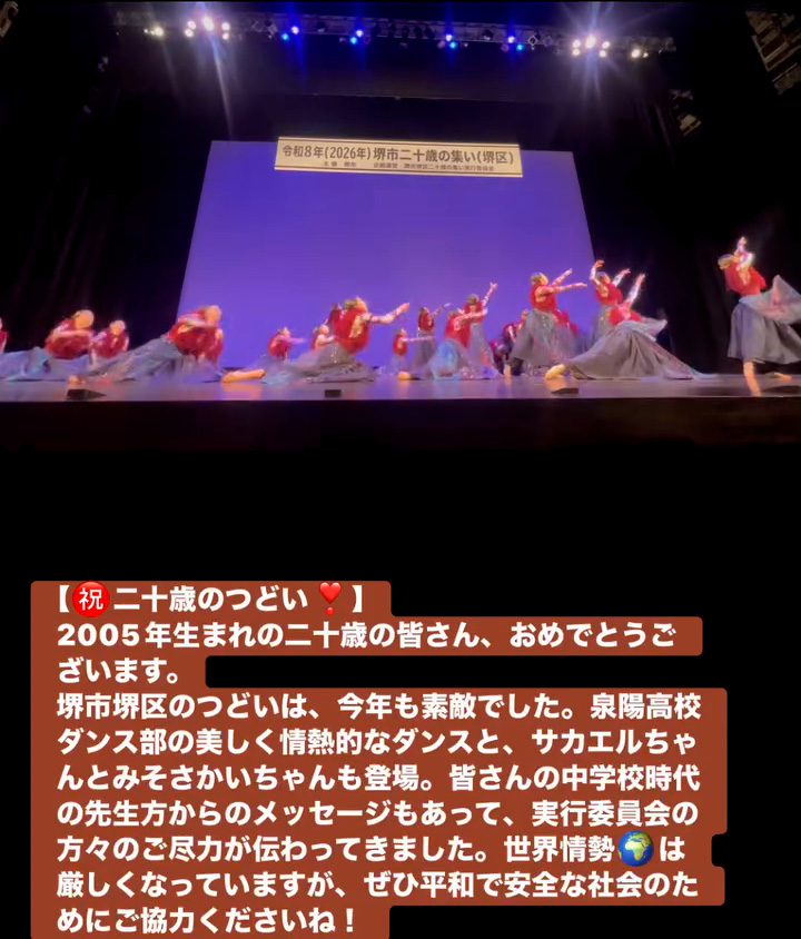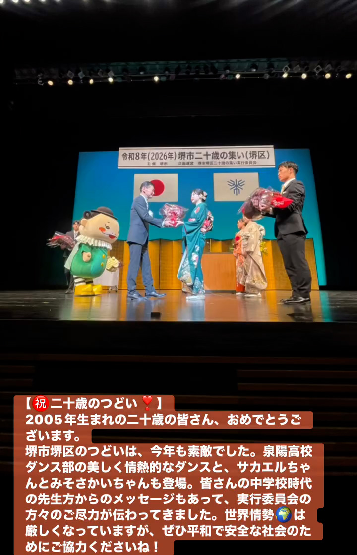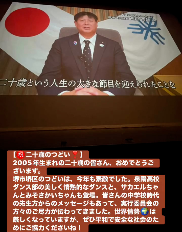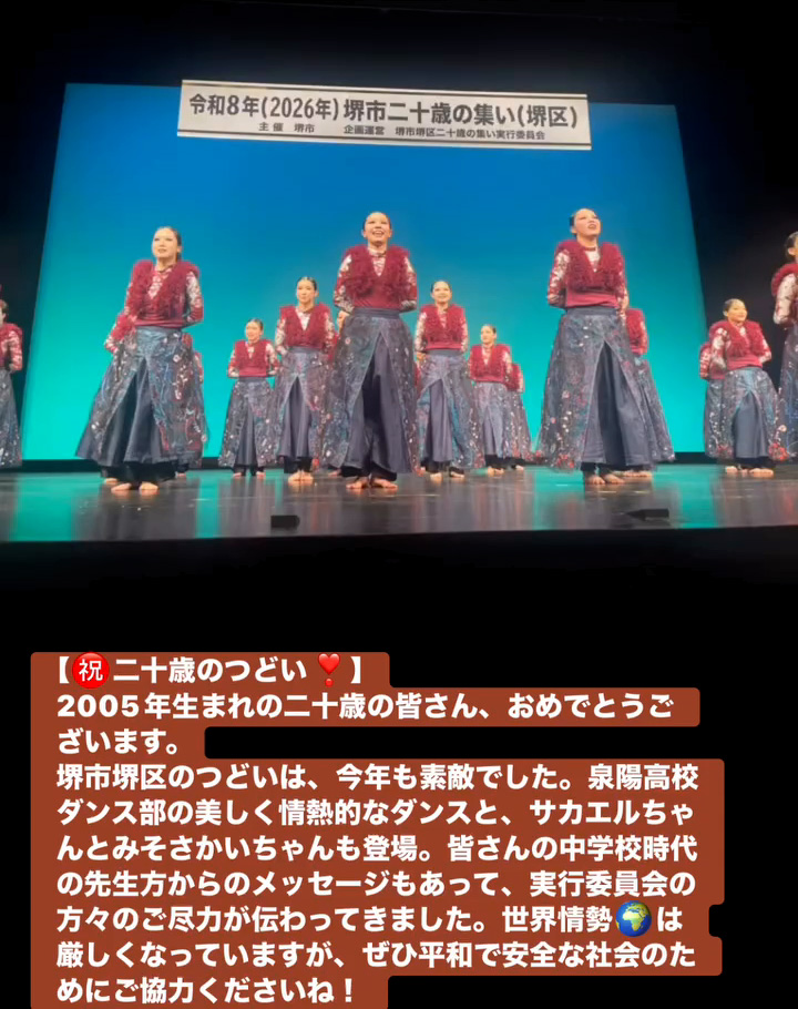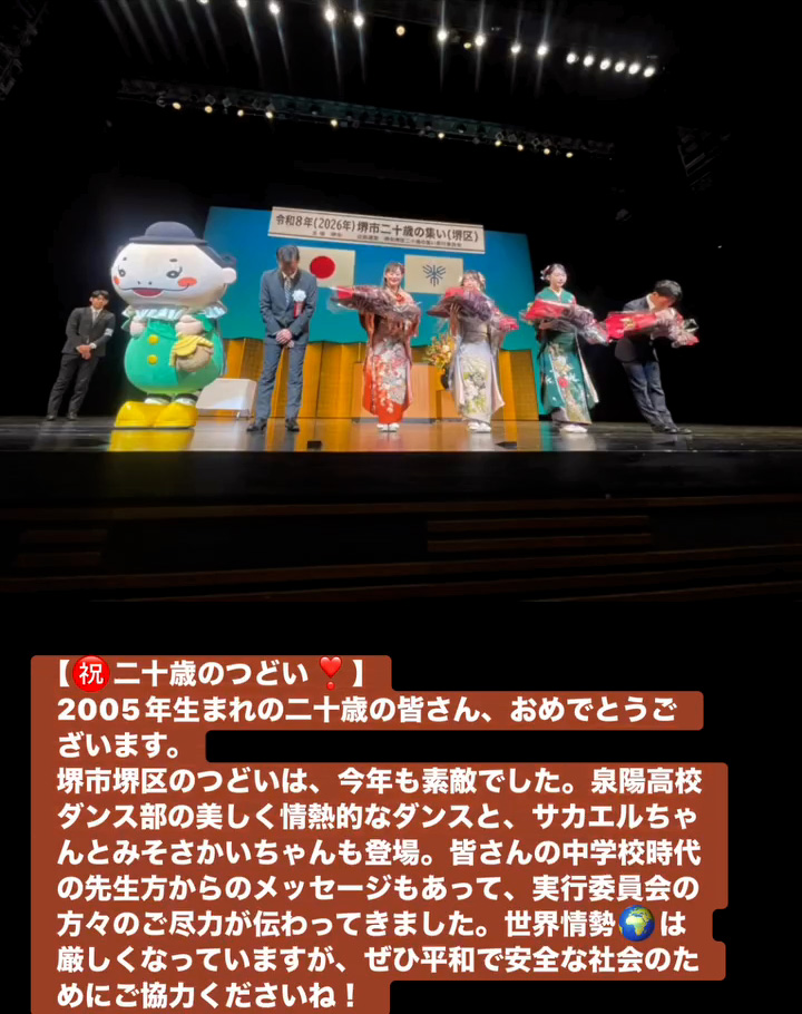 堺市堺区のつどいは、今年も素敵でした。泉陽高校ダンス部の美しく情熱的なダンスと、サカエルちゃんとみそさかいちゃんも登場。皆さんの中学校時代の先生方からのメッセージもあって、実行委員会の方々のご尽力が伝わってきました。世界情勢🌏️は厳しくなっていますが、せひ平和で安全な社会のためにこ協力くださいね!