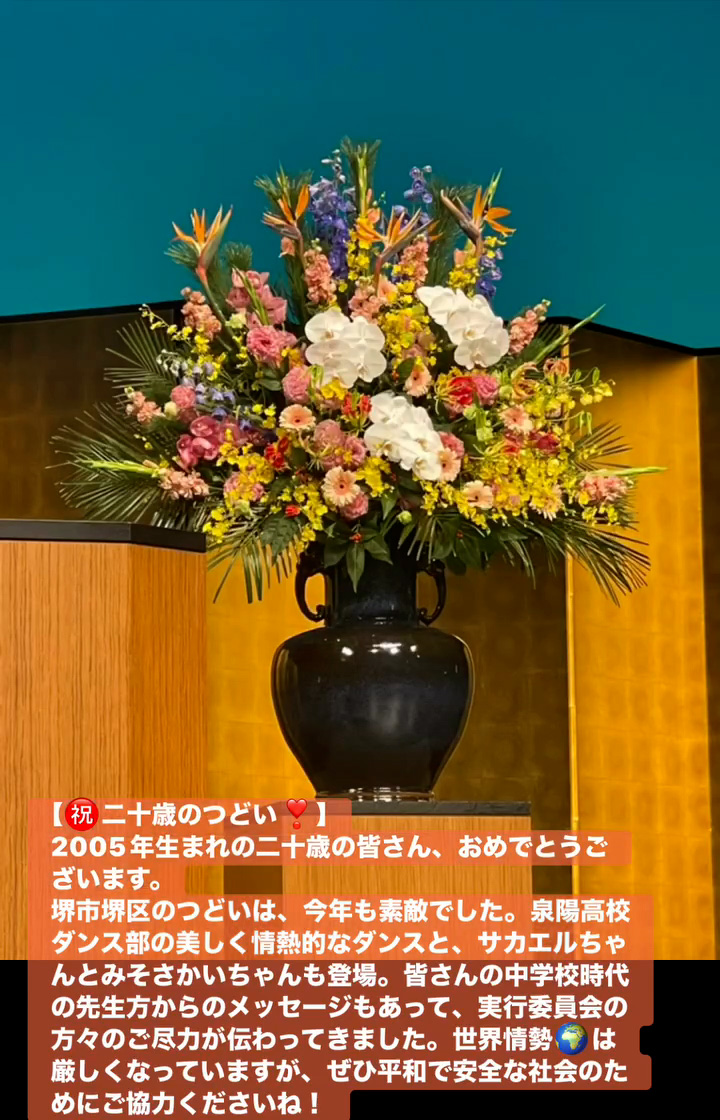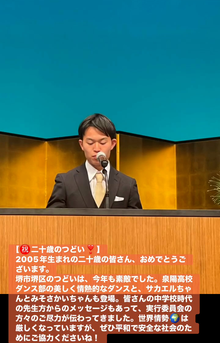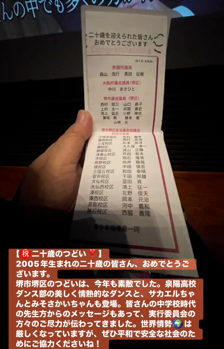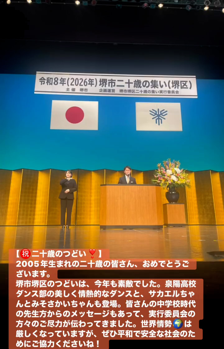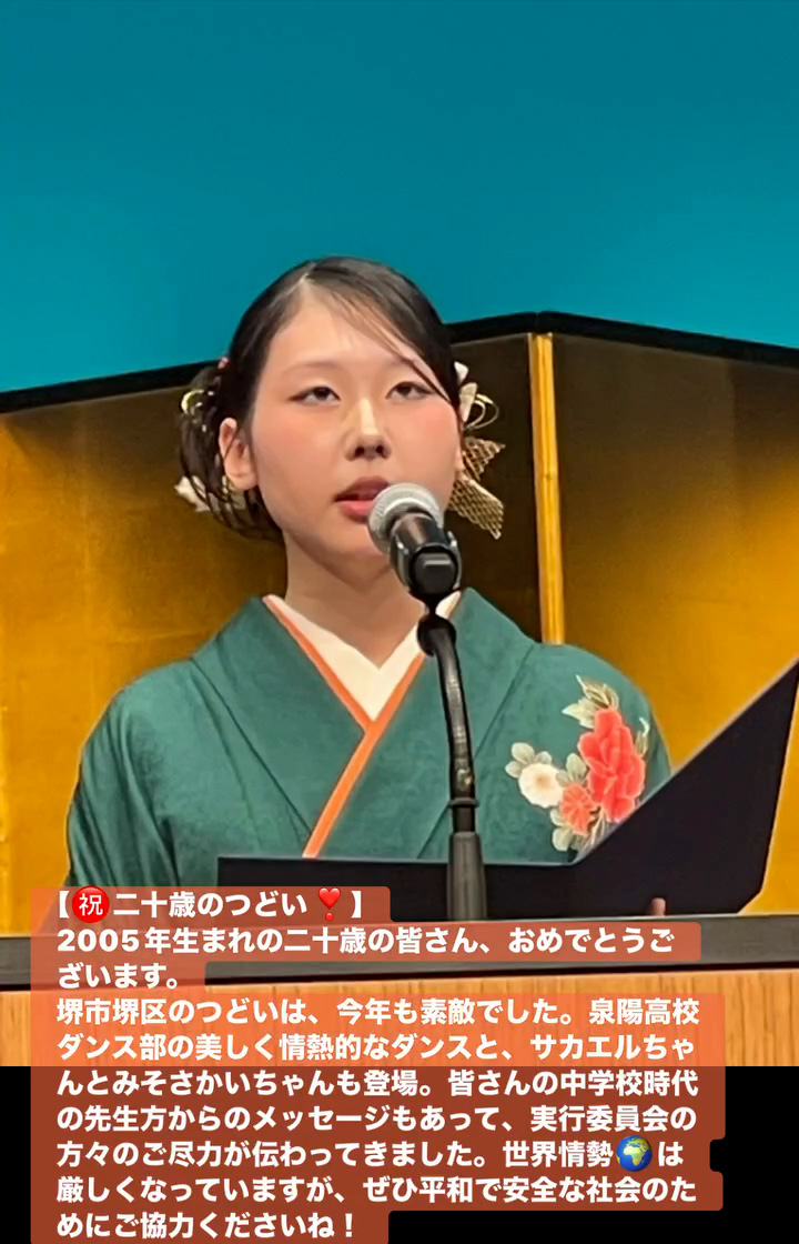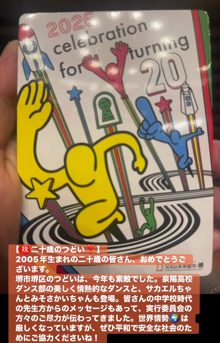 堺市堺区のつどいは、今年も素敵でした。泉陽高校ダンス部の美しく情熱的なダンスと、サカエルちゃんとみそさかいちゃんも登場。皆さんの中学校時代の先生方からのメッセージもあって、実行委員会の方々のご尽力が伝わってきました。世界情勢🌏️は厳しくなっていますが、せひ平和で安全な社会のためにこ協力くださいね!