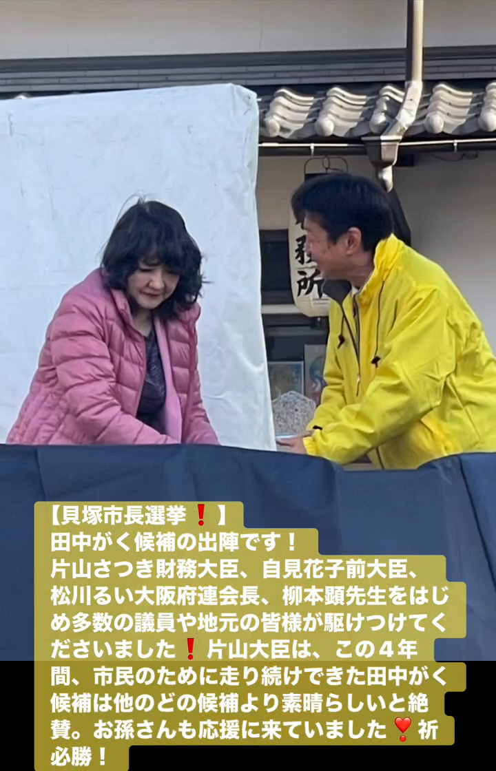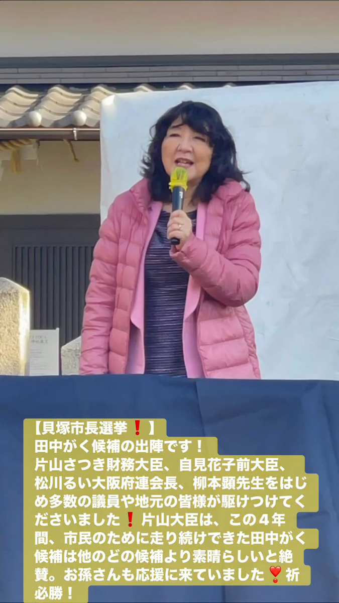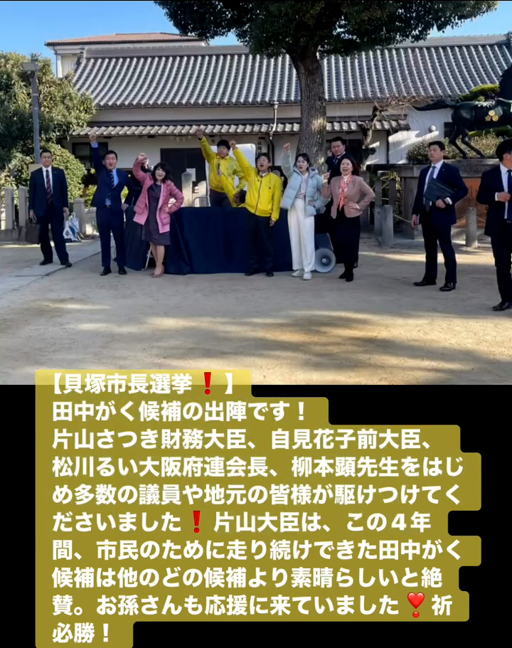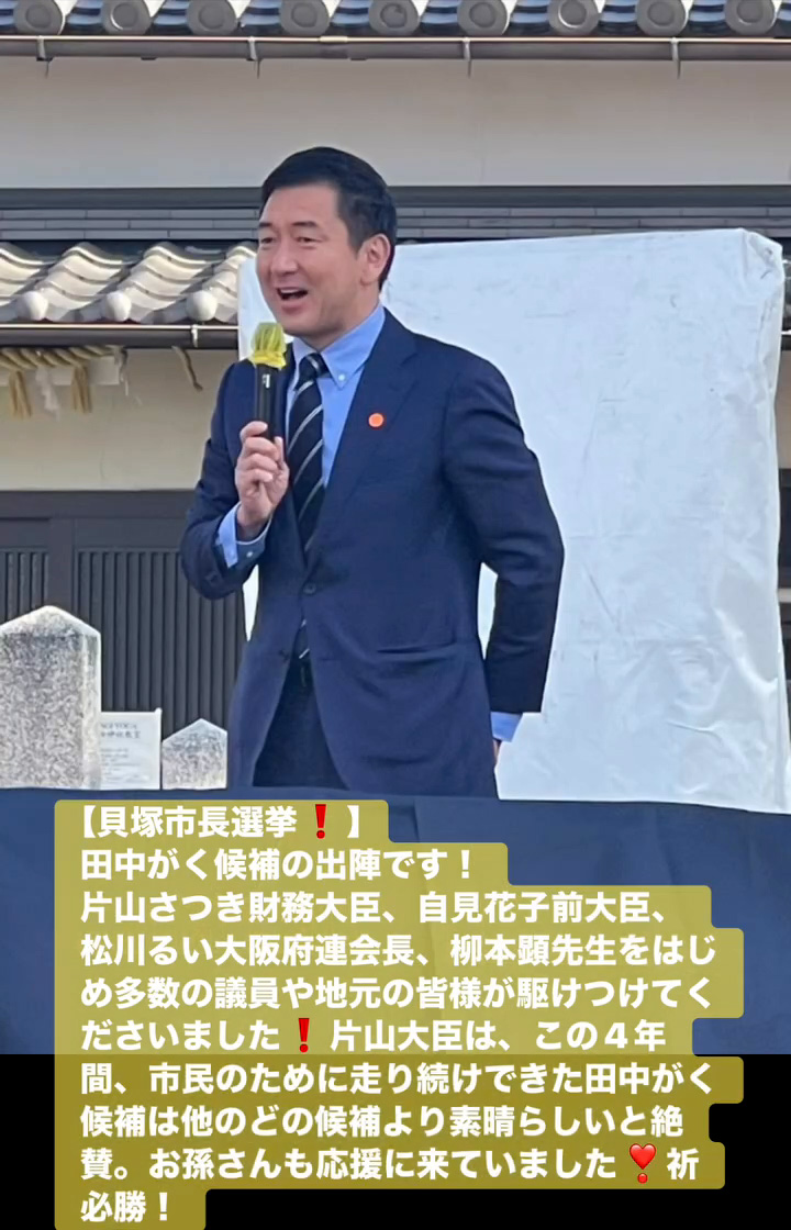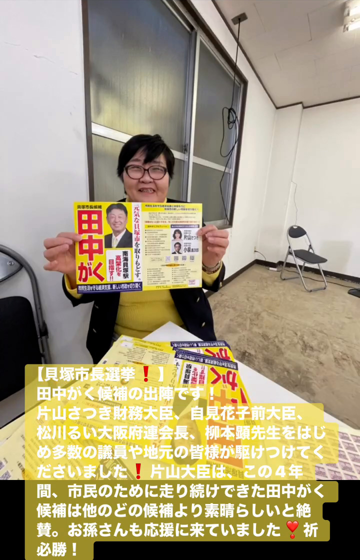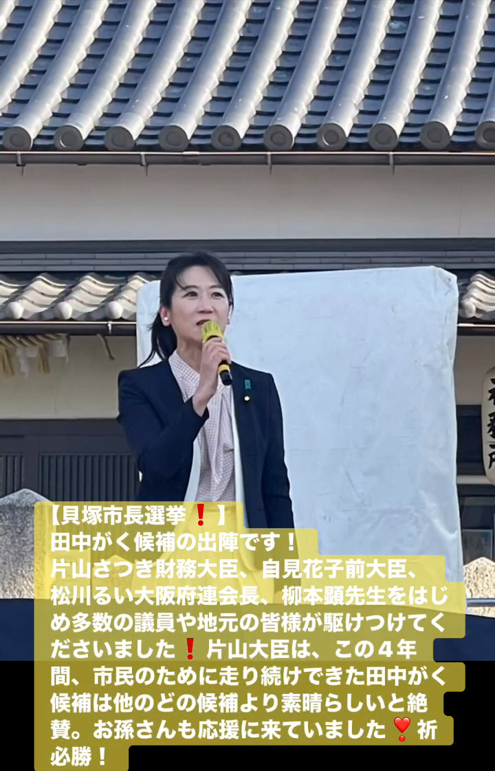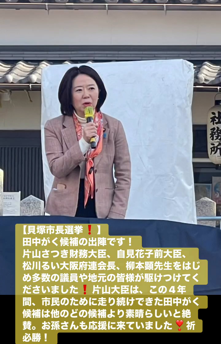 貝塚市長選挙! 1月18日 Posted on 2026年1月18日 15:31:002026年1月19日 田中がく候補の出陣です! 片山さつき財務大臣、自見花子前大臣、松川るい大阪府連会長、柳本顕先生をはじめ多数の議員や地元の皆様が駆けつけてくださいました 片山大臣は、この4年間、市民のために走り続けできた田中がく候補は他のどの候補より素晴らしいと絶賛。お孫さんも応援に来ていました❣祈必勝! のりこの活動日記, 自民党大阪