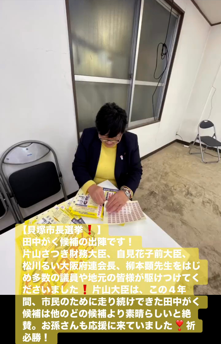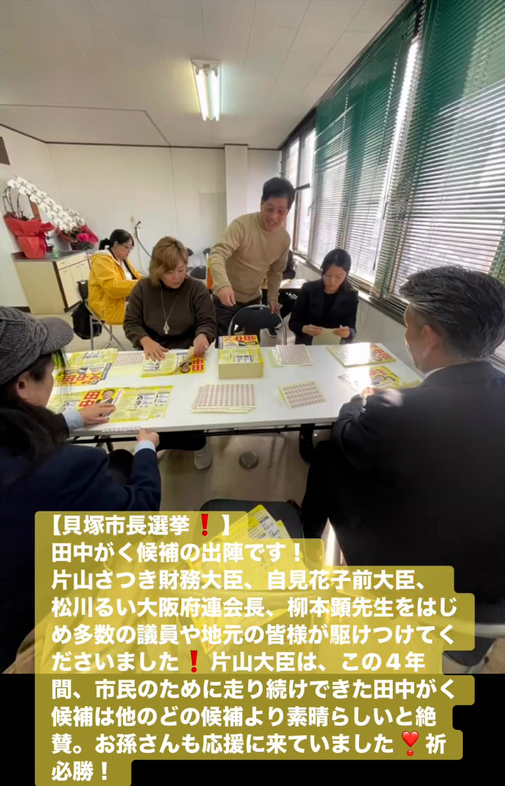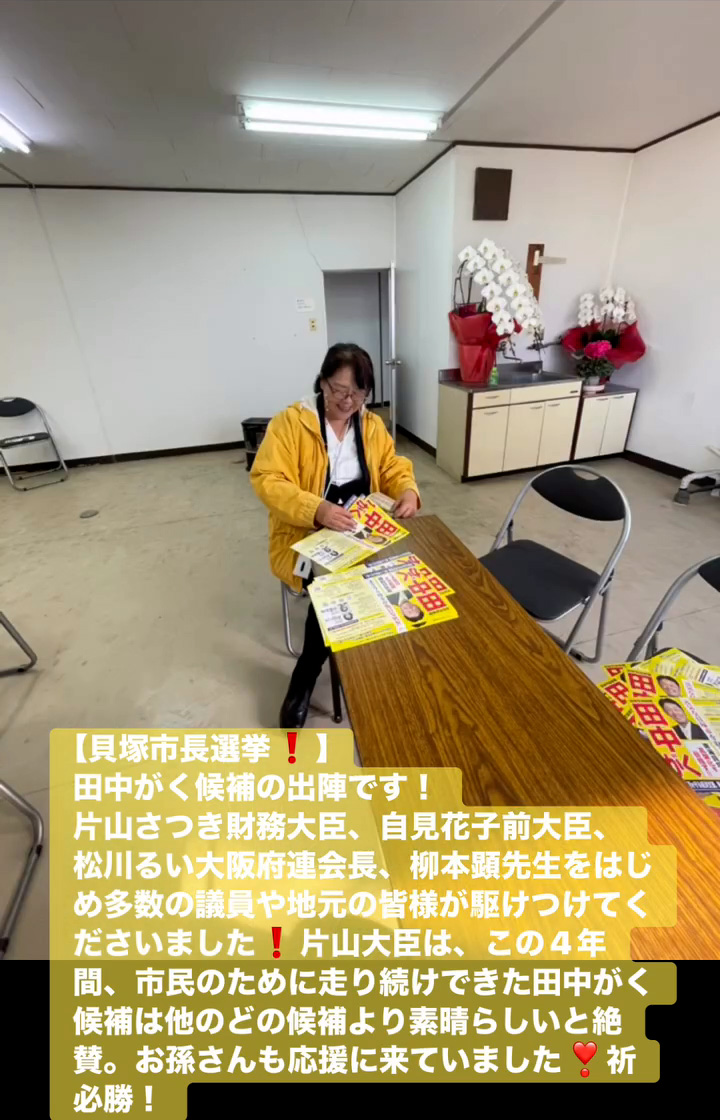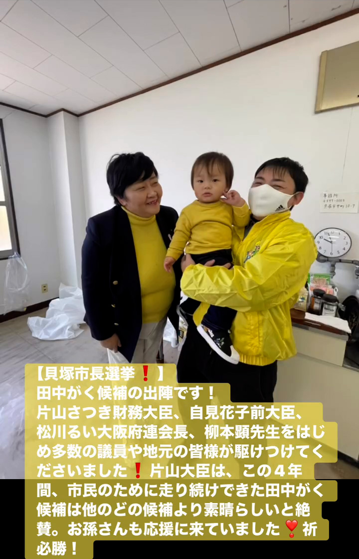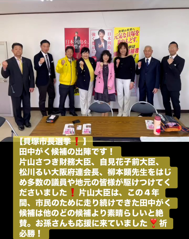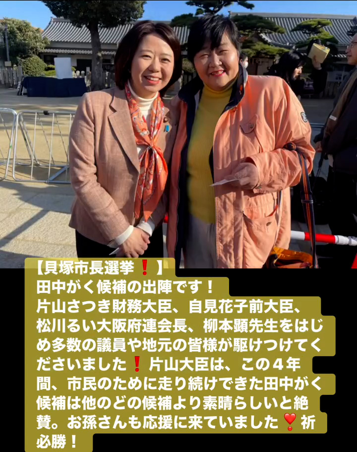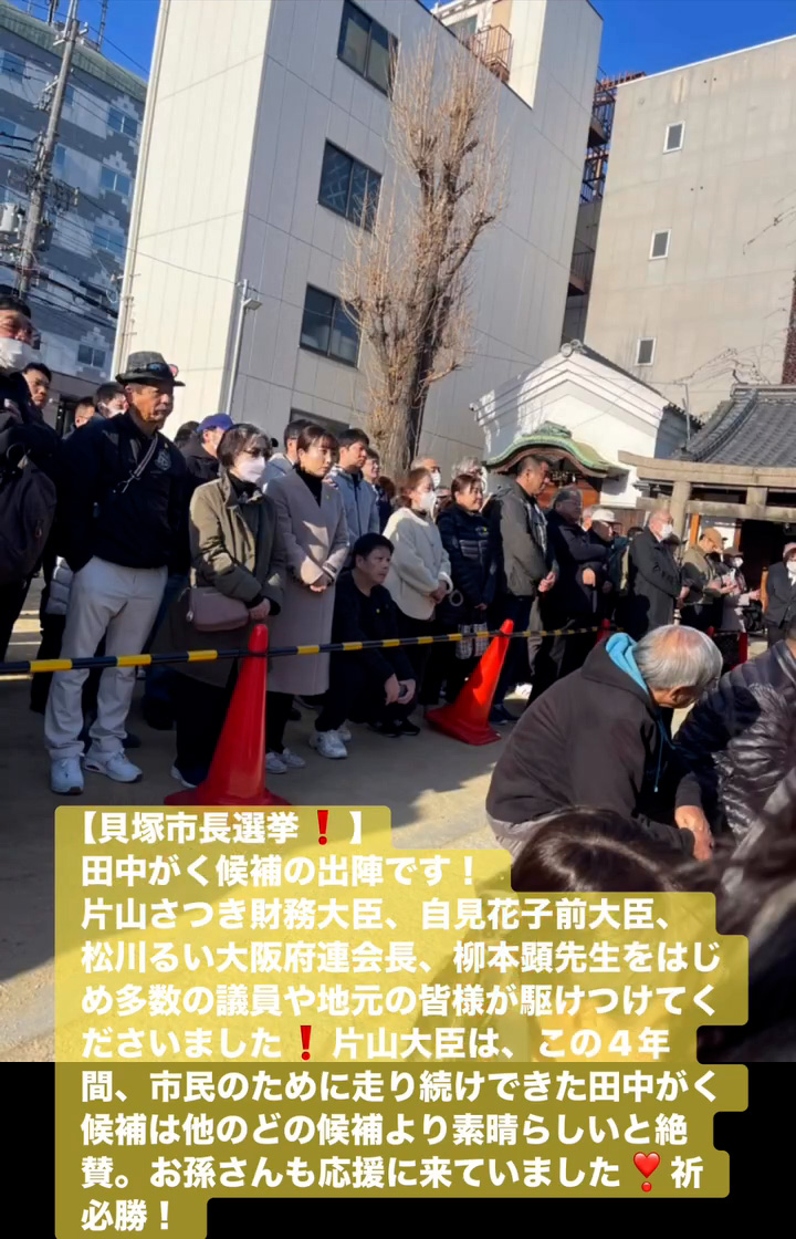 貝塚市長選挙! 1月18日 Posted on 2026年1月18日 15:31:002026年1月19日 田中がく候補の出陣です! 片山さつき財務大臣、自見花子前大臣、松川るい大阪府連会長、柳本顕先生をはじめ多数の議員や地元の皆様が駆けつけてくださいました 片山大臣は、この4年間、市民のために走り続けできた田中がく候補は他のどの候補より素晴らしいと絶賛。お孫さんも応援に来ていました❣祈必勝! のりこの活動日記, 自民党大阪