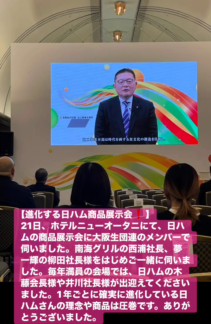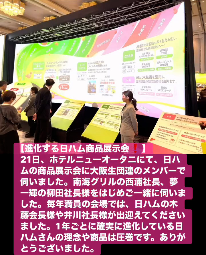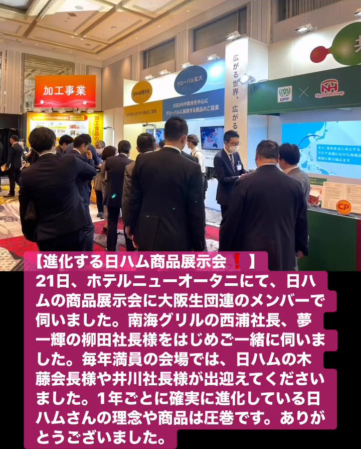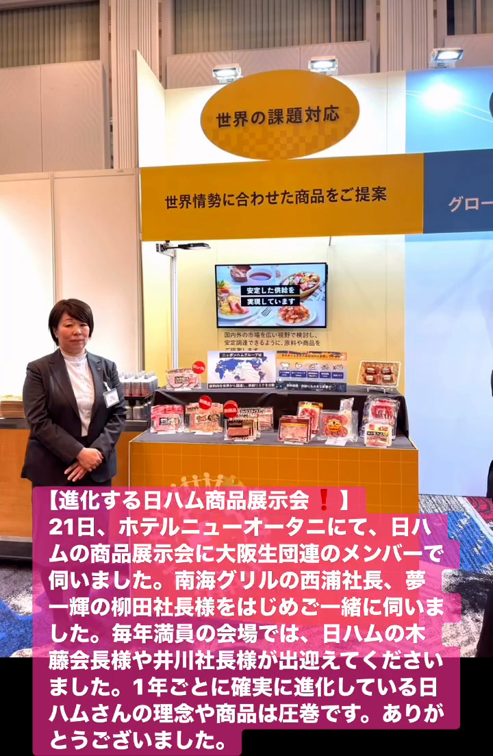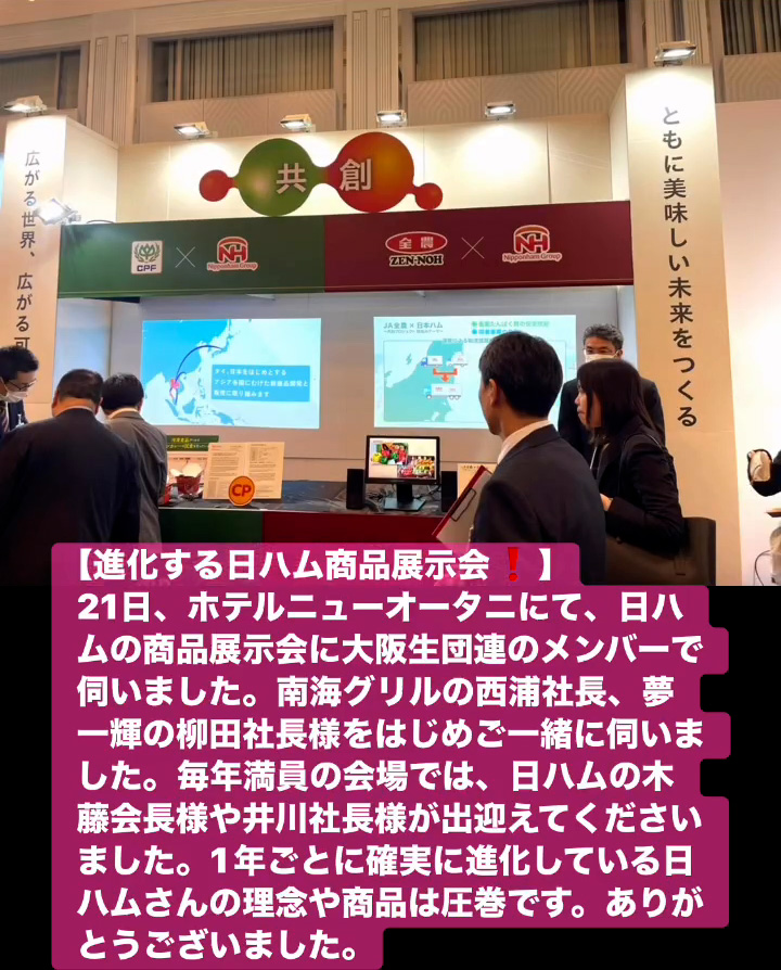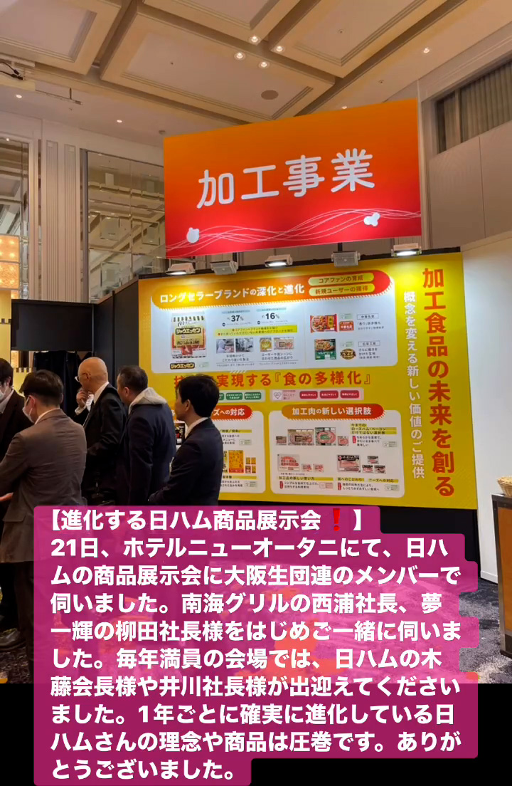 進化する日ハム商品展示会! 1月23日 Posted on 2026年1月23日 08:00:002026年1月23日 21日、ホテルニューオータニにて、日ハムの商品展示会に大阪生団連のメンバーで伺いました。南海グリルの西浦社長、夢一輝の柳田社長様をはじめご一緒に伺いました。毎年満員の会場では、日ハムの木藤会長様や井川社長様が出迎えてくださいました。1年ごとに確実に進化している日ハムさんの理念や商品は圧巻です。ありがとうこざいました。 のりこの活動日記, 大阪生団連