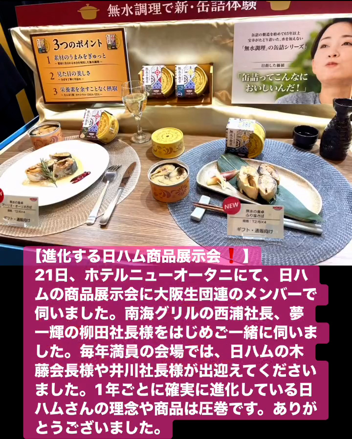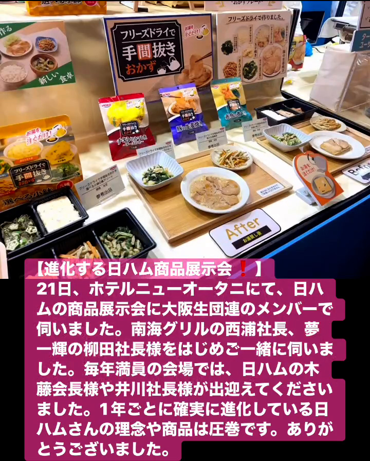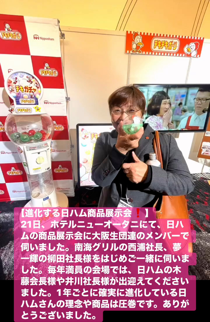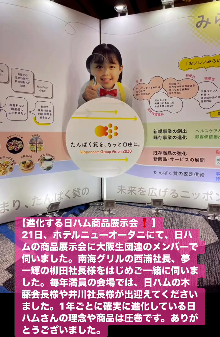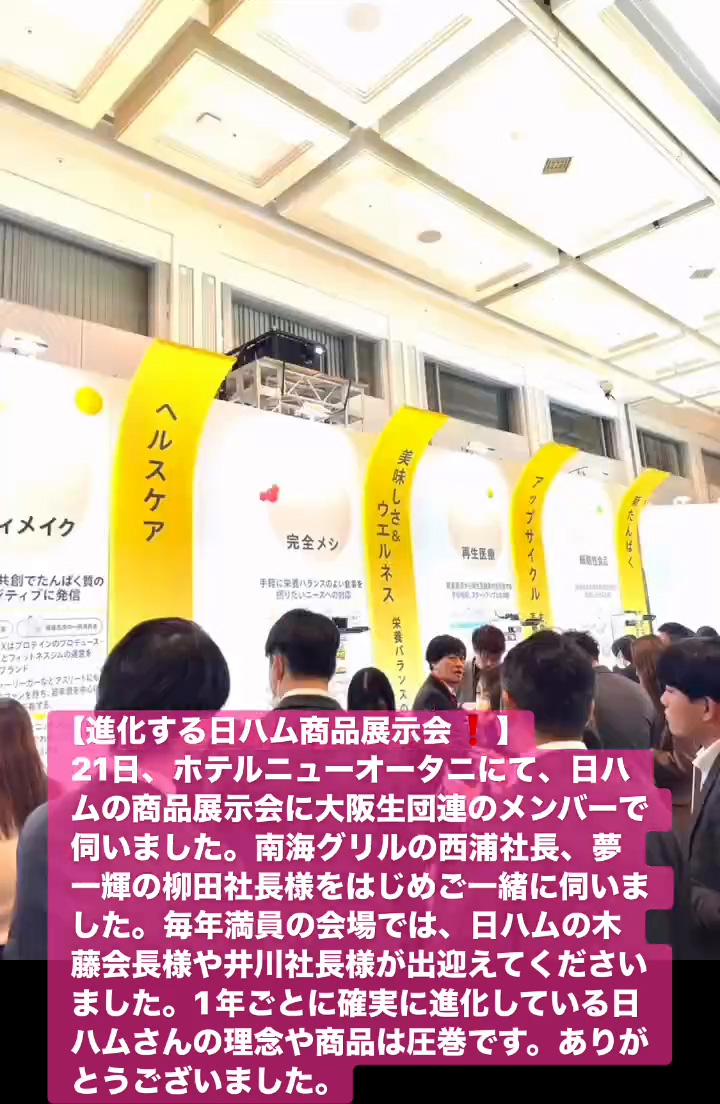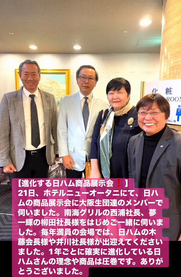 進化する日ハム商品展示会! 1月23日 Posted on 2026年1月23日 08:00:002026年1月23日 21日、ホテルニューオータニにて、日ハムの商品展示会に大阪生団連のメンバーで伺いました。南海グリルの西浦社長、夢一輝の柳田社長様をはじめご一緒に伺いました。毎年満員の会場では、日ハムの木藤会長様や井川社長様が出迎えてくださいました。1年ごとに確実に進化している日ハムさんの理念や商品は圧巻です。ありがとうこざいました。 のりこの活動日記, 大阪生団連