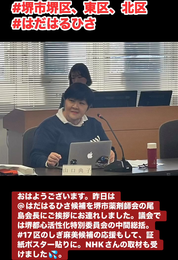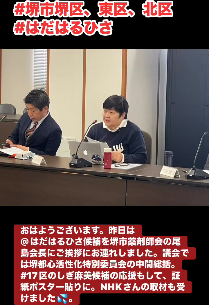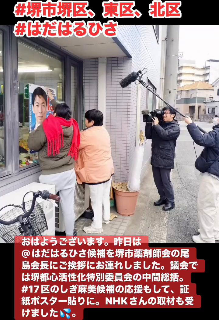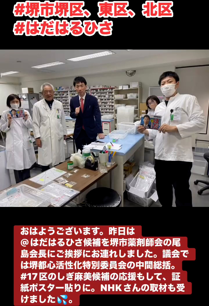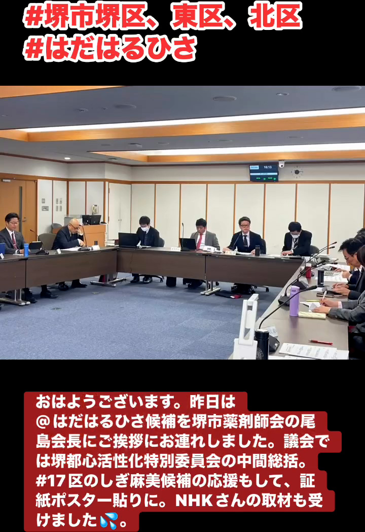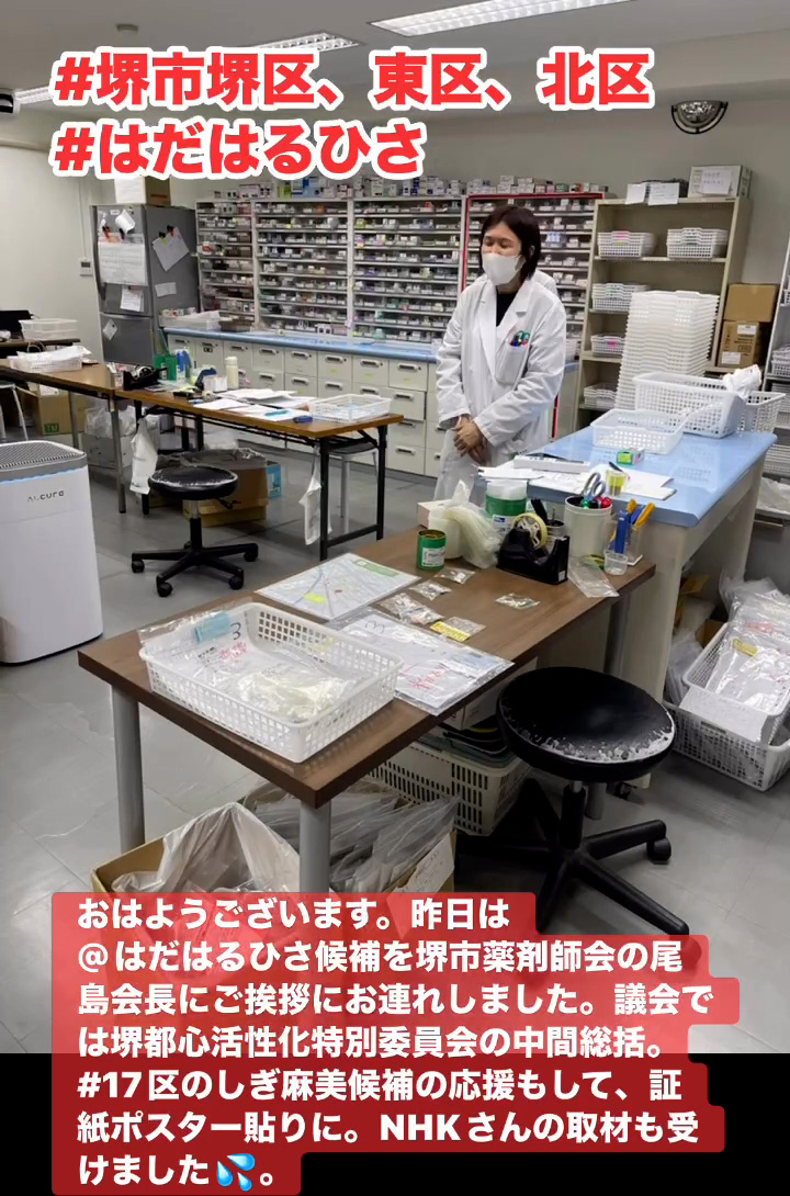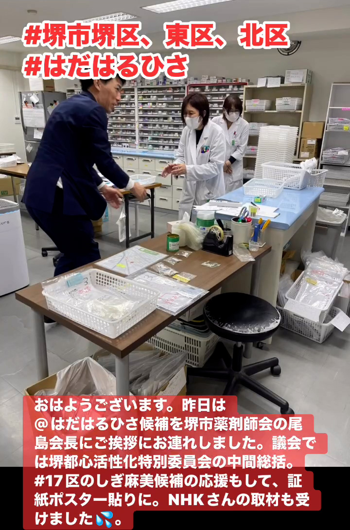 おはようございます。昨日は、はだはるひさ候補を堺市薬剤師会の尾島会長にご挨拶にお連れしました。議会では堺都心活性化特別委員会の中間総括。17区のしぎ麻美候補の応援もして、 証紙ポスター貼りに。 NHK さんの取材も受けました💦。