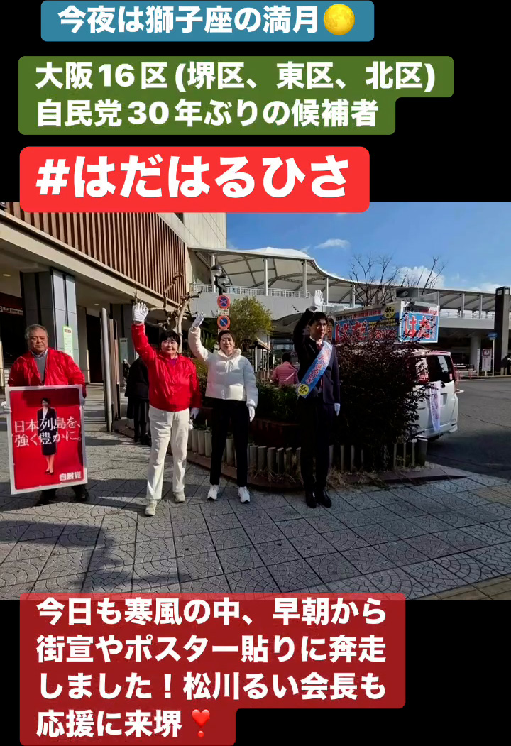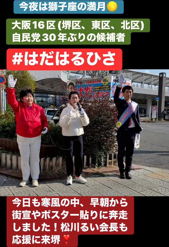 今日も寒風の中、 早朝から街宣やポスター貼りに奔走しました!松川るい会長も応援に来堺❣