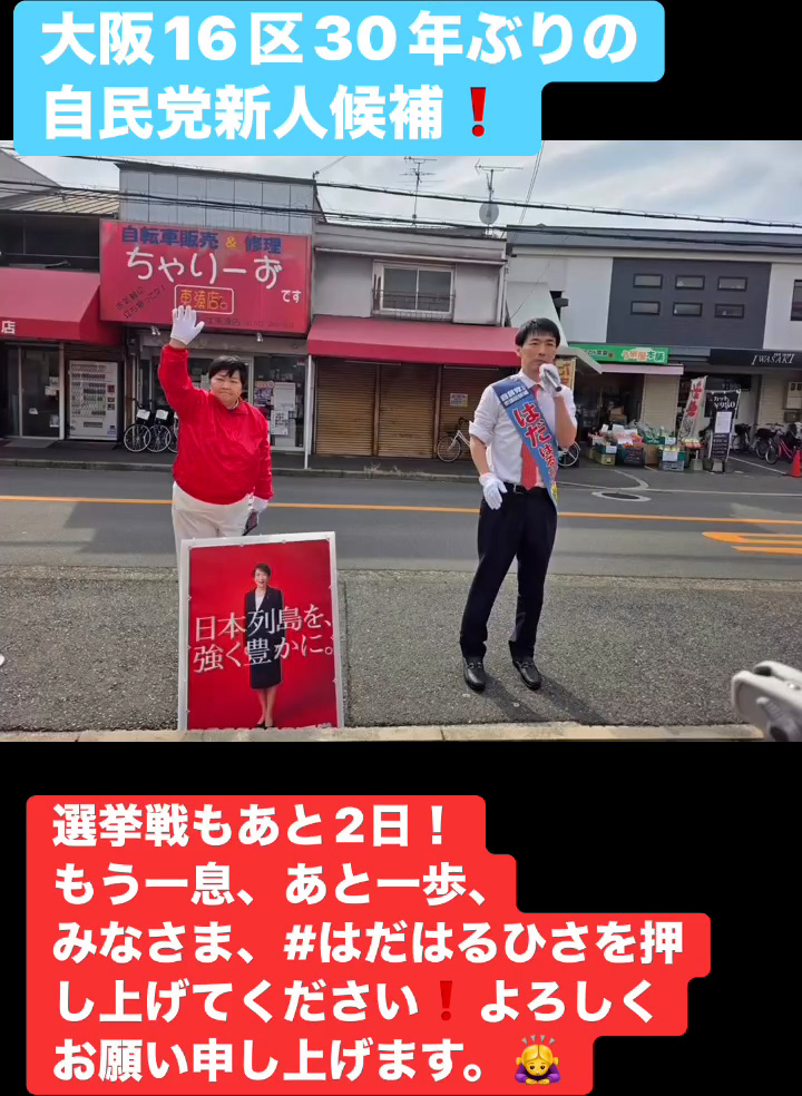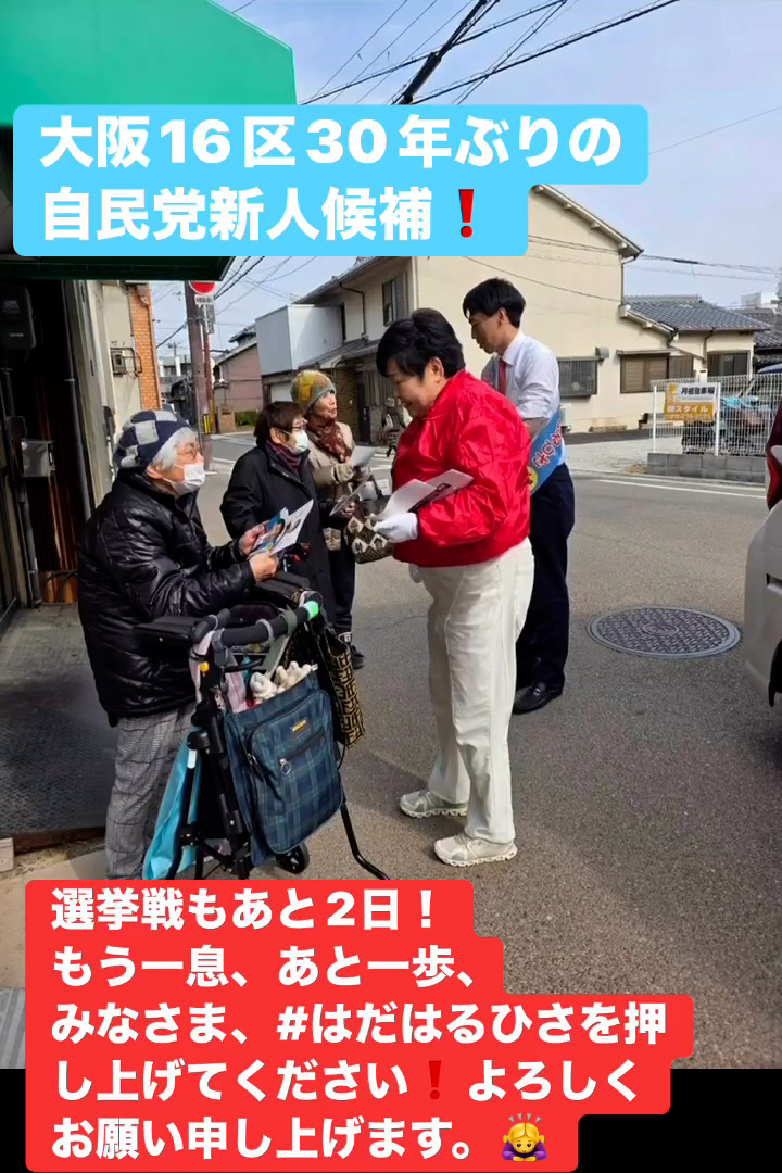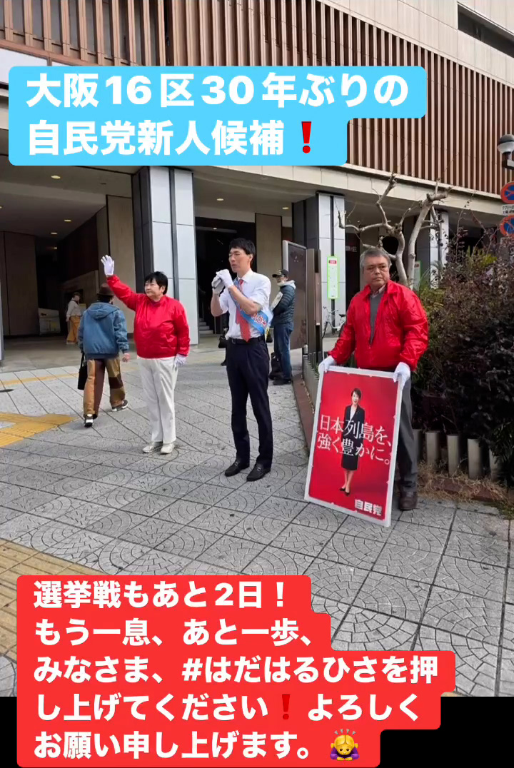 選挙戦もあと2日! 2月6日 Posted on 2026年2月6日 15:01:002026年2月9日 大阪16区30年ぶりの自民党新人候補 選挙戦もあと2日! もう一息、あと一歩、 みなさま、はだはるひさを押し上けてください❗️よろしくお願い申し上げます。🙇♀️ のりこの活動日記, 自民党大阪