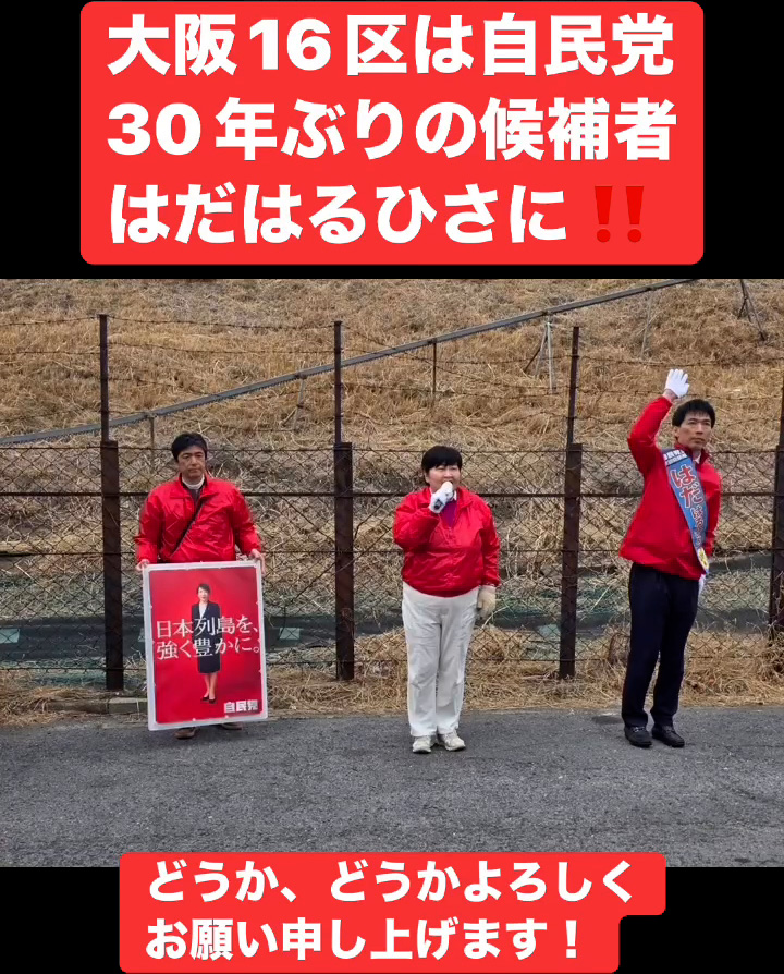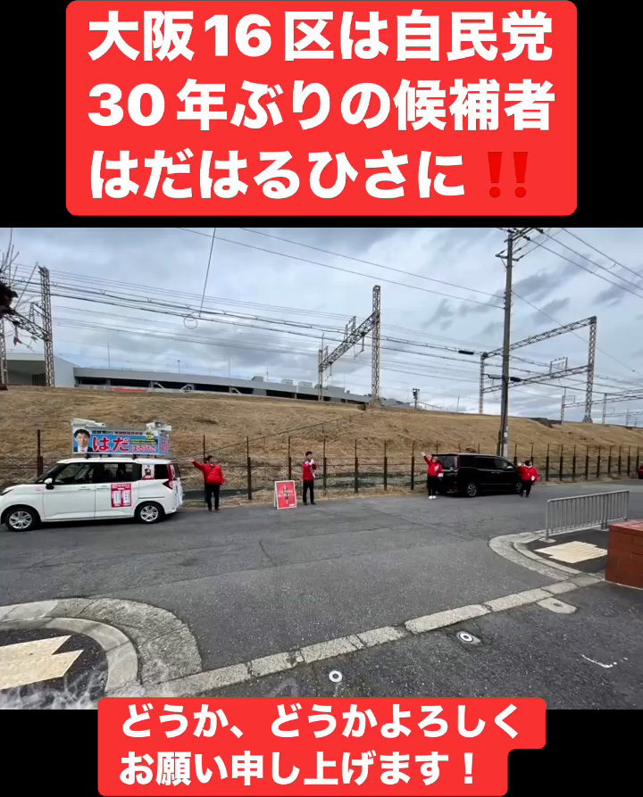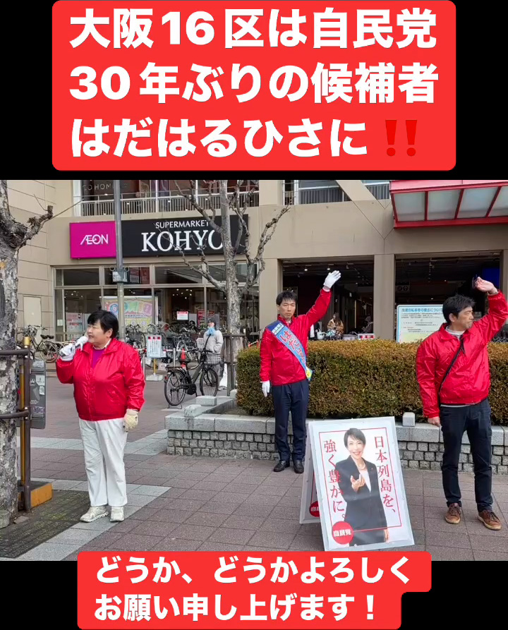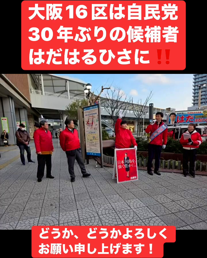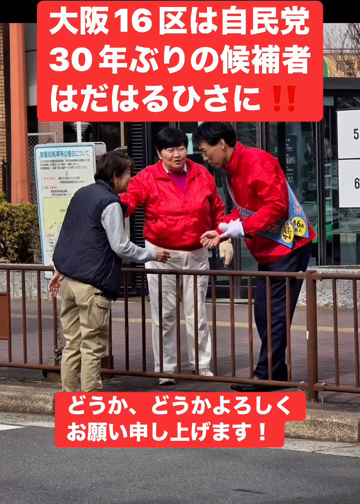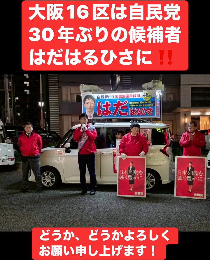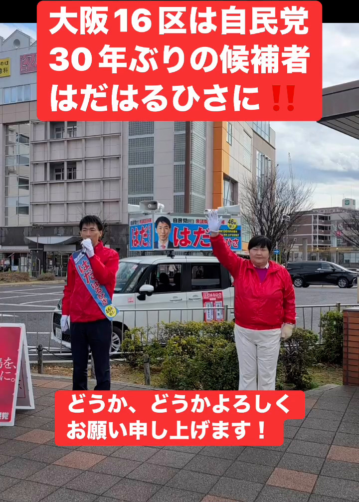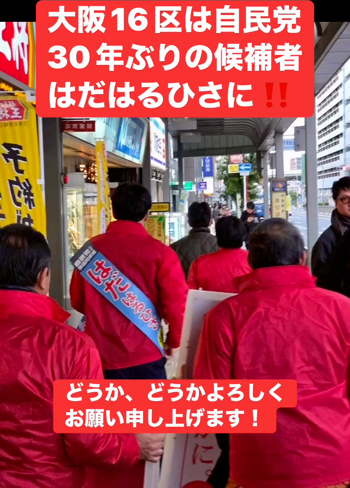大阪16区は自民党30年ぶりの候補者はだはるひさにどうか、どうかよろしくお願い申し上げます!