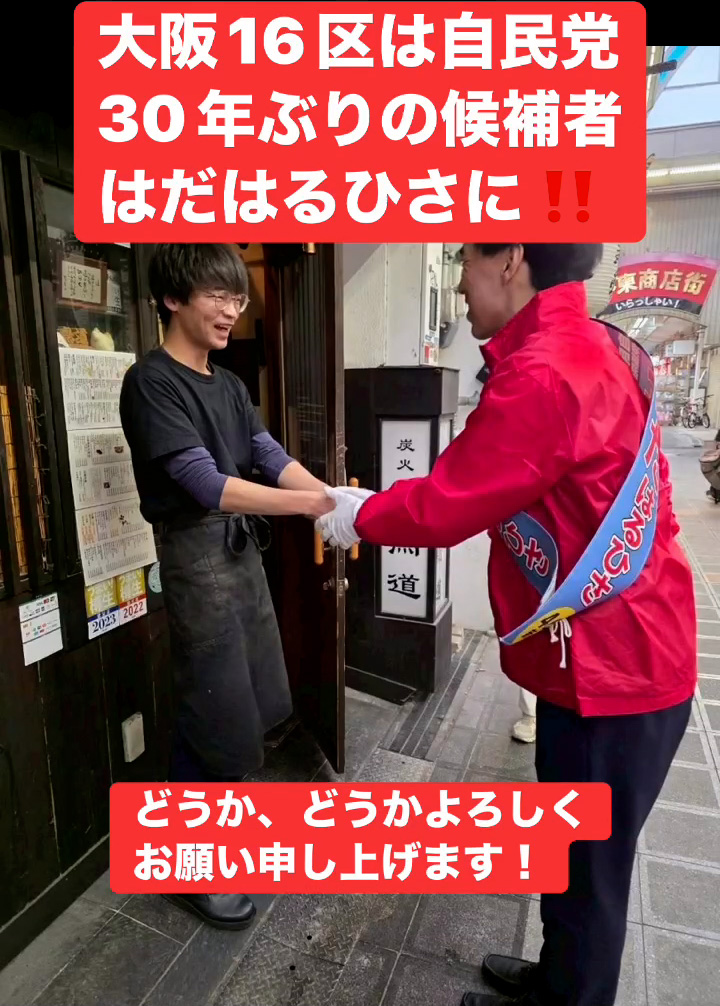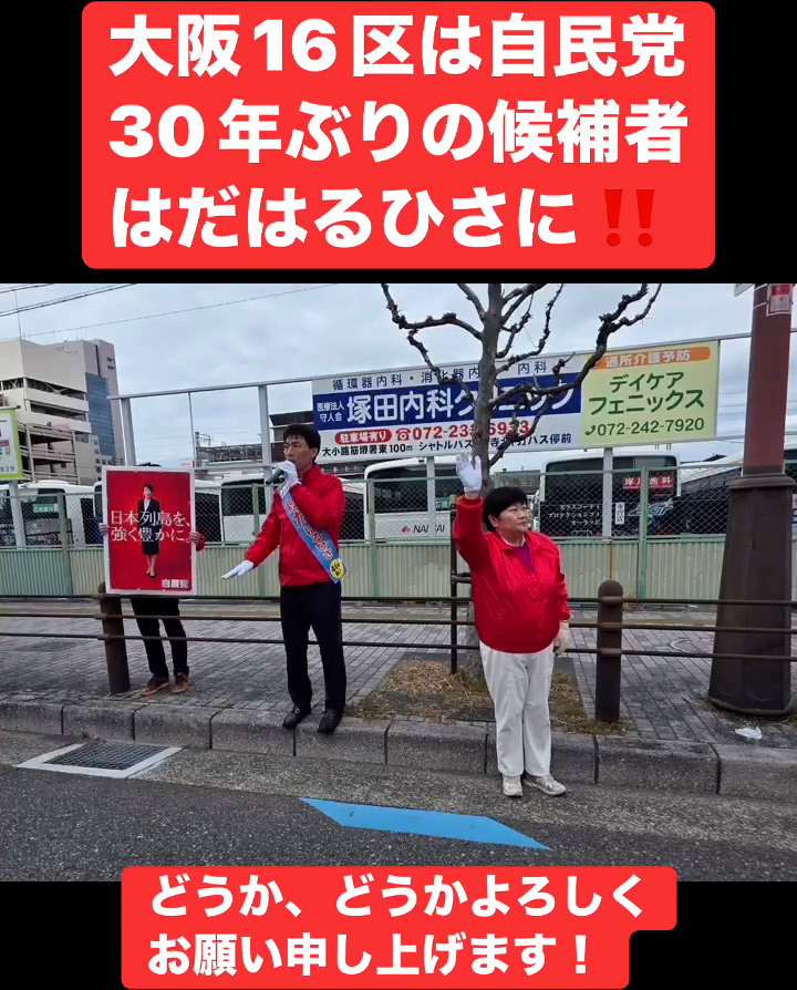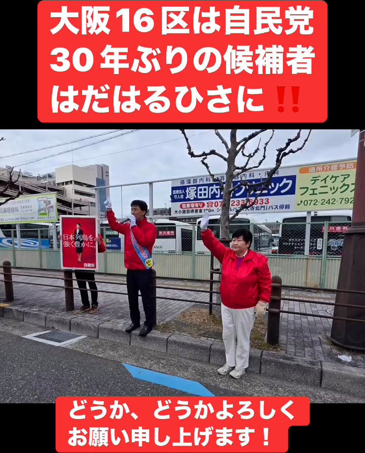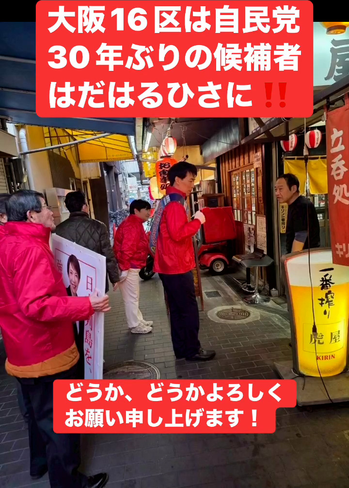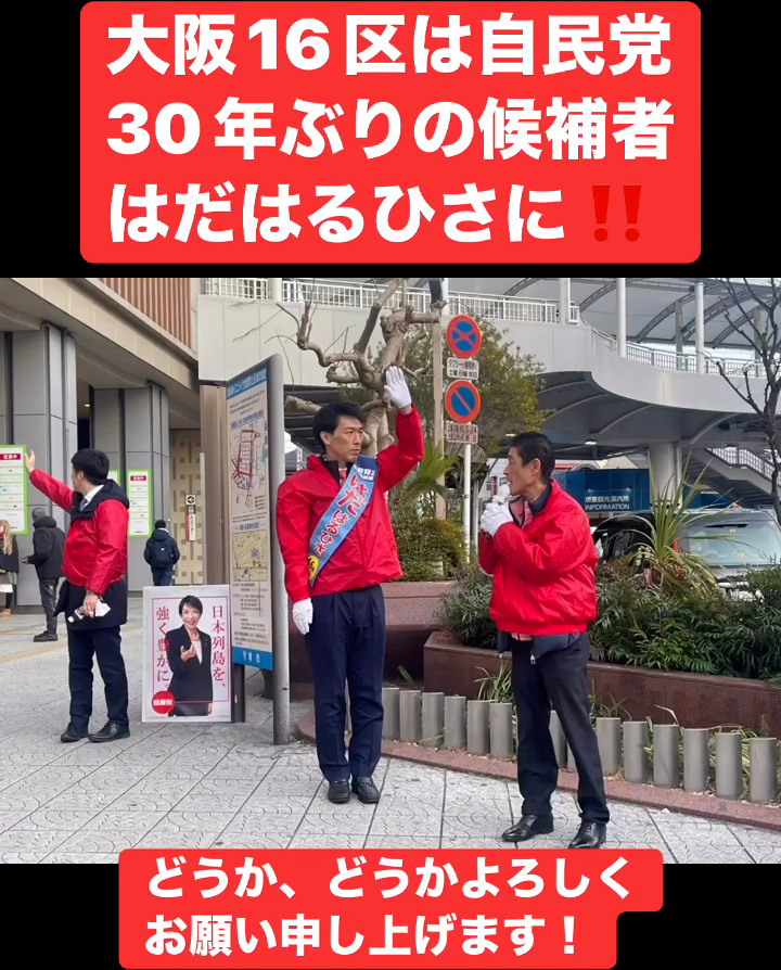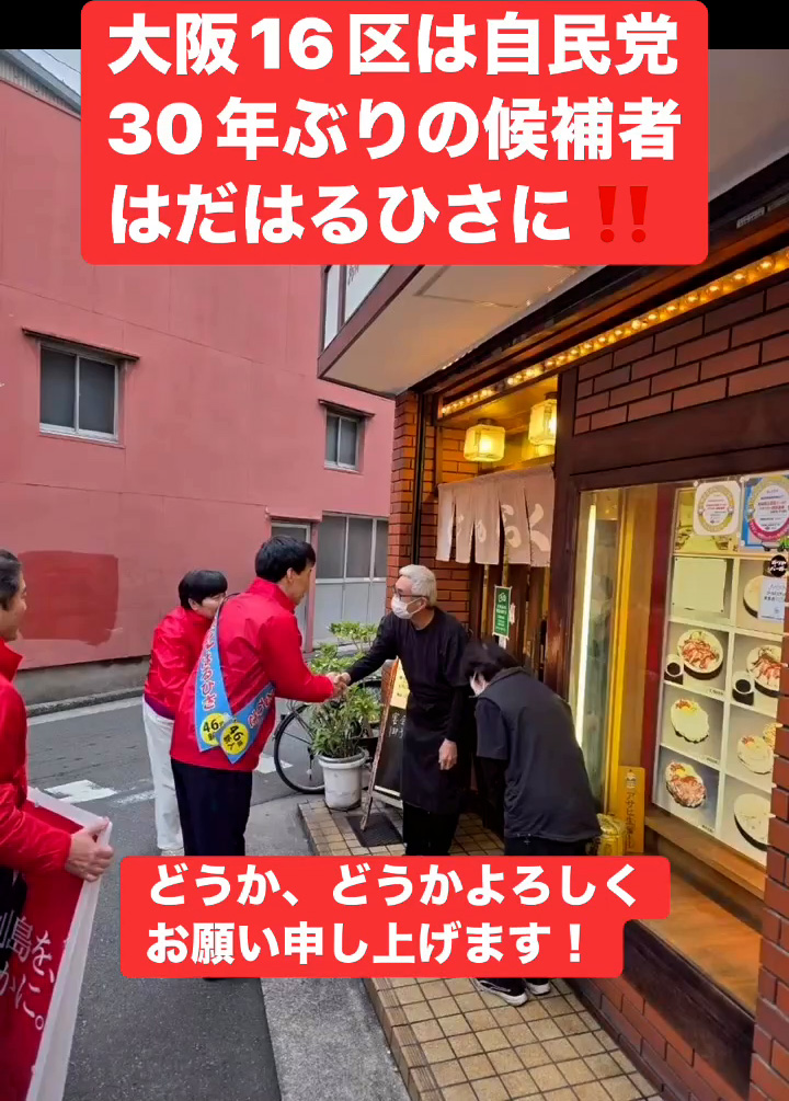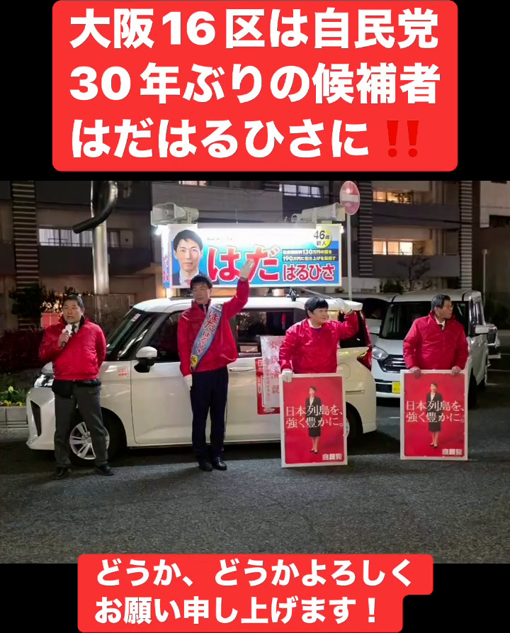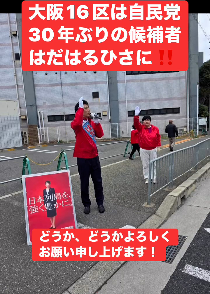 大阪16区は自民党30年ぶりの候補者はだはるひさにどうか、どうかよろしくお願い申し上げます!