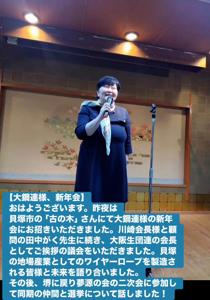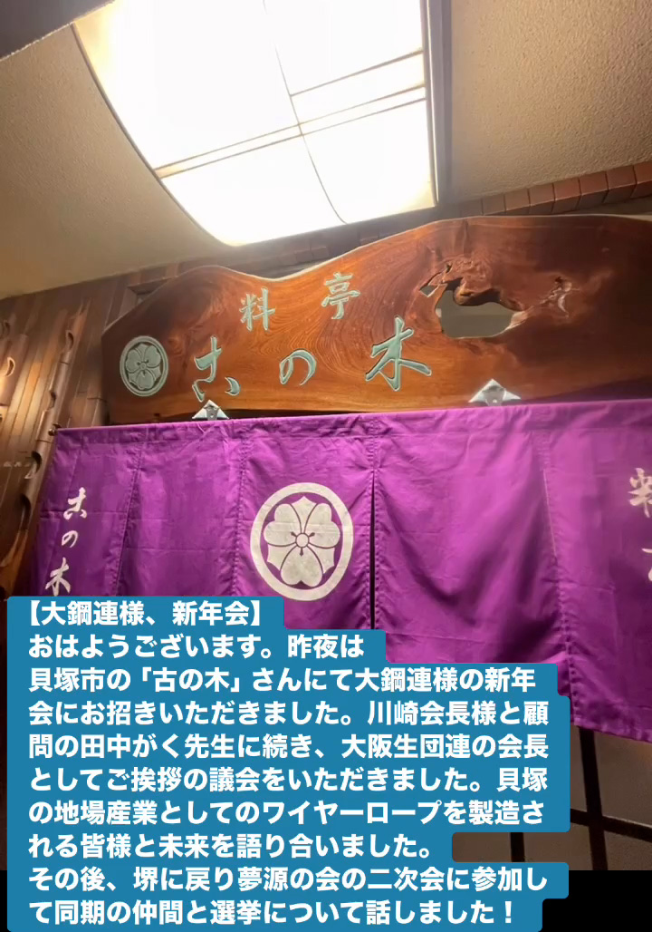おはようございます。昨夜は貝塚市の「古の木」さんにて大鋼連様の新年会にお招きいただきました。川崎会長様と顧問の田中がく先生に続き、大阪生団連の会長としてご挨拶の議会をいただきました。 貝塚の地場産業としてのワイヤーロープを製造される皆様と未来を語り合いました。
