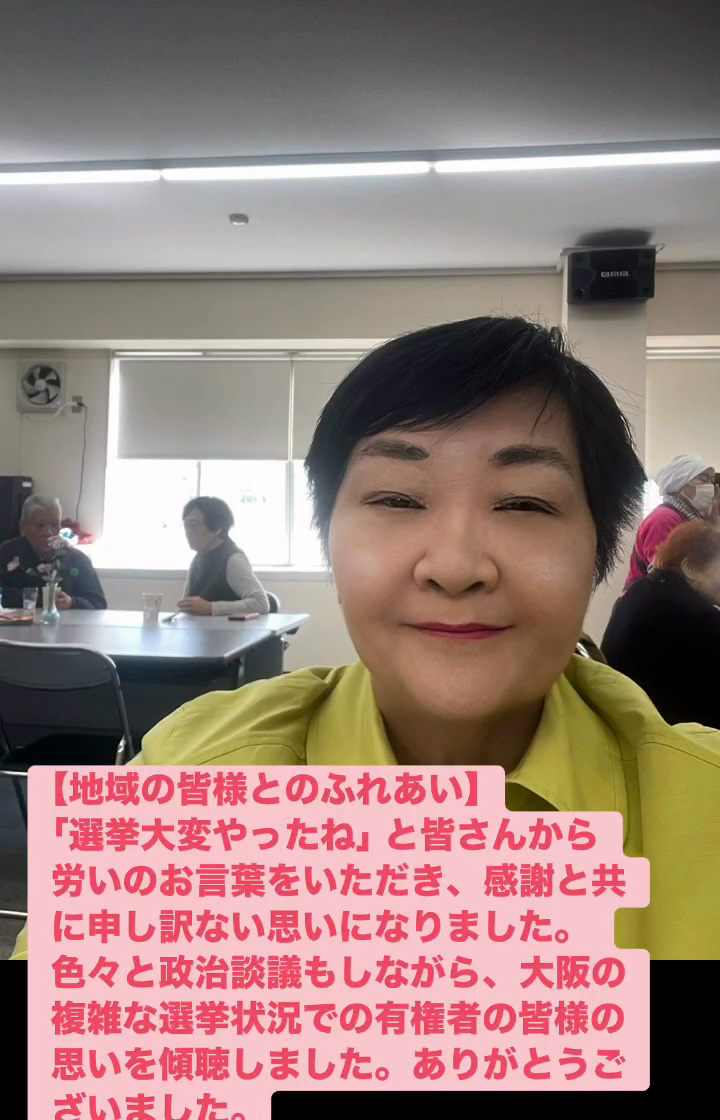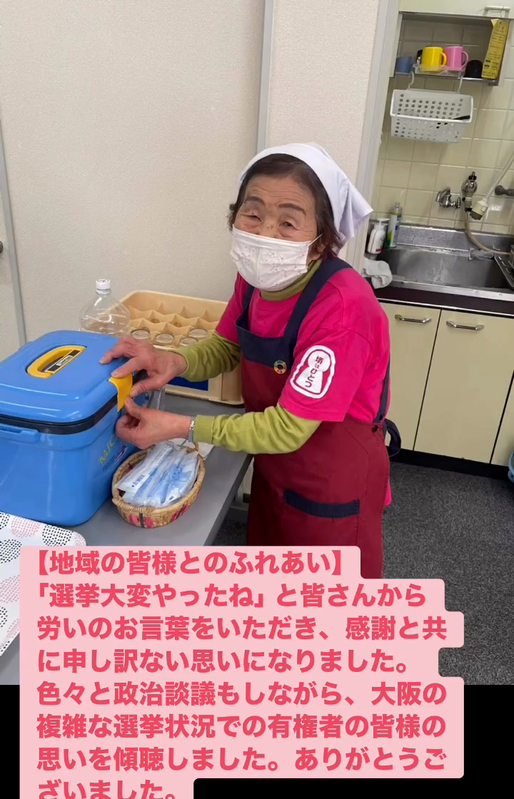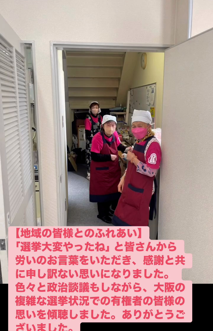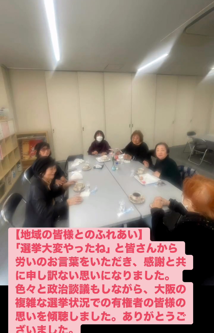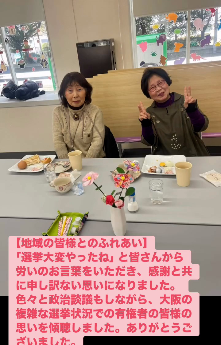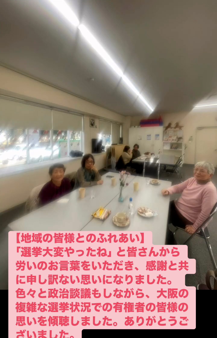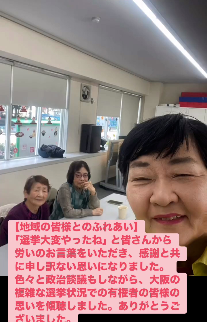 地域の皆様とのふれあい 2月21日 Posted on 2026年2月21日 19:29:002026年2月24日 「選挙大変やったね」と皆さんから労いのお言葉をいただき、感謝と共に申し訳ない思いになりました。色々と政治談議もしながら、大阪の複雑な選挙状況での有権者の皆様の思いを傾聴しました。ありがとうございました。 のりこの活動日記
