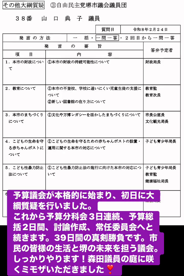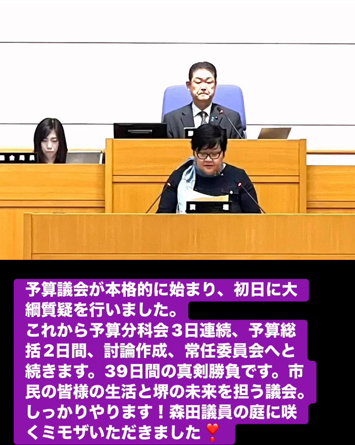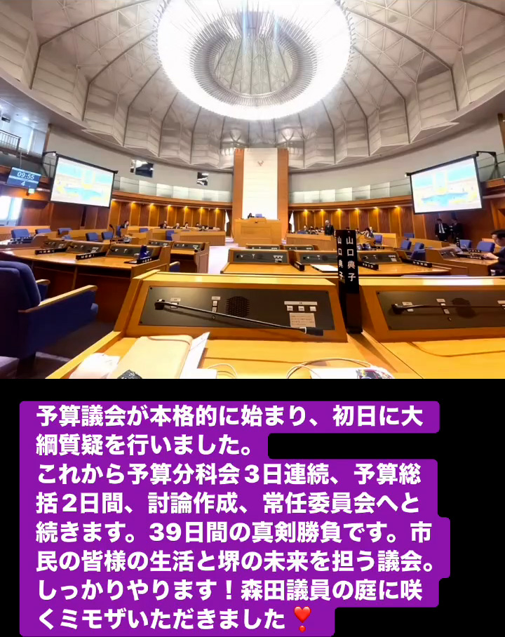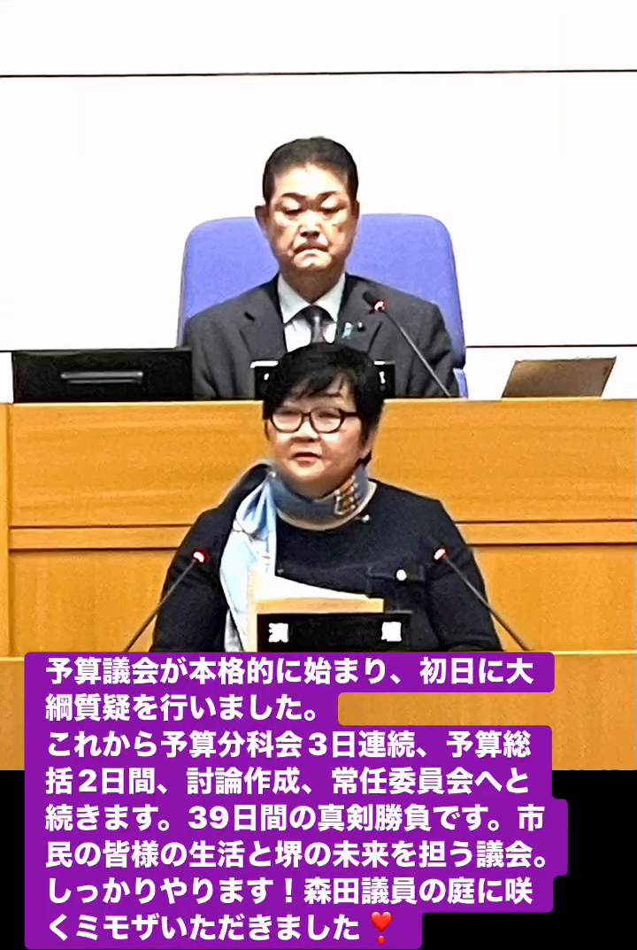 これから予算分科会3日連続、予算総括2日間、討論作成、常任委員会へと続きます。39日間の真剣勝負です。市民の皆様の生活と堺の未来を担う議会。しっかりやります!森田議員の庭に咲くミモザいただきました❣
