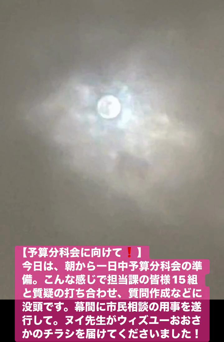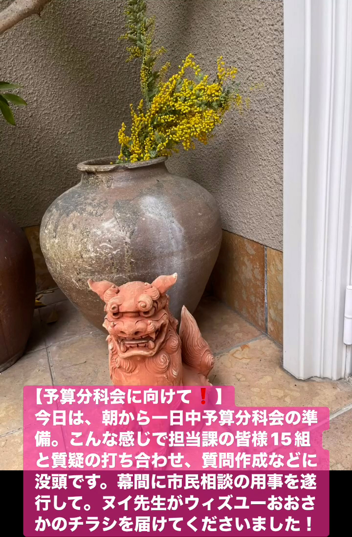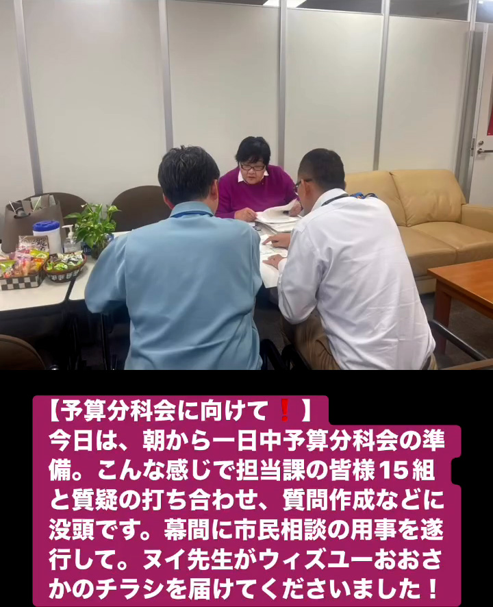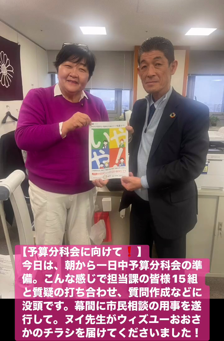 今日は、 朝から一日中予算分科会の準備。 こんな感じで担当課の皆様15組と質疑の打ち合わせ、質問作成などに没頭です。幕間に市民相談の用事を遂行して。 ヌイ先生がウィズユーおおさかのチラシを届けてくださいました!