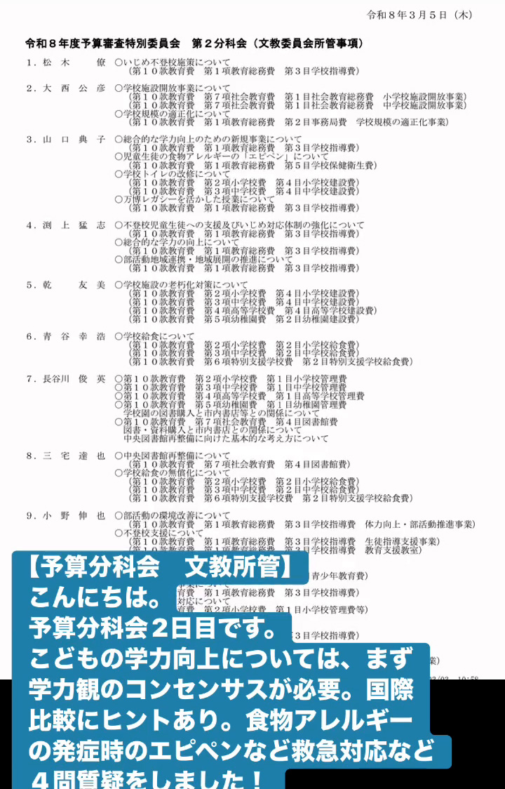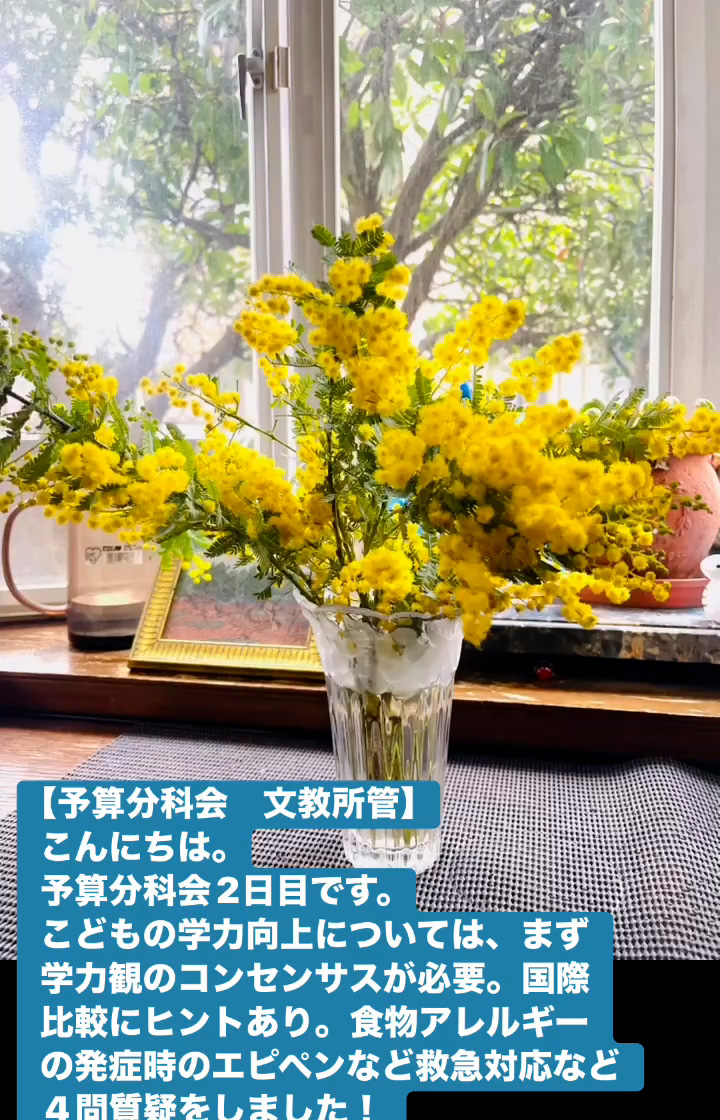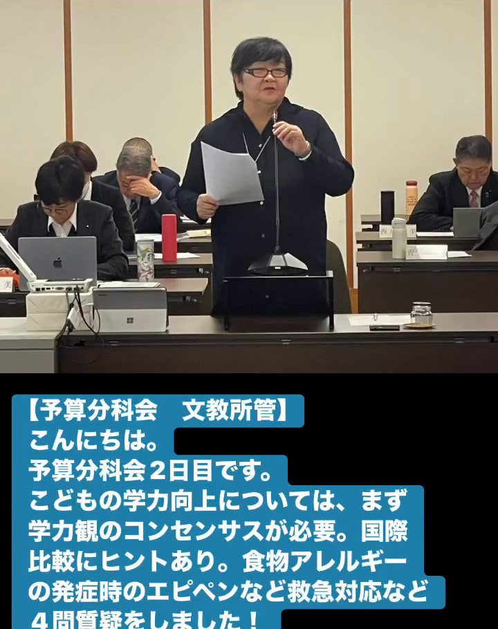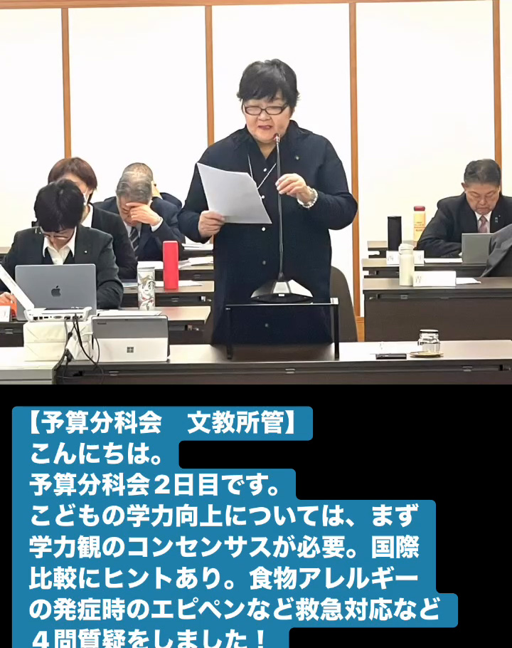 予算分科会 文教所管 3月5日 Posted on 2026年3月5日 12:50:002026年3月6日 こんにちは。 予算分科会2日目です。こどもの学力向上については、まず学力観のコンセンサスが必要。国際比較にヒントあり。食物アレルギーの発症時のエピペンなど救急対応など4問質疑をしました! のりこの活動日記, 議会報告