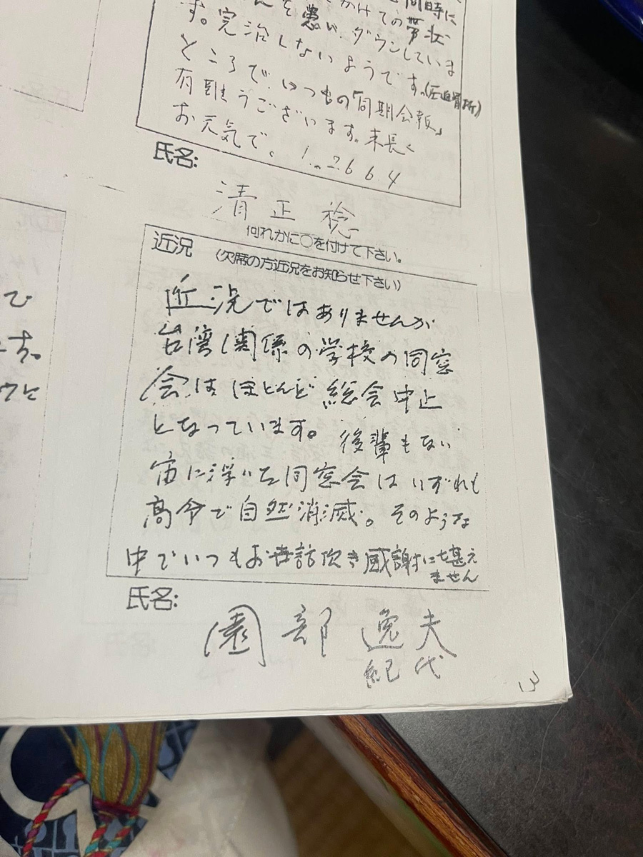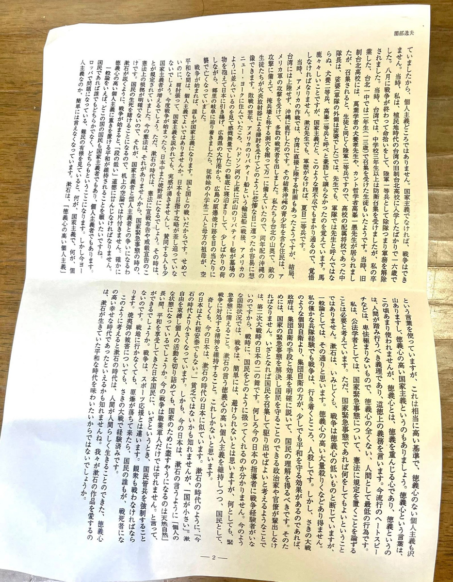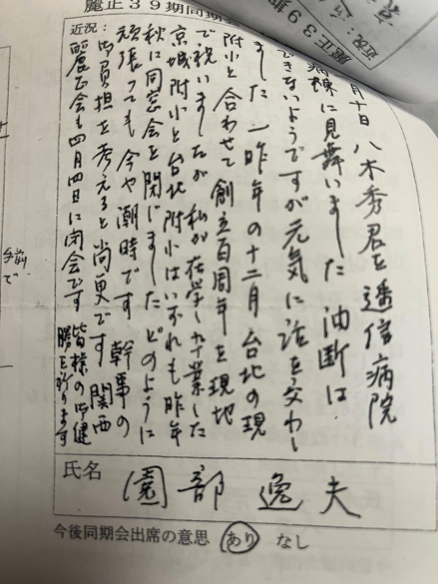 父が台北一中にいた時、同級生に園部逸夫さんがおられました。昨日、伊丹の藤田昇さん宅で、多くの当時の資料のご説明をお聞きしている時、貴重な父の写真や戦後の同窓会などの記録を見つけることができます。その中に、元最高裁判事であられた、園部逸夫さんの投稿文を発見。京都漱石の會の2016年4月発行の会報『虞美人草』です。写真に掲載しましたので、ぜひご覧になってください。