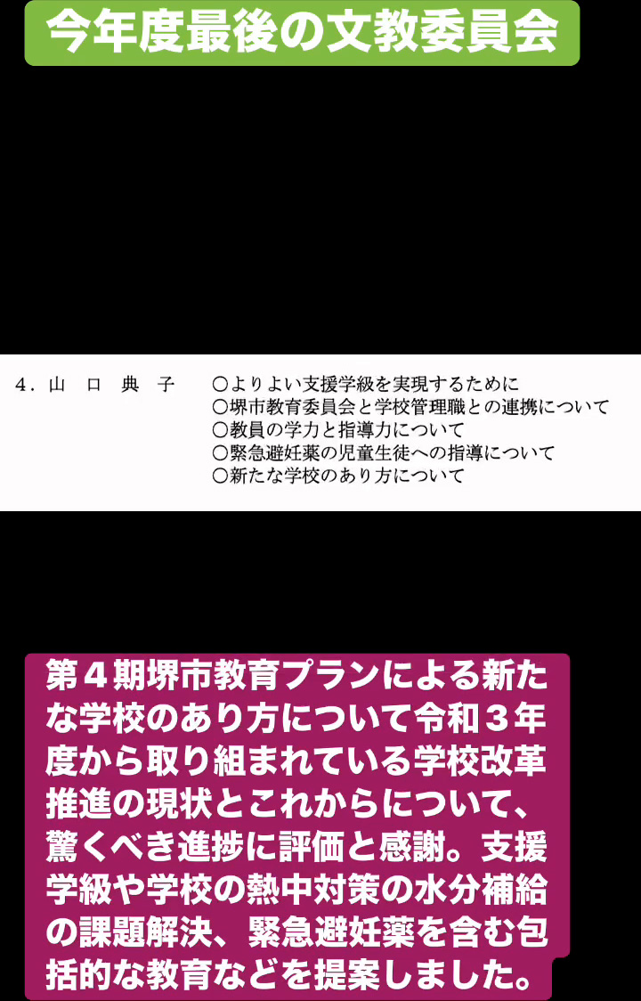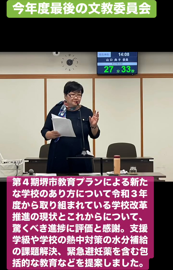 今年度最後の文教委員会 3月19日 Posted on 2026年3月19日 07:28:002026年3月19日 第4期堺市教育プランによる新たな学校のあり方について令和3年度から取り組まれている学校改革推進の現状とこれからについて、驚くべき進捗に評価と感謝。支援学級や学校の熱中対策の水分補絵の課題解決、緊急避妊薬を含む包括的な教育などを提案しました。 のりこの活動日記, 議会報告