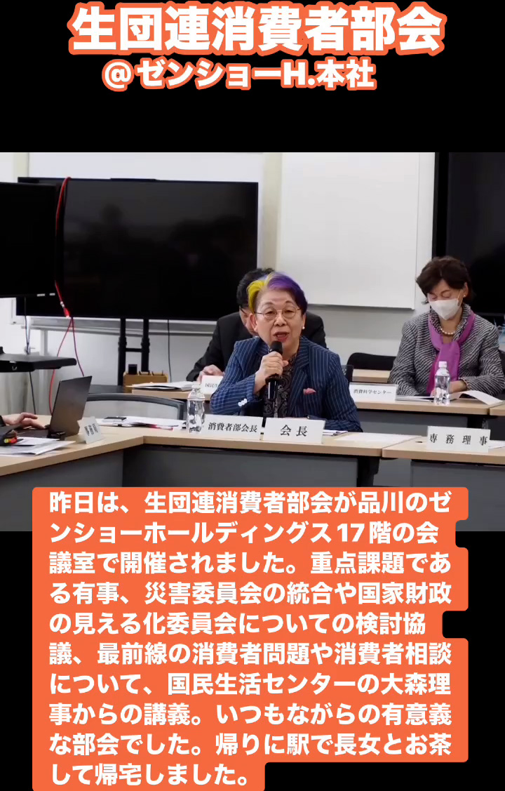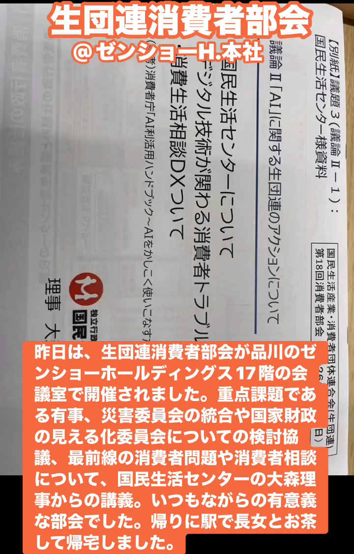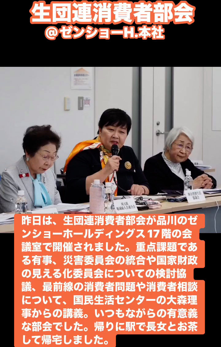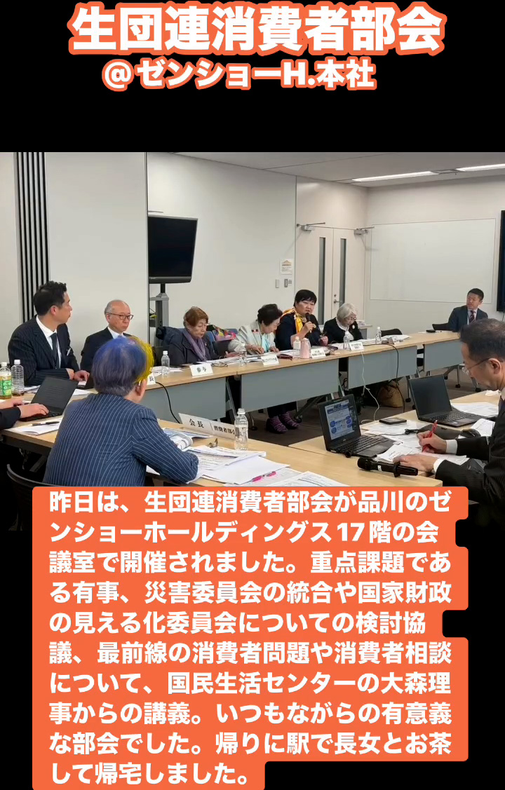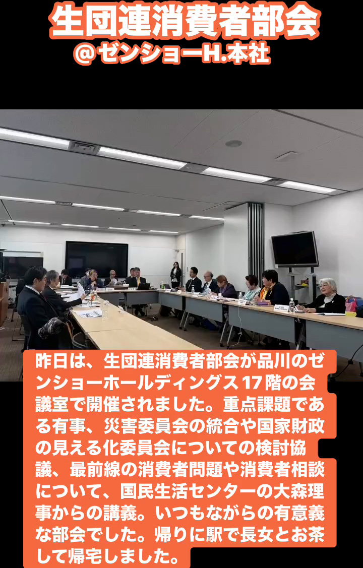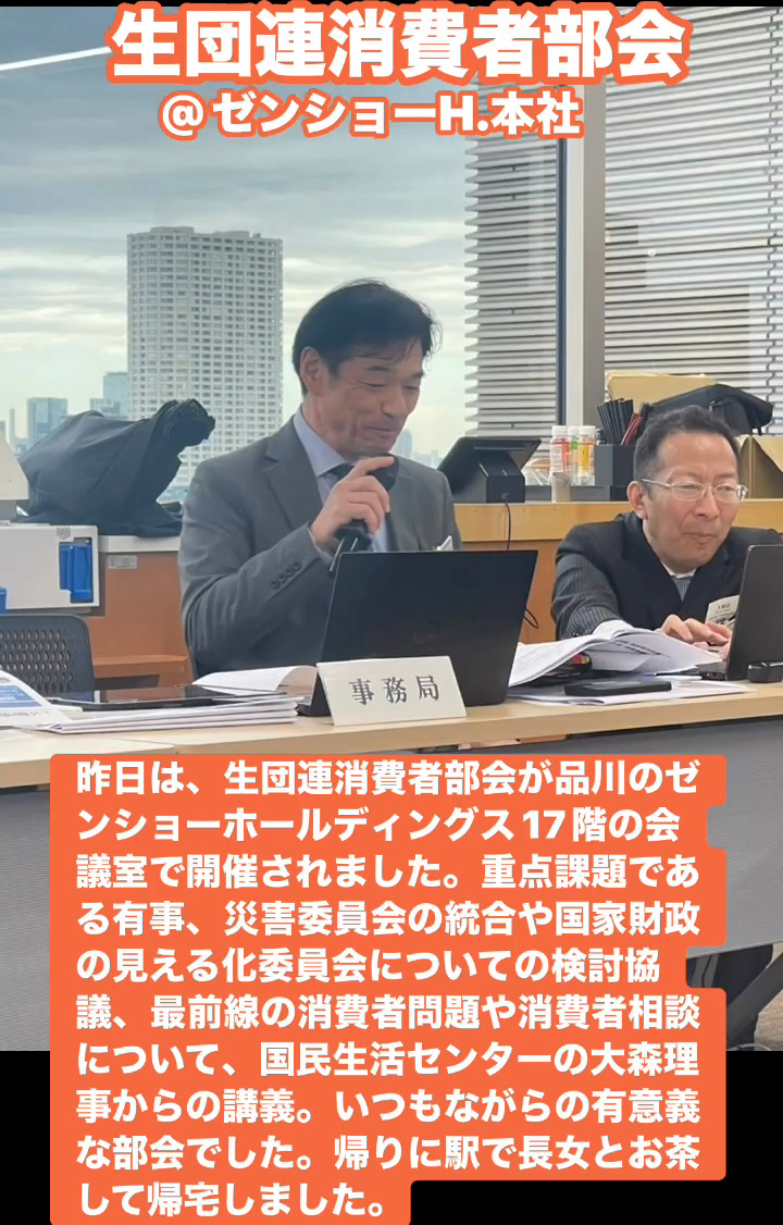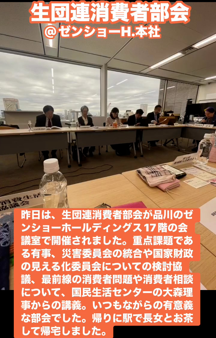 生団連消費者部会@ゼンショーH.本社 3月20日 Posted on 2026年3月20日 08:50:002026年3月23日 昨日は、生団連消費者部会が品川のゼンショーホールディングス17階の会議室で開催されました。重点課題である有事、災害委員会の統合や国家財政の見える化委員会についての検討協議、最前線の消費者問題や消費者相談について、国民生活センターの大森理事からの講義。いつもながらの有意義な部会でした。帰りに駅で長女とお茶して帰宅しました。 のりこの活動日記, 生団連