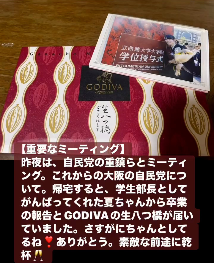 昨夜は、自民党の重鎮らとミーティング。これからの大阪の自民党について。帰宅すると、学生部長としてがんばってくれた夏ちゃんから卒業の報告とGODIVAの生八つ橋が届いていました。さすがにちゃんとしてるね❣ありがとう。素敵な前途に乾杯🥂