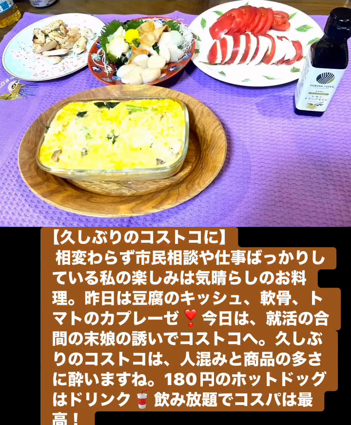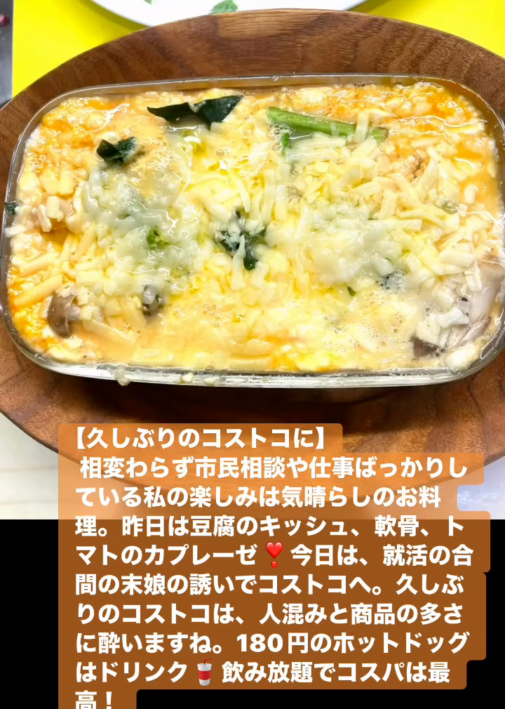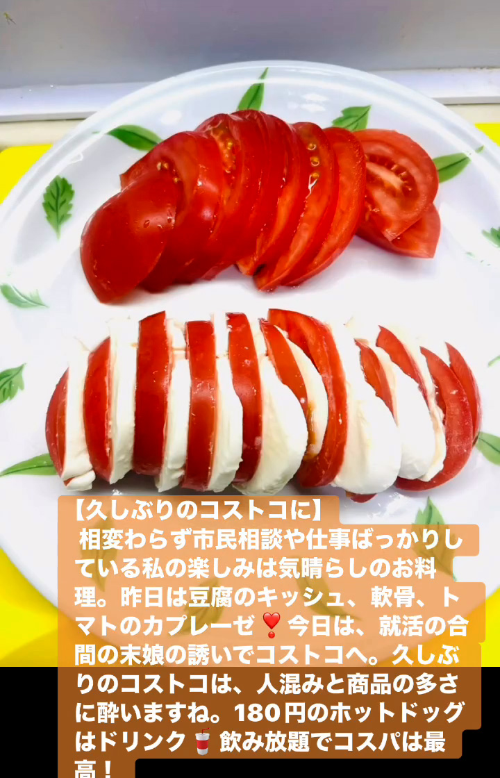 久しぶりのコストコに 4月1日 Posted on 2026年4月1日 22:22:002026年4月3日 相変わらず市民相談や仕事ばっかりしている私の楽しみは気晴らしのお料理。昨日は豆腐のキッシュ、軟骨、トマトのカプレーゼ❣今日は、 就活の合間の末娘の誘いでコストコヘ。 久しぶりのコストコは、 人混みと商品の多さに酔いますね。 180円のホットドッグはドリンク🧃飲み放題でコスパは最高! のりこの活動日記, のりこの部屋