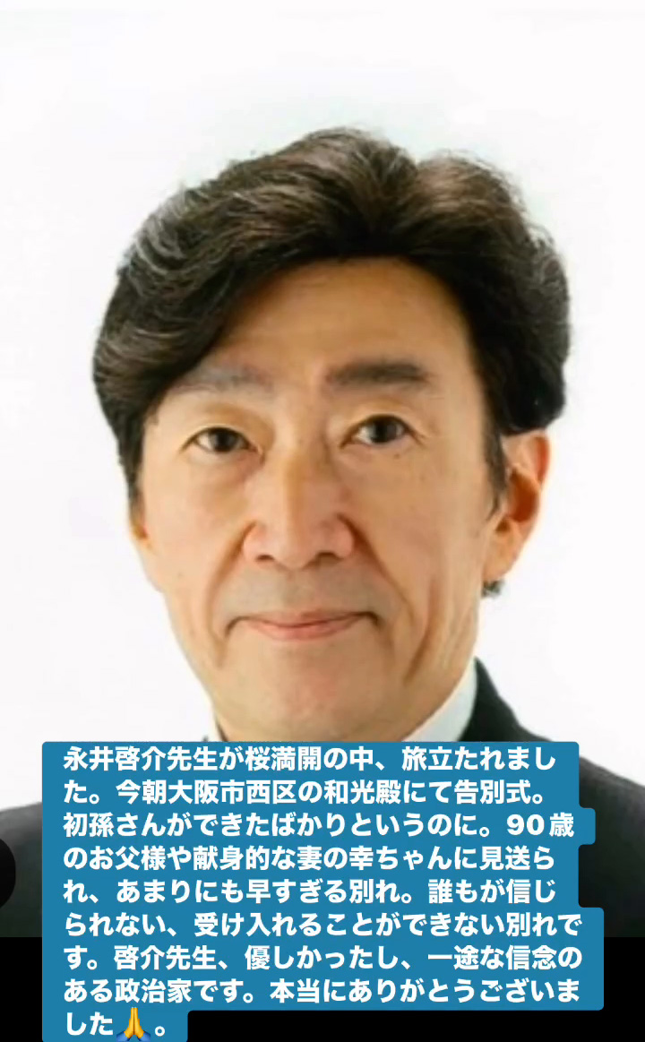 初孫さんができたはかりというのに。90歳のお父様や献身的な妻の幸ちゃんに見送られ、あまりにも早すぎる別れ。誰もが信じられない、受け入れることができない別れです。啓介先生、優しかったし、一途な信念のある政治家です。本当にありがとうこざいました🙏。