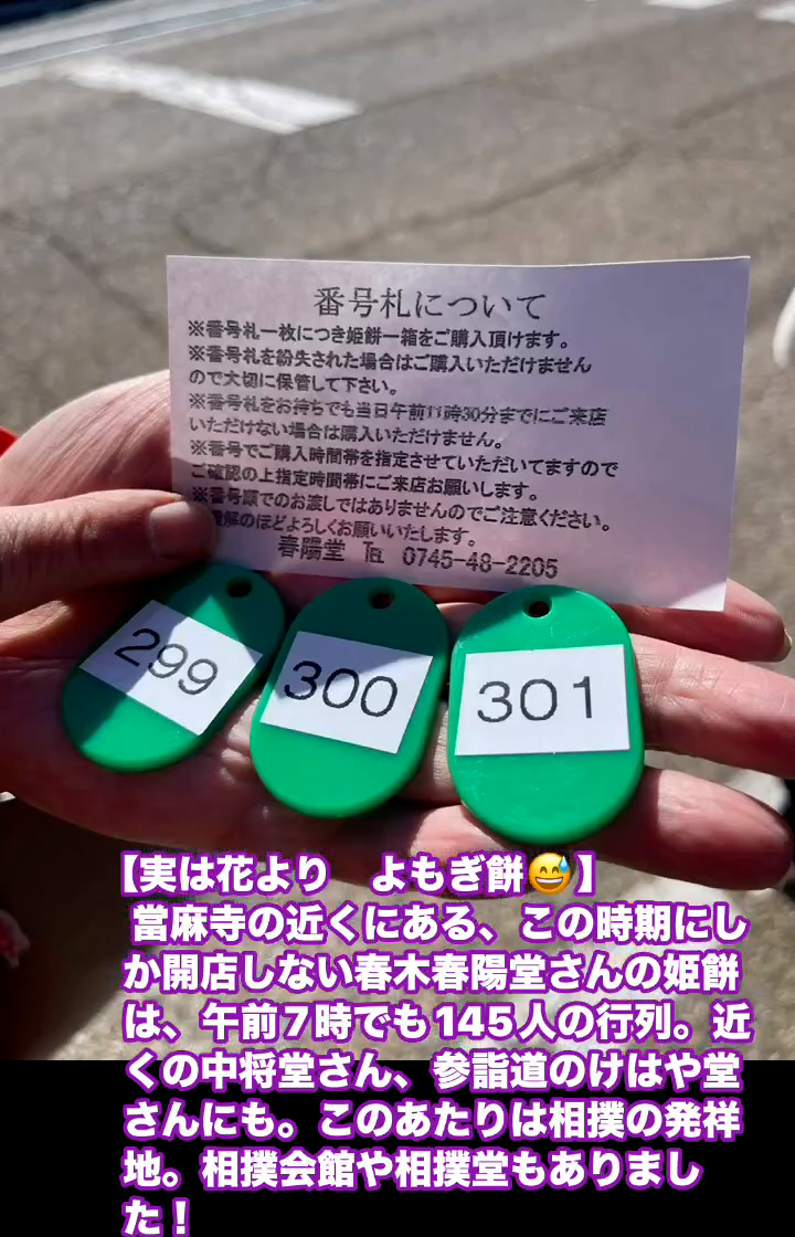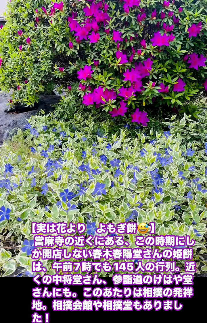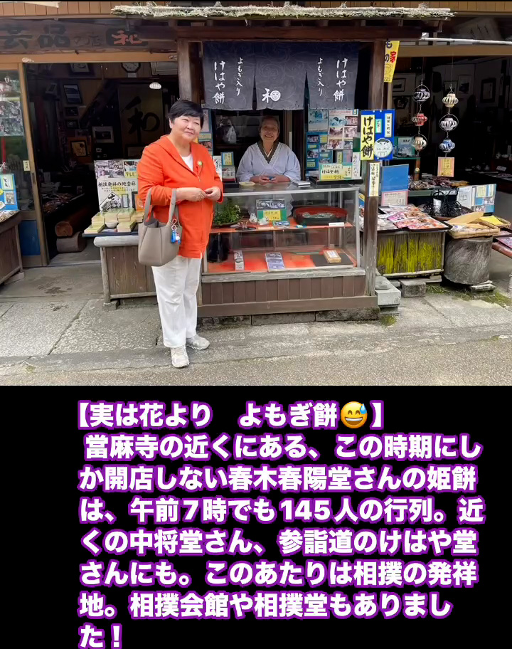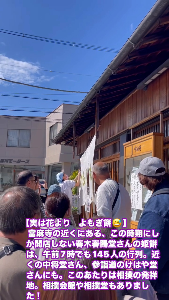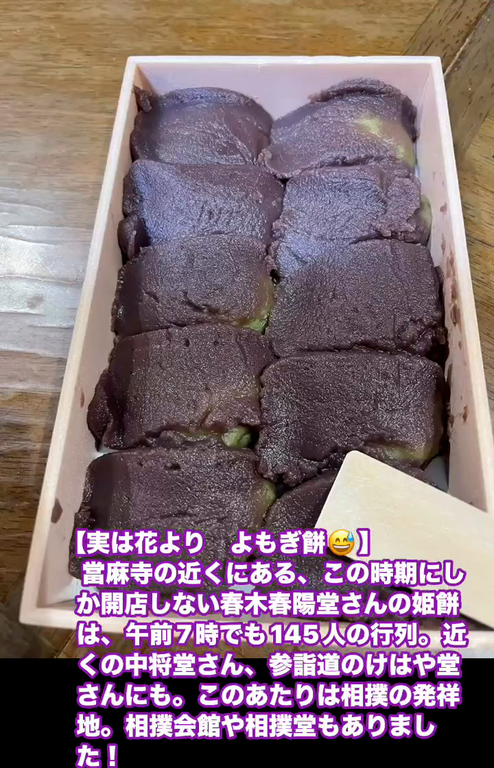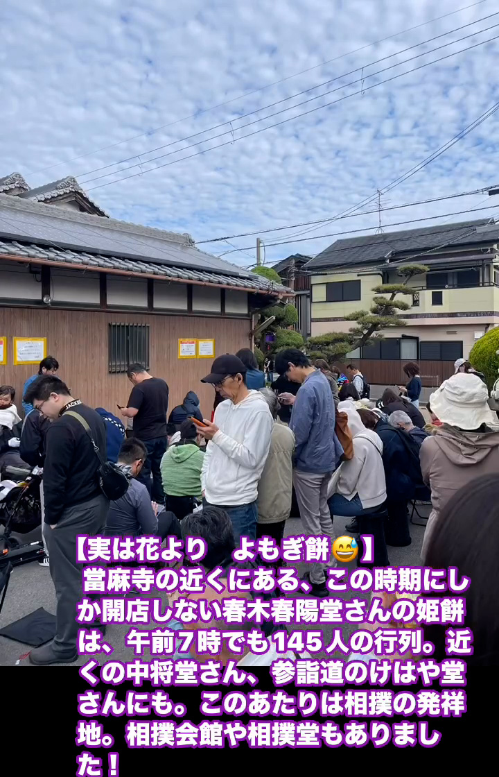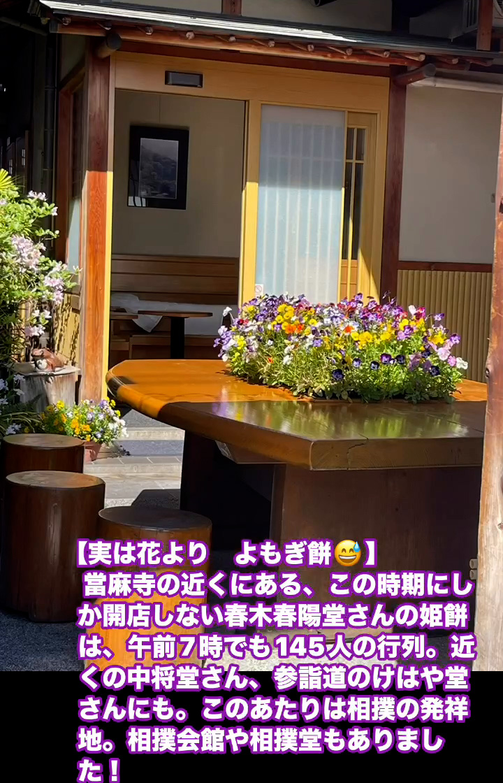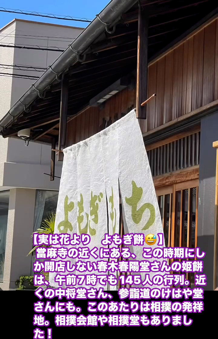 実は花より よもぎ餅 4月24日 Posted on 2026年4月24日 08:47:002026年4月24日 當麻寺の近くにある、この時期にしか開店しない春木春陽堂さんの姫餅は、午前7時でも145人の行列。近くの中将堂さん、参詣道のけはや堂さんにも。このあたりは相撲の発祥地。相撲会館や相撲堂もありました! のりこの活動日記, のりこの部屋