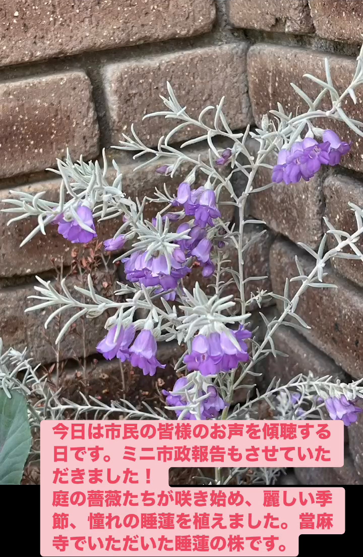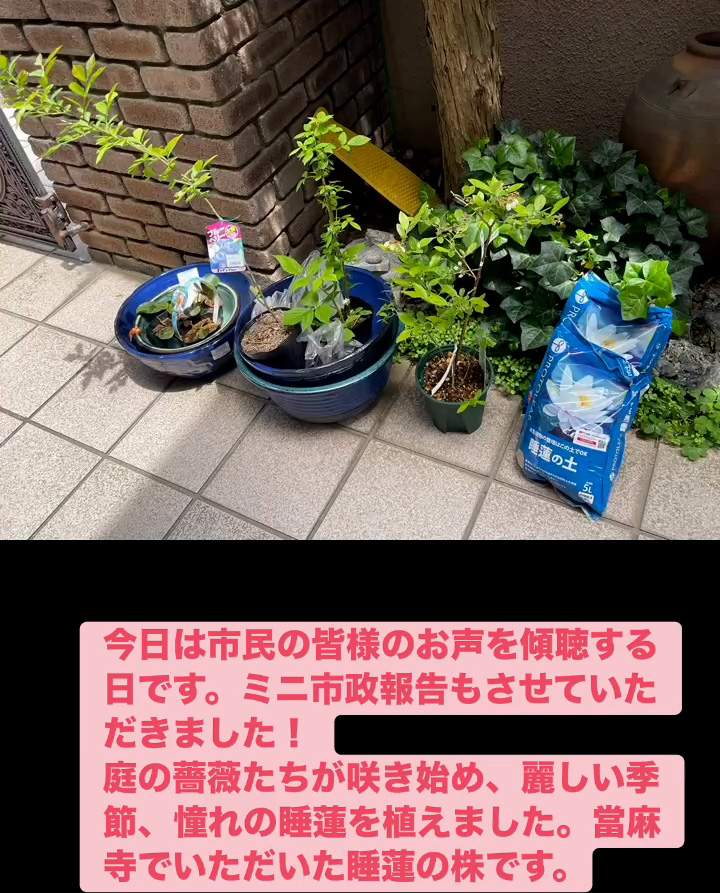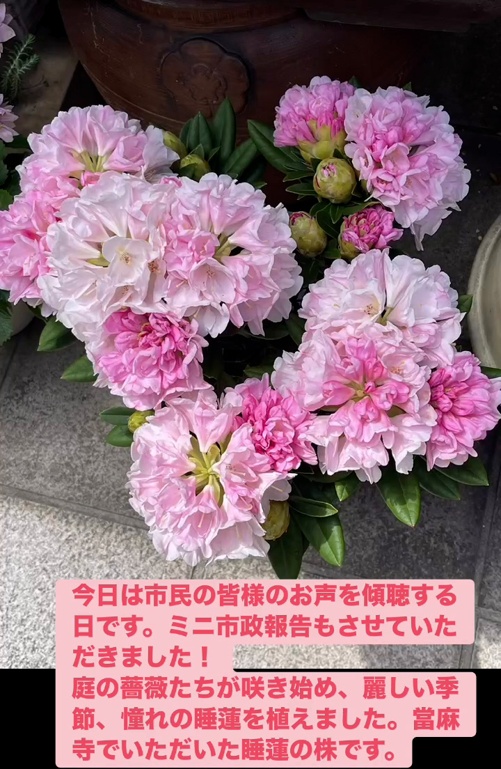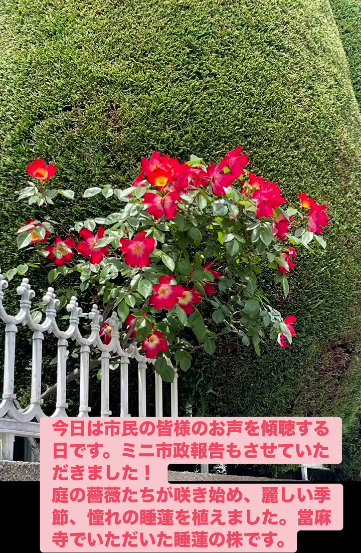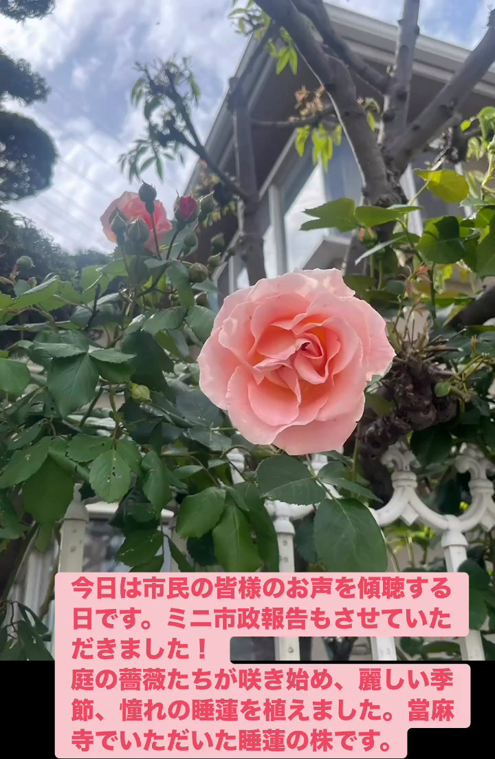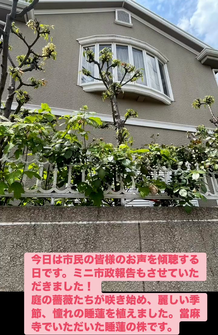 お声を傾聴 4月25日 Posted on 2026年4月25日 22:02:002026年4月27日 今日は市民の皆様のお声を傾聴する日です。ミニ市政報告もさせていただきました! 庭の薔薇たちが朕き始め、 麗しい季節、 憧れの睡蓮を植えました。當麻寺でいただいた睡蓮の株です。 のりこの活動日記