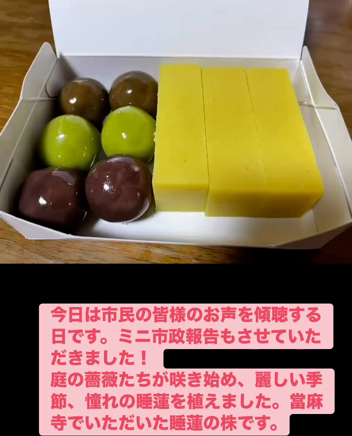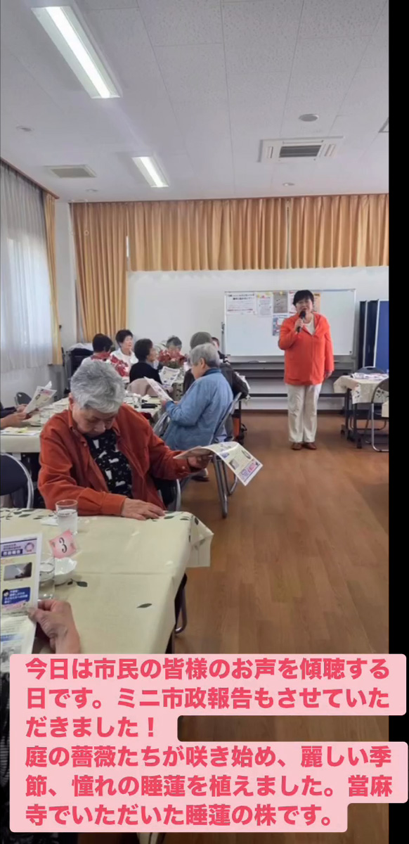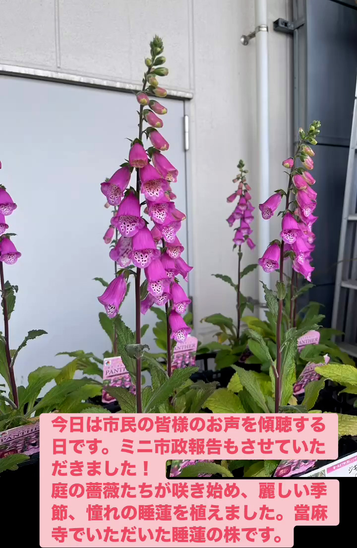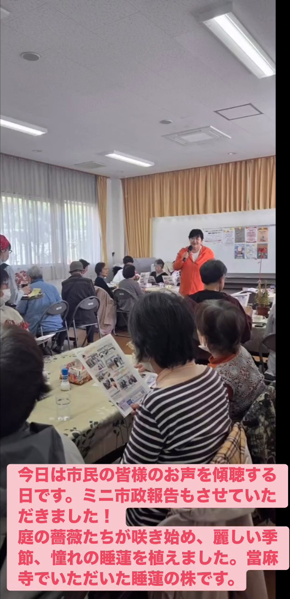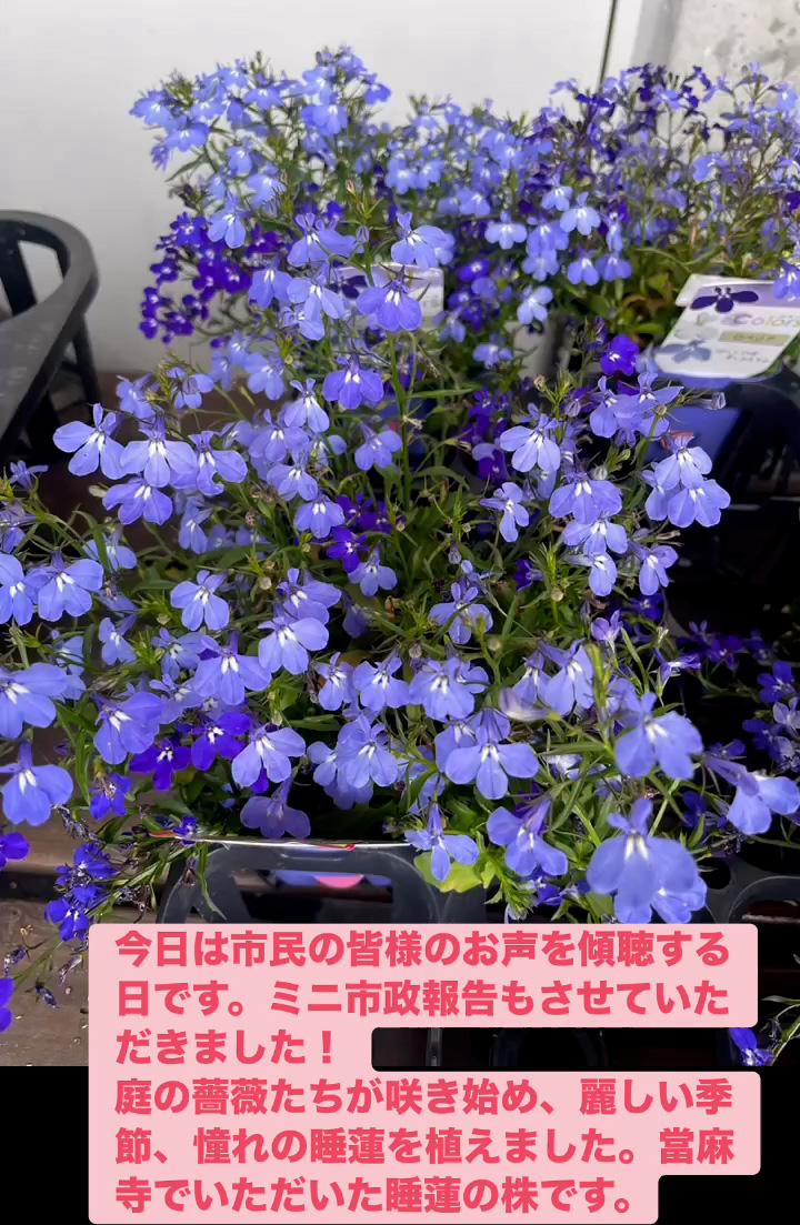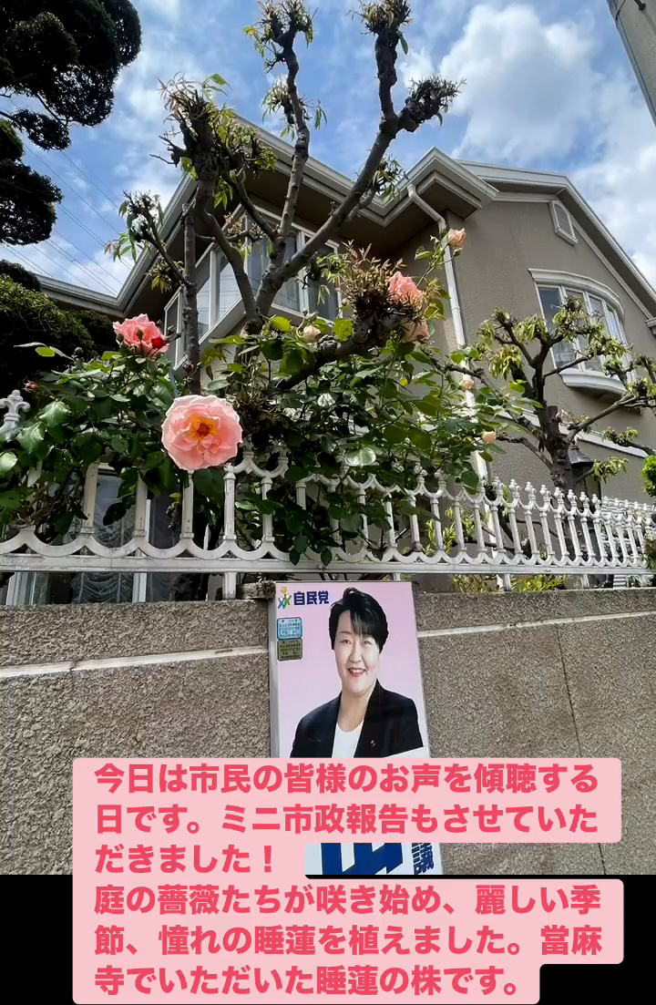 お声を傾聴 4月25日 Posted on 2026年4月25日 22:02:002026年4月27日 今日は市民の皆様のお声を傾聴する日です。ミニ市政報告もさせていただきました! 庭の薔薇たちが朕き始め、 麗しい季節、 憧れの睡蓮を植えました。當麻寺でいただいた睡蓮の株です。 のりこの活動日記